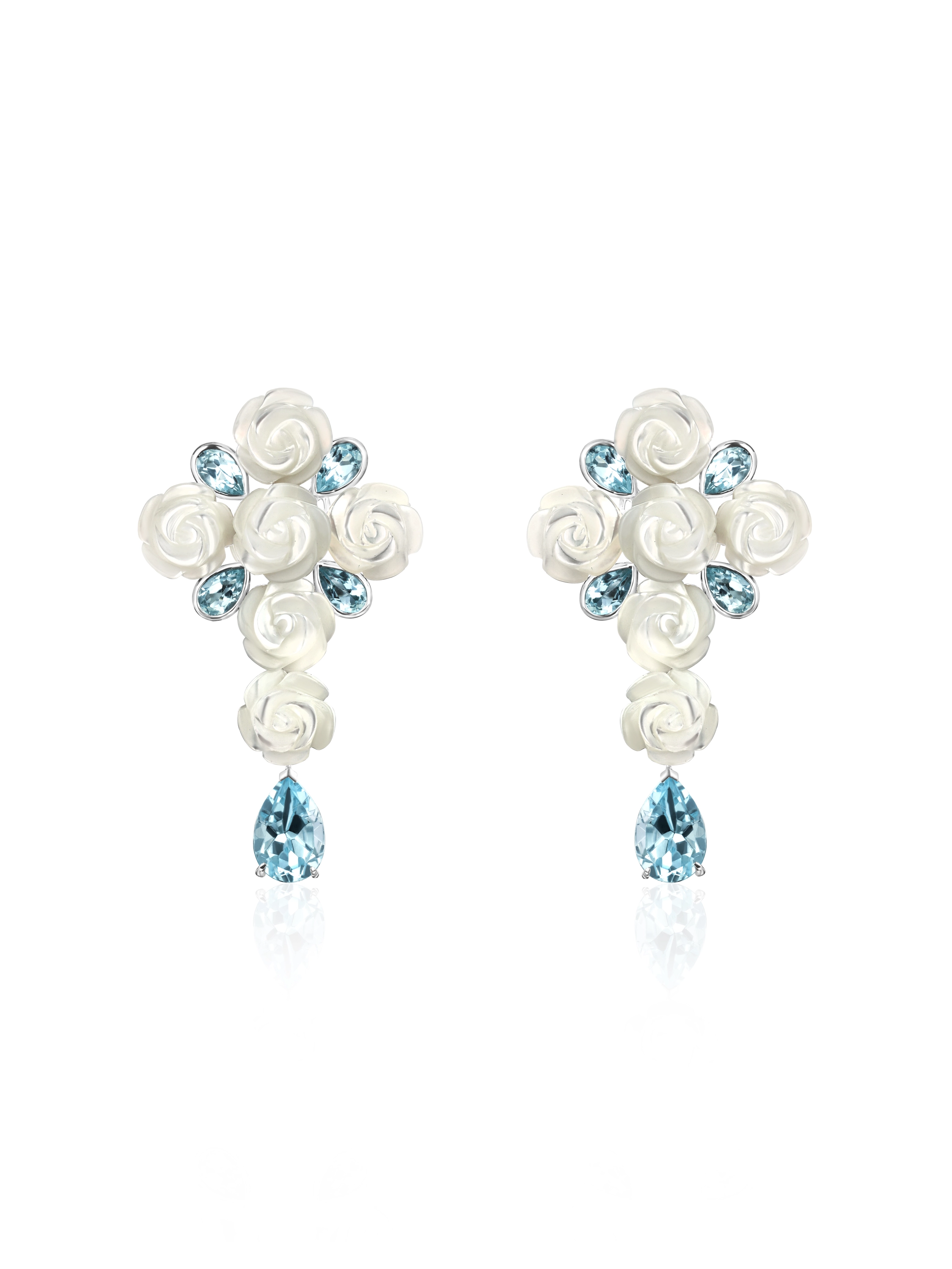 Earrings in white gold with 12 carved mother-of-pearl roses with a total weight of 3.72 g, 8 pear-cut topazes with a total weight of 1.90 ct, and 2 pear-cut topazes with a total weight of 3.10 ct. Weight: 12.93 g. Length: 4 cm.