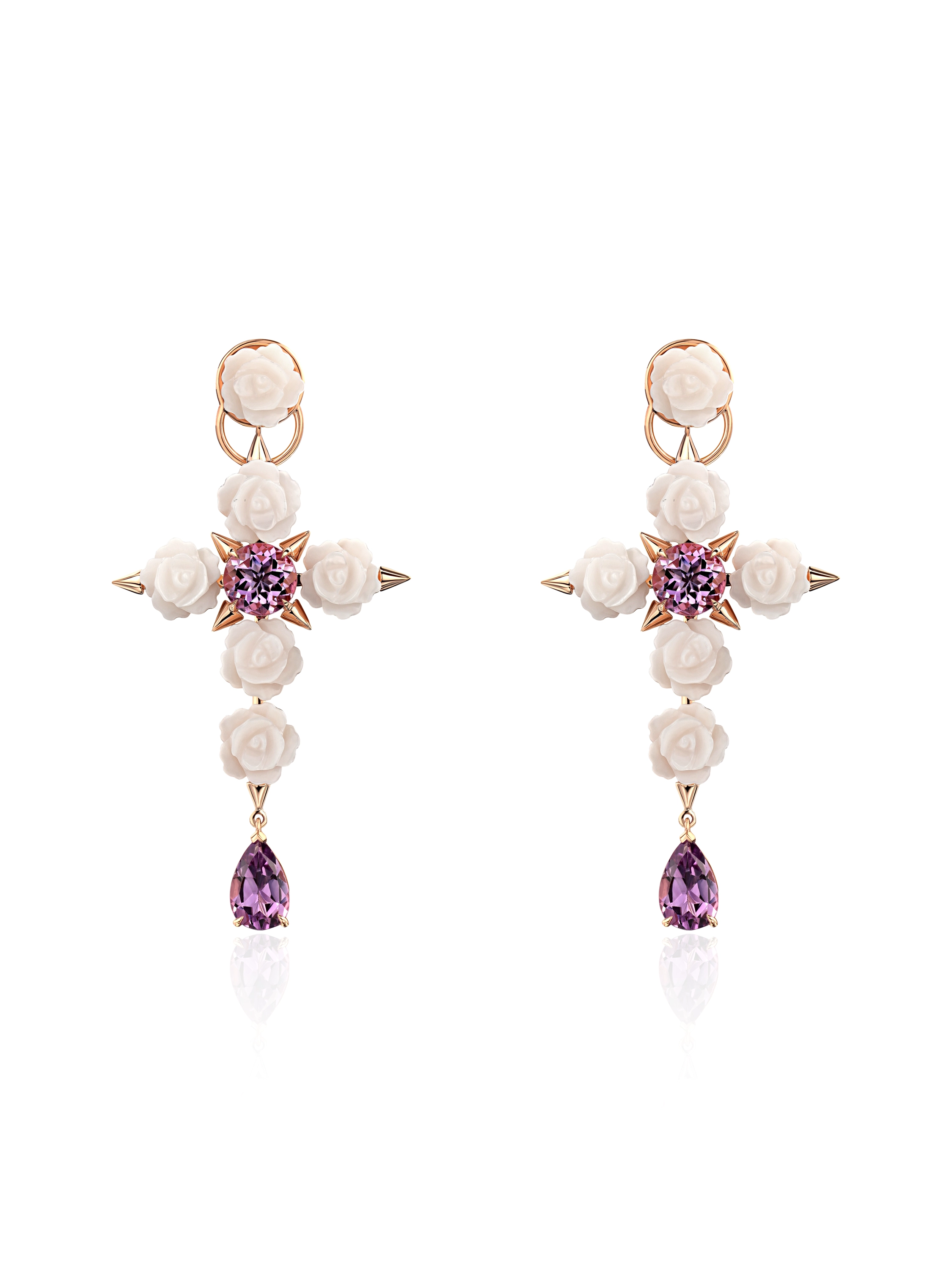 Cross-shaped earrings in rose gold with 12 carved mother-of-pearl roses with a total weight of 15 ct, 2 round-cut amethysts with a total weight of 2.45 ct, and 2 pear-cut amethysts with a total weight of 1.95 ct. Weight: 11.32 g. Length: 5.5 cm.