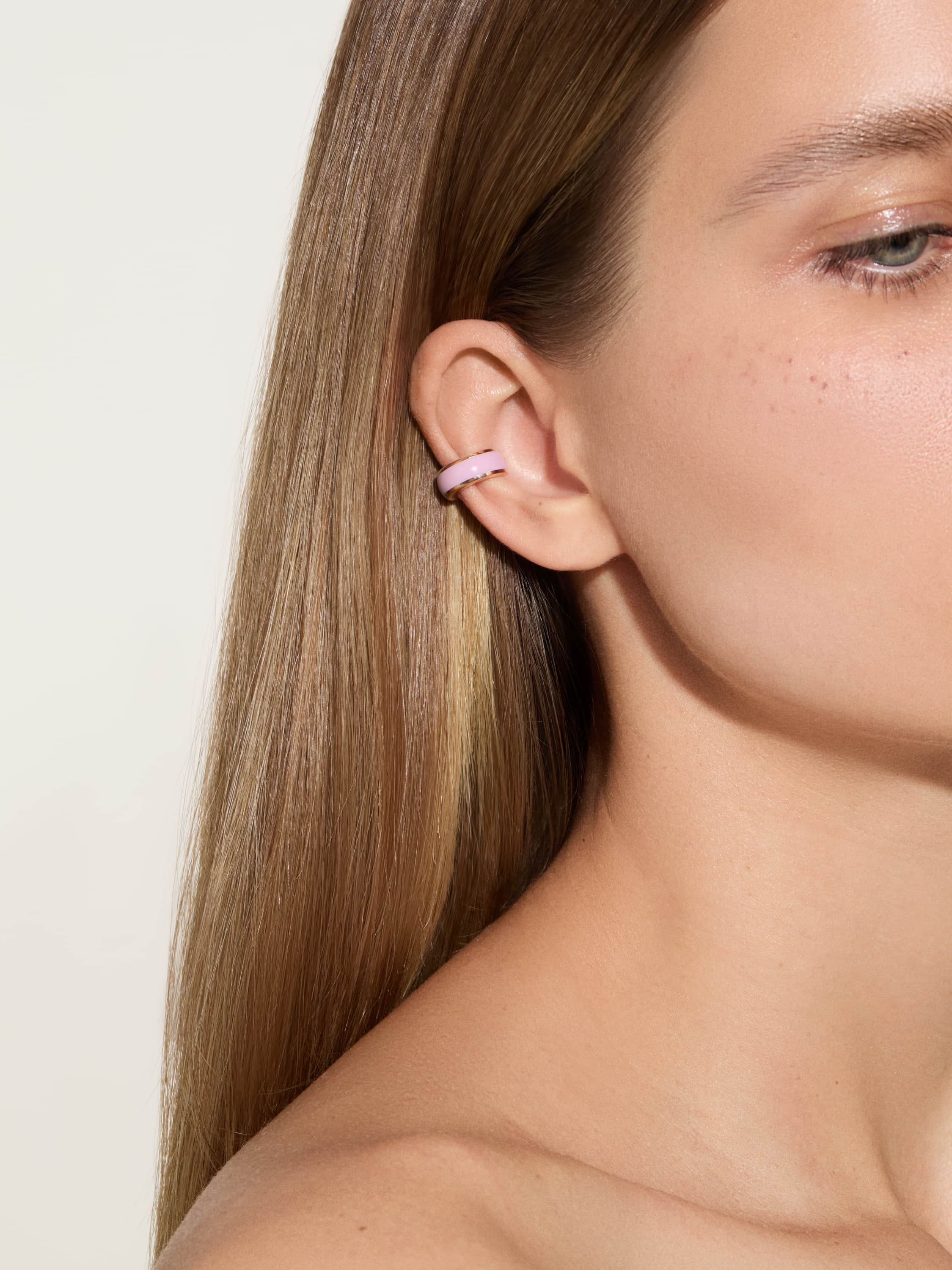 Wide 14K rose gold ear cuff with Sakura shade enamel.