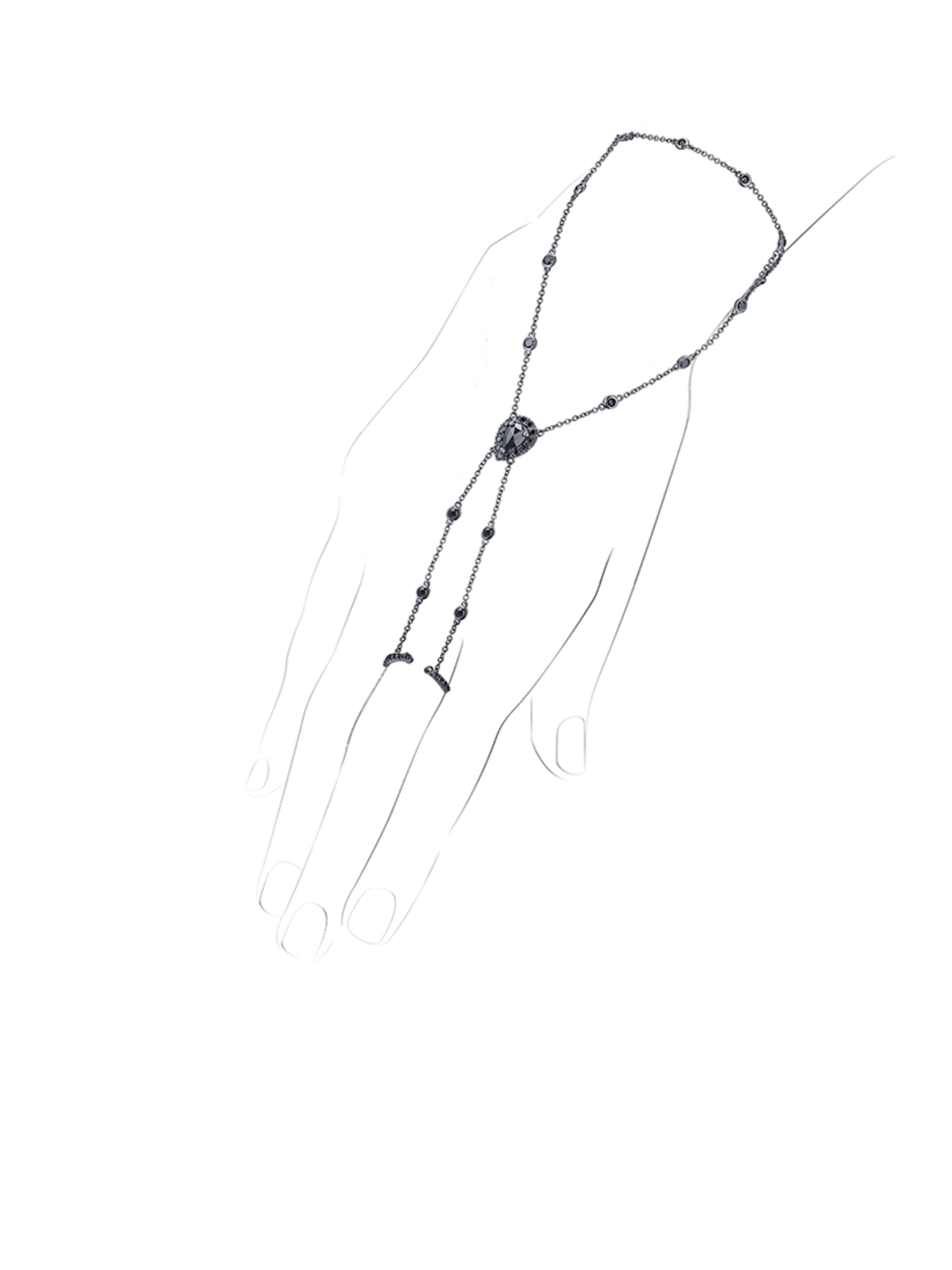 Oxidized gold slave bracelet with a 0.41 ct pear-cut black diamond and 76 round-cut black diamonds weighing 1.62 ct.