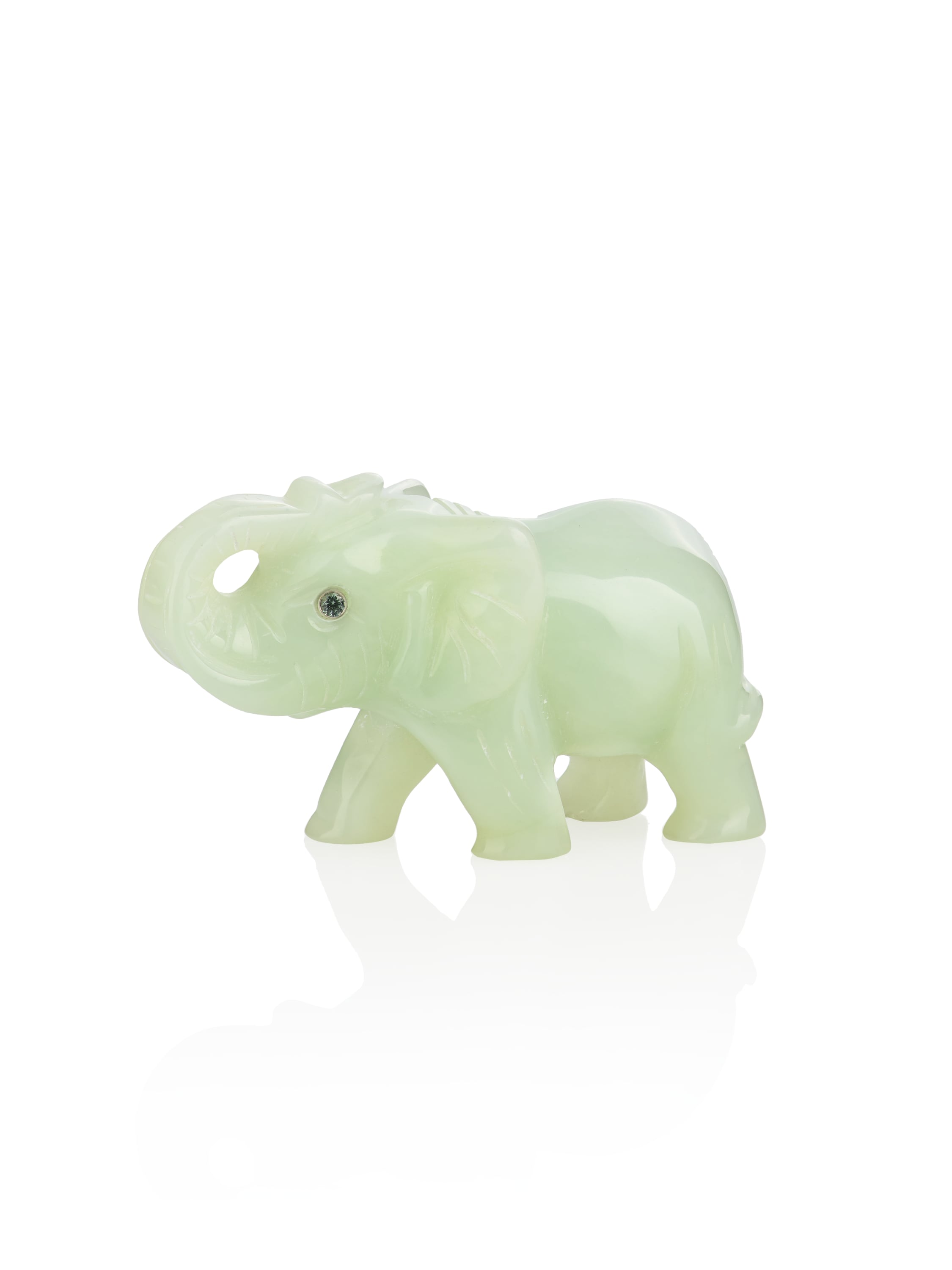 A figurine in the shape of an elephant made of green jadeite weighing 32.58 g with 2 green sapphires weighing 0.10 ct.