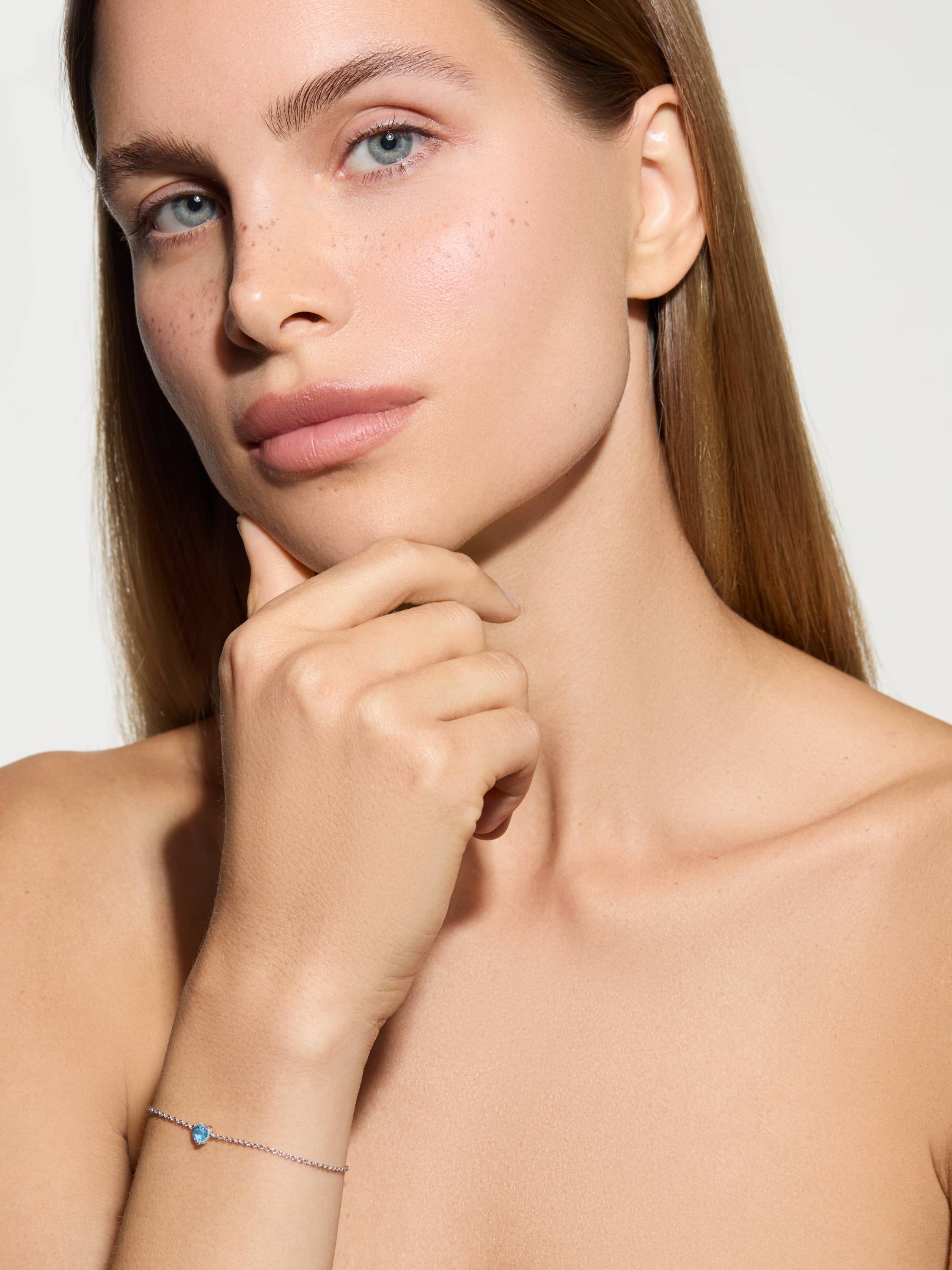 A delicate chain bracelet is made of 585 white gold and complemented with a Swiss Blue topaz in a Heart cut weighing 0.57 ct.