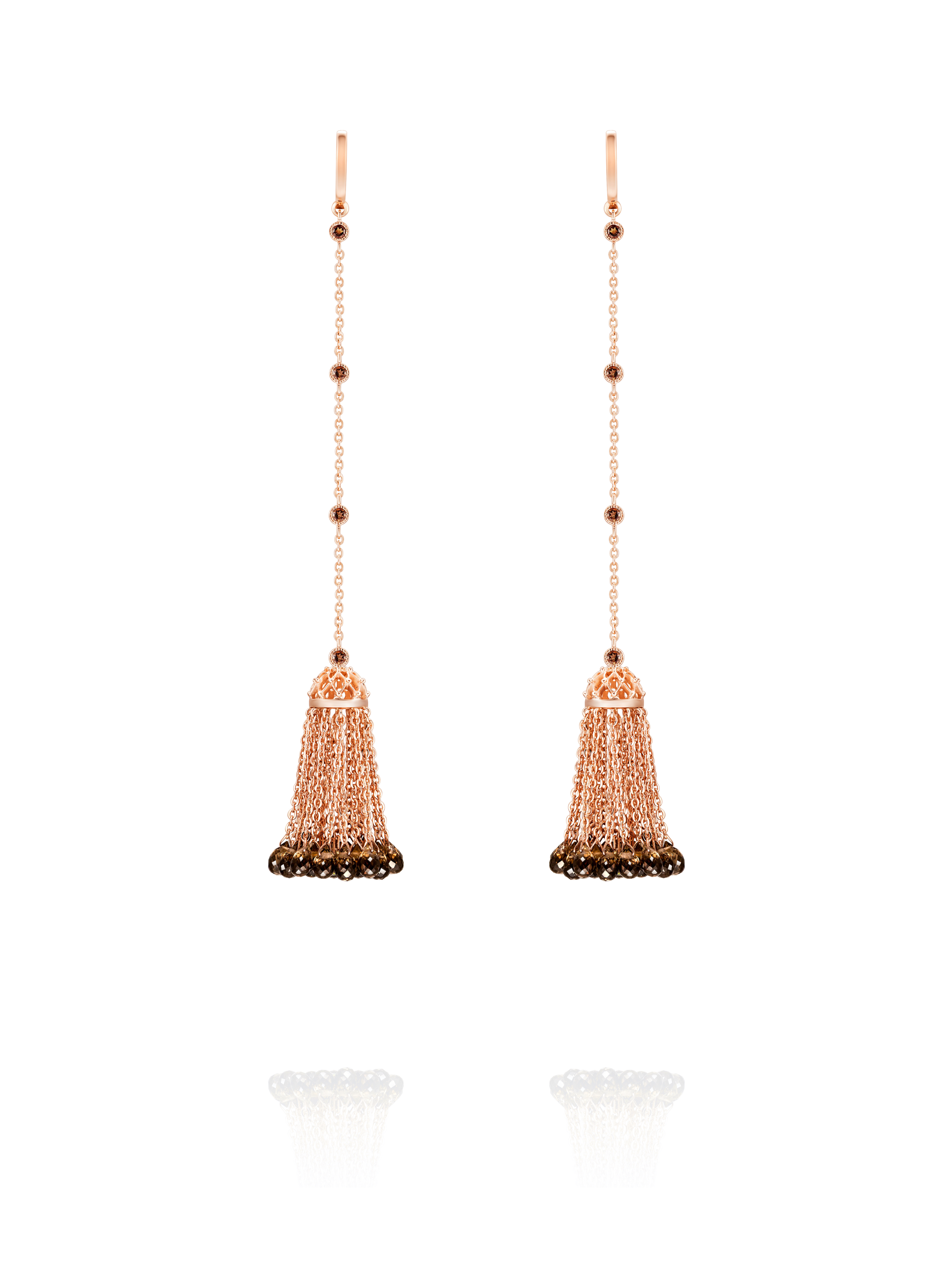 Short tassel earrings in 585 rose gold, inlaid with round-cut smoky quartz weighing 0.27 ct and briolette-cut smoky quartz with a total weight of 13.99 ct. Item length – 10 cm.