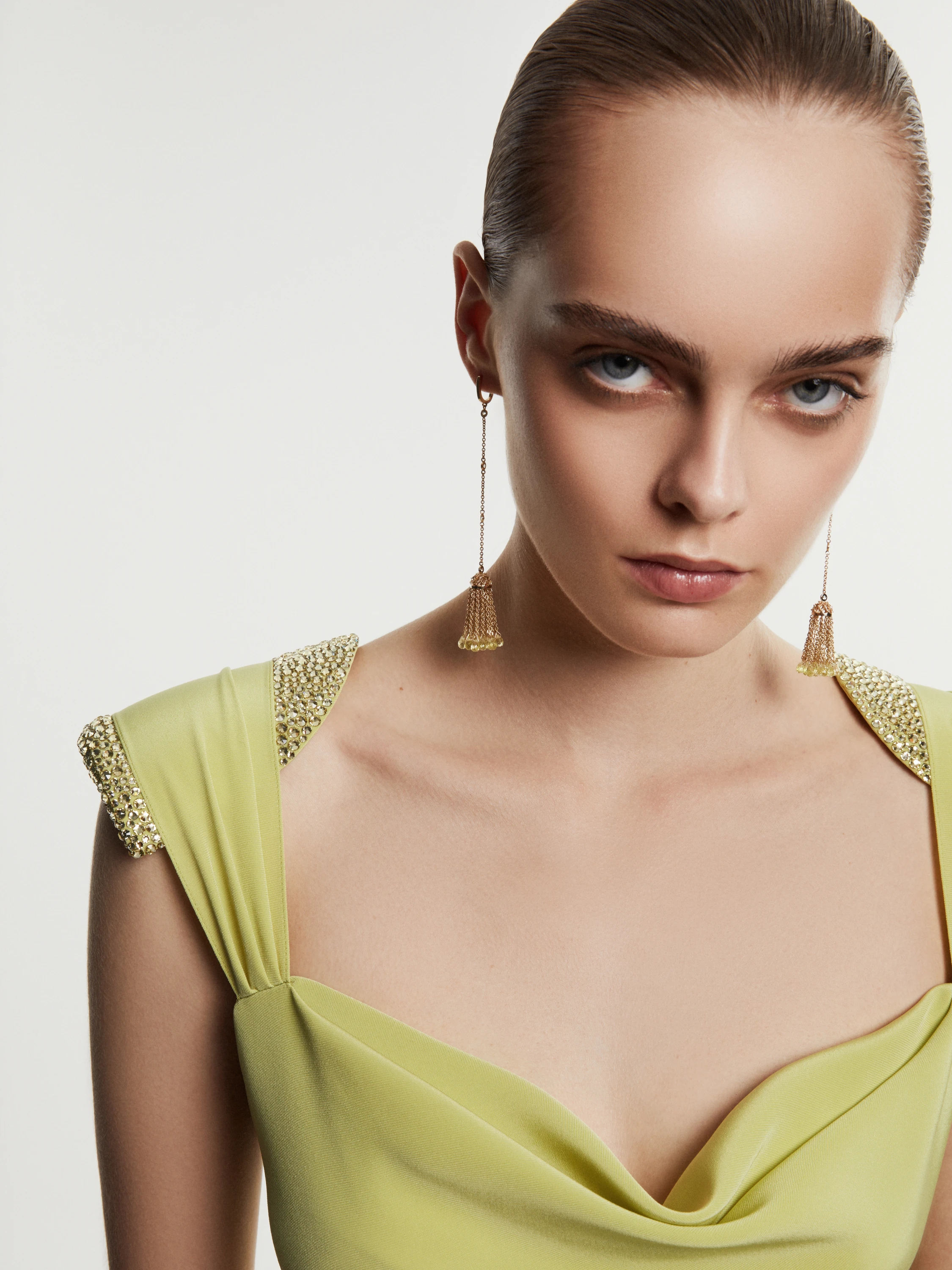 Short tassel earrings in yellow gold with 50 briolette-cut lemon quartzes with a total weight of 14.69 ct and 8 colorless topazes with a total weight of 0.33 ct. Item length – 10 cm.