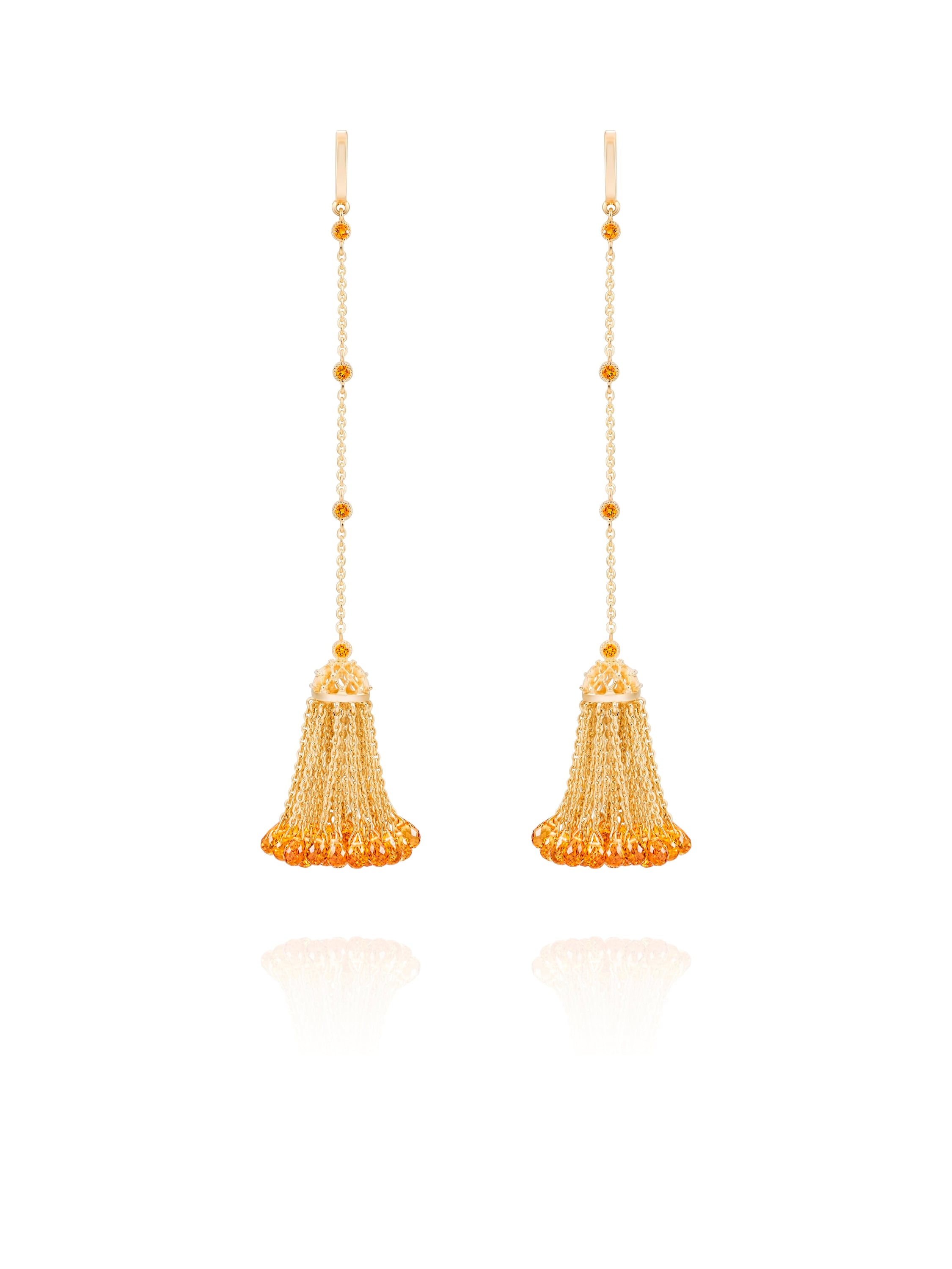 Short tassel earrings 10 cm long, made of 585 yellow gold and inlaid with 8 round-cut citrines weighing 0.24 ct and 50 briolette-cut citrines with a total weight of 13.50 ct. Item length – 10 cm.