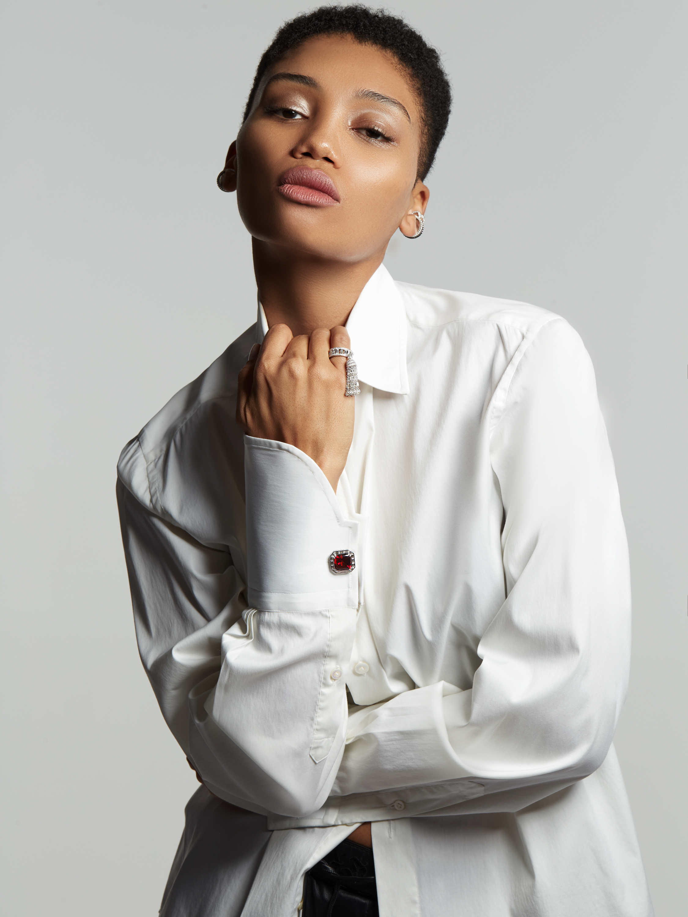 Cufflinks in white gold with 2 garnets with a total weight of 32.27 ct and 108 baguette-cut diamonds with a total weight of 7.32 ct.