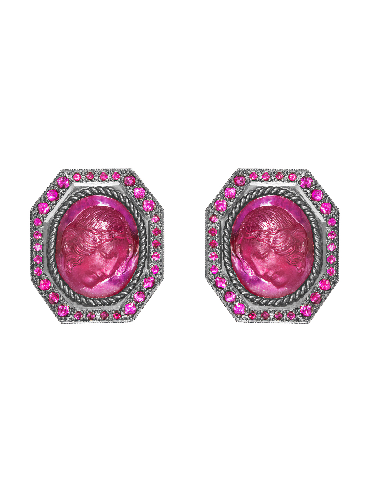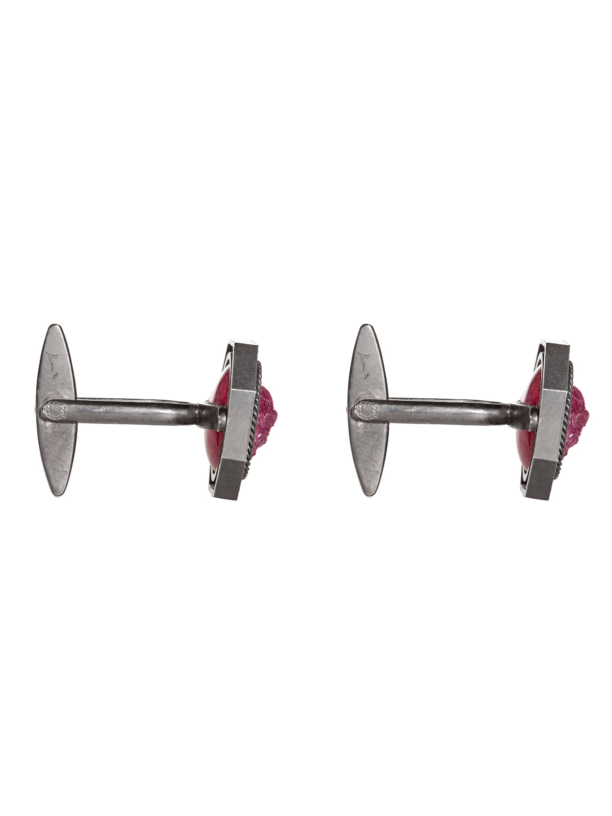 Blackened gold cufflinks with 36 round rubies with a total weight of 0.66 ct and 2 cameos on ruby weighing 4.71 g.