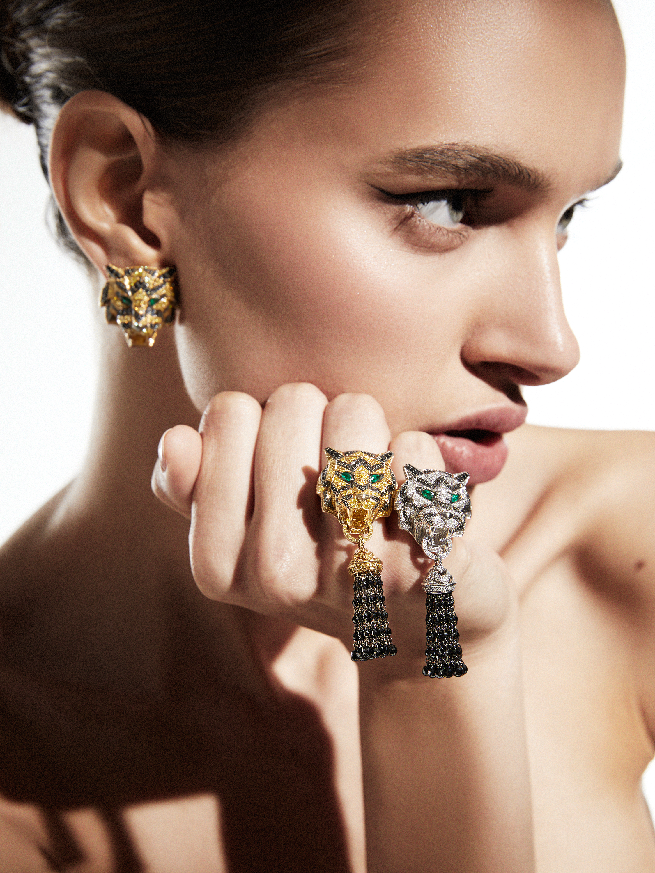 Gold stud earrings in the shape of tigers, inlaid with 152 round-cut black diamonds with a total weight of 0.98 ct, 410 round-cut yellow diamonds with a total weight of 2.42 ct and 4 marquise-cut emeralds with a total weight of 0.32 ct.