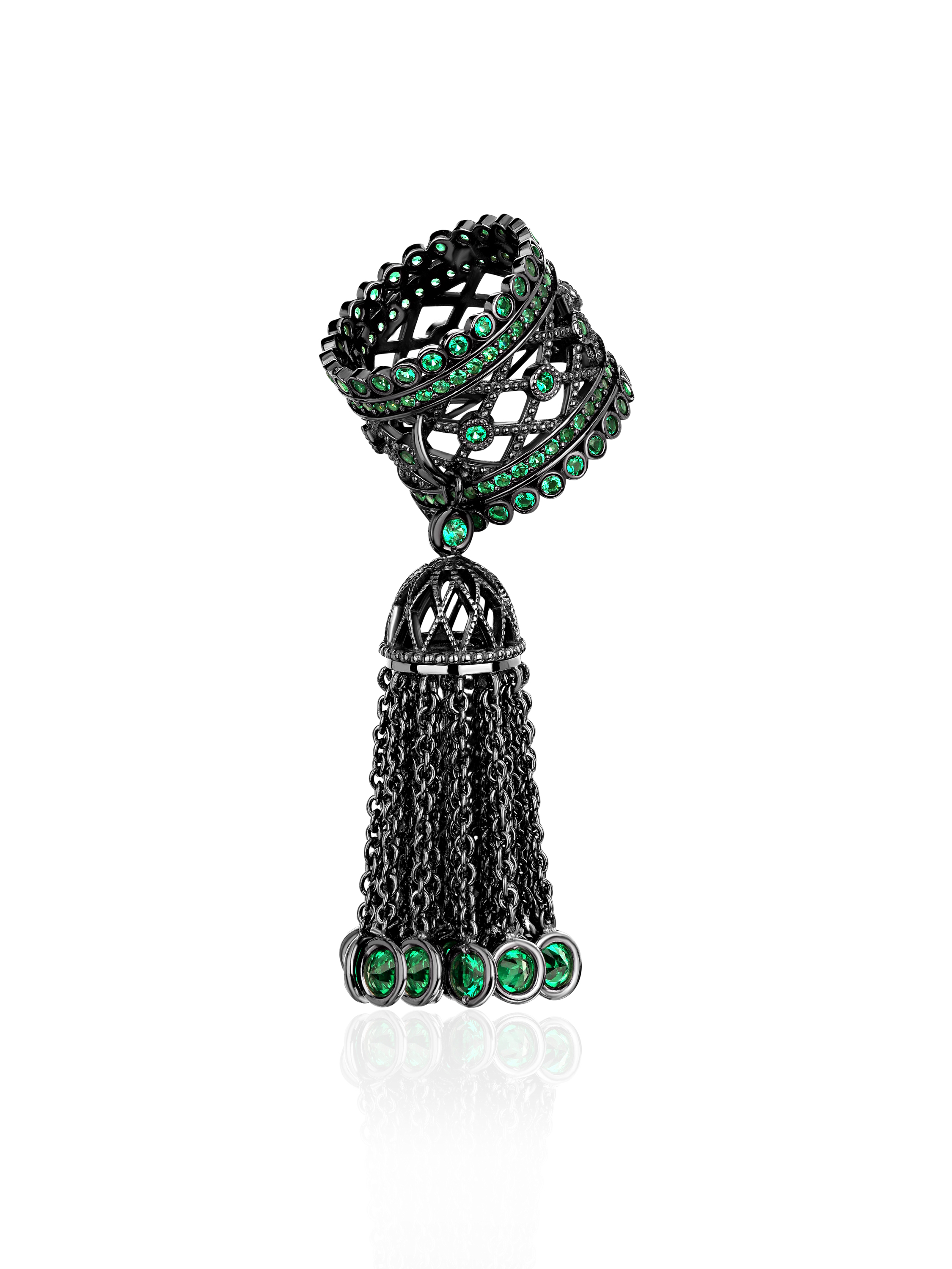 A tassel ring made of oxidized 925 sterling silver with green round-cut cubic zirconia.