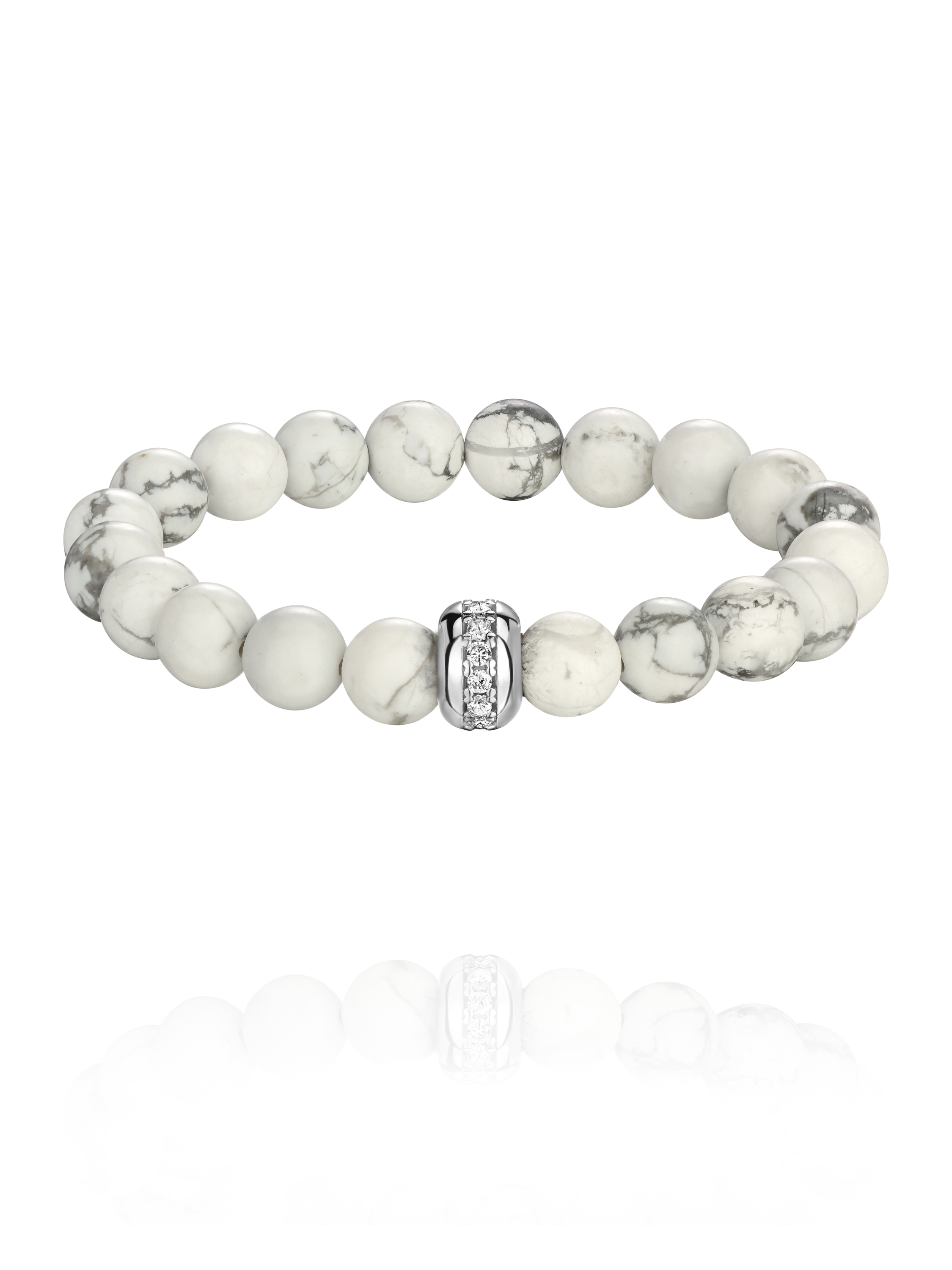 The bracelet is made of 925 sterling silver, 21 cacholong stones and round-cut cubic zirconia. Bead diameter: 8 mm.