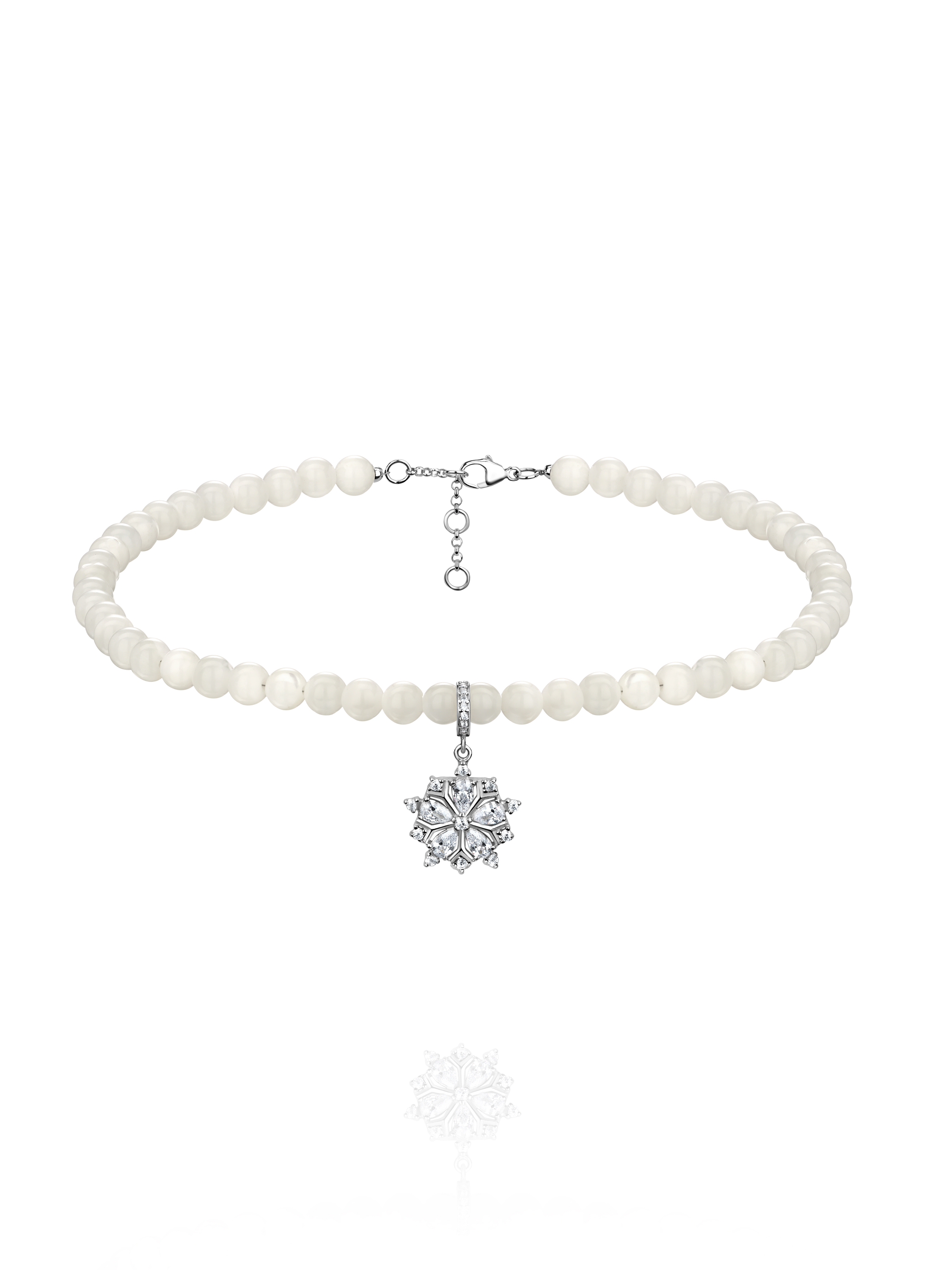 The choker necklace is made of 52 mother-of-pearl beads and complemented by a snowflake pendant in 925 sterling silver with colorless cubic zirconia.
