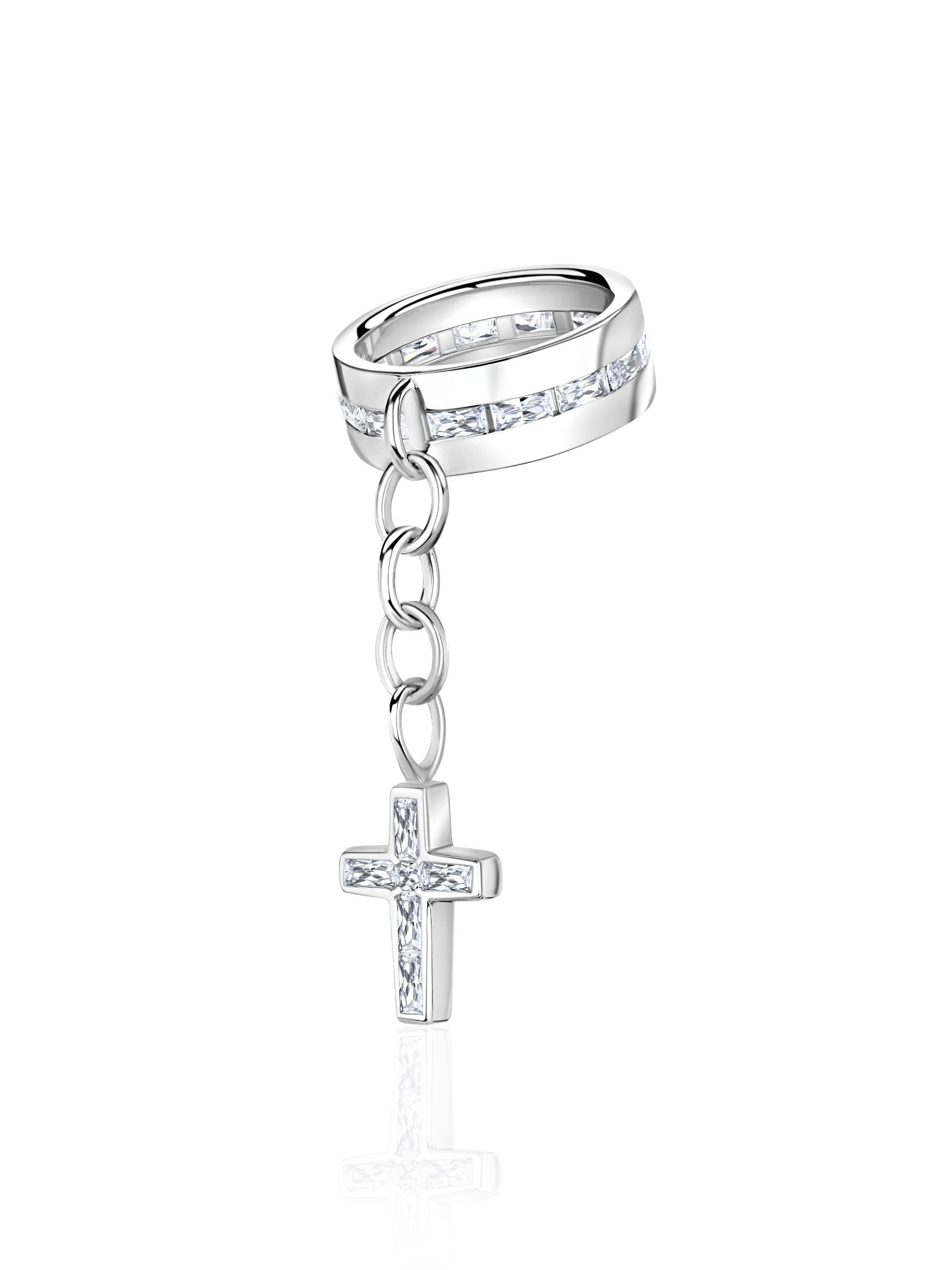 A ring made of 925 sterling silver in the shape of a cross, set with 24 baguette-cut cubic zirconia weighing 0.08 g and 10 princess-cut cubic zirconia weighing 0.06 g.