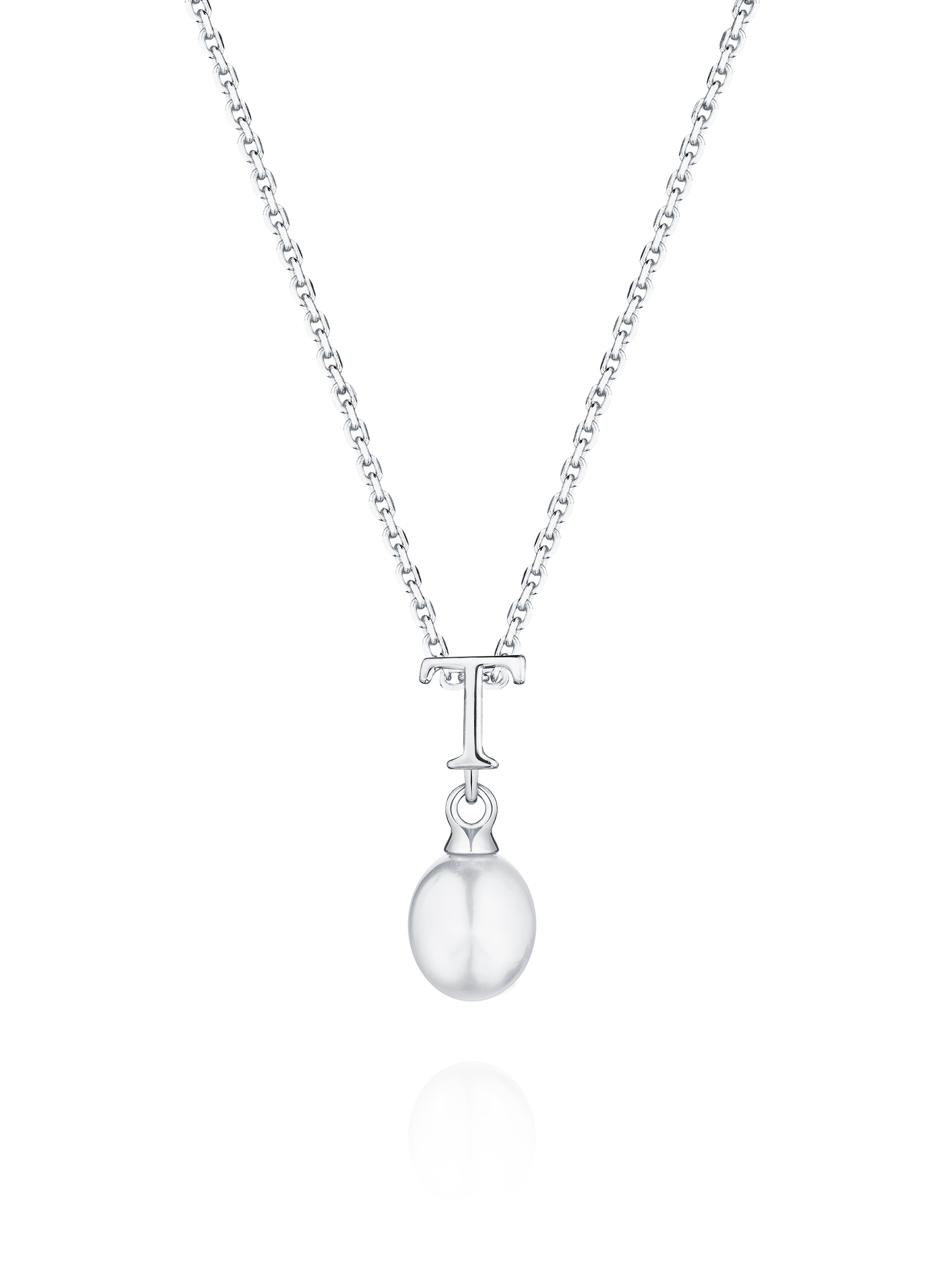 Silver necklace with a pendant with the letter T and a pearl