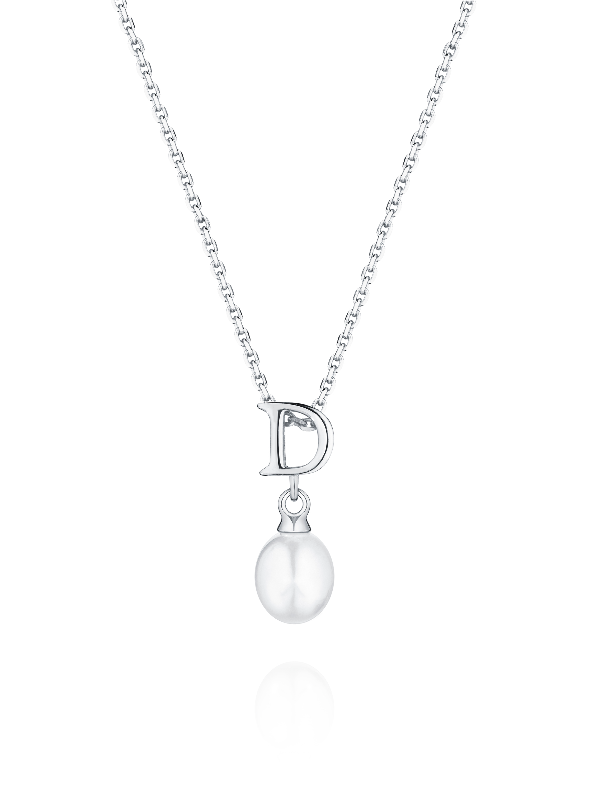 Silver necklace with a pendant with the letter D and a pearl