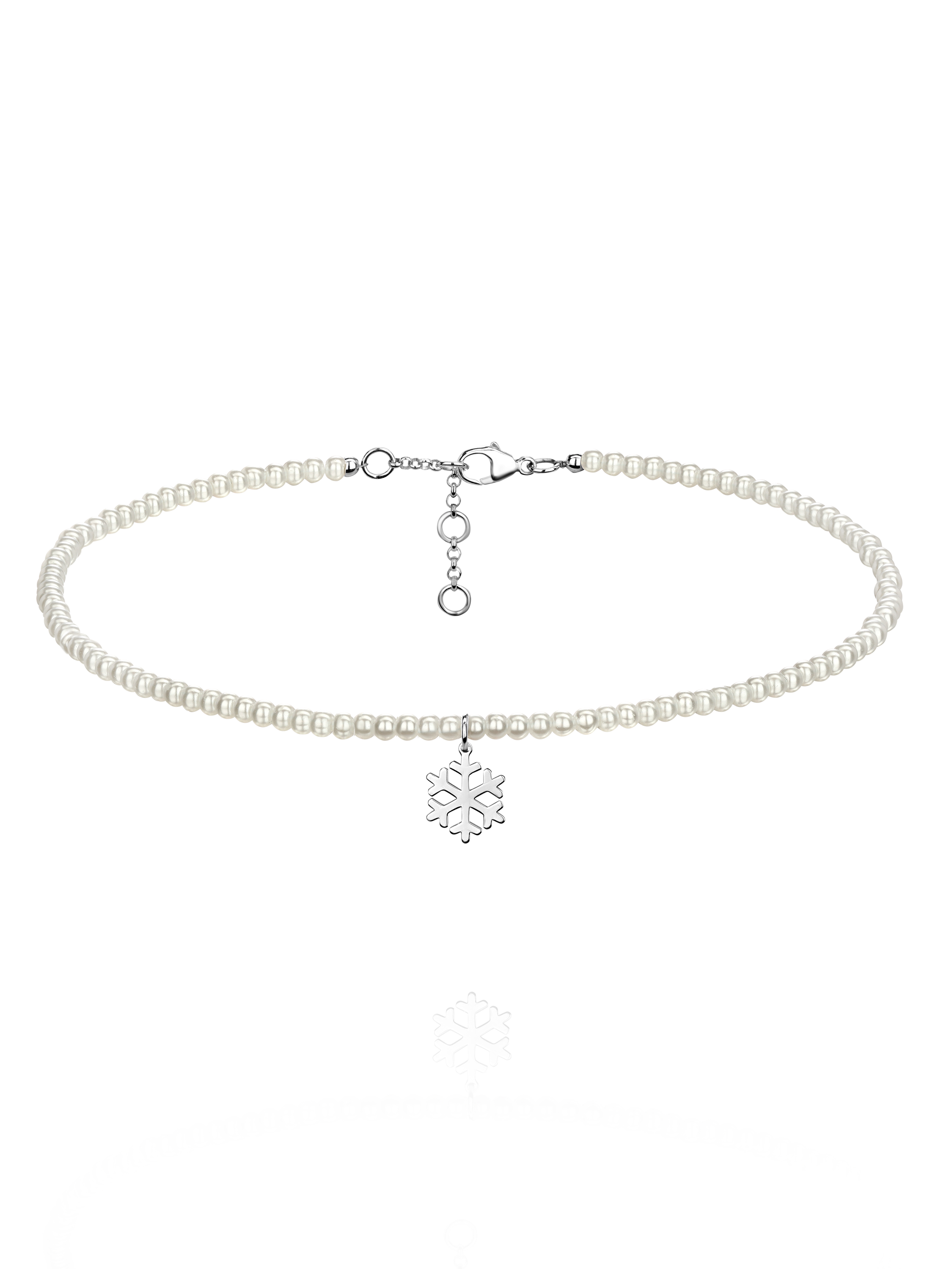 The choker necklace is made of 108 white pearls and is complemented by a snowflake pendant made of 925 sterling silver.
