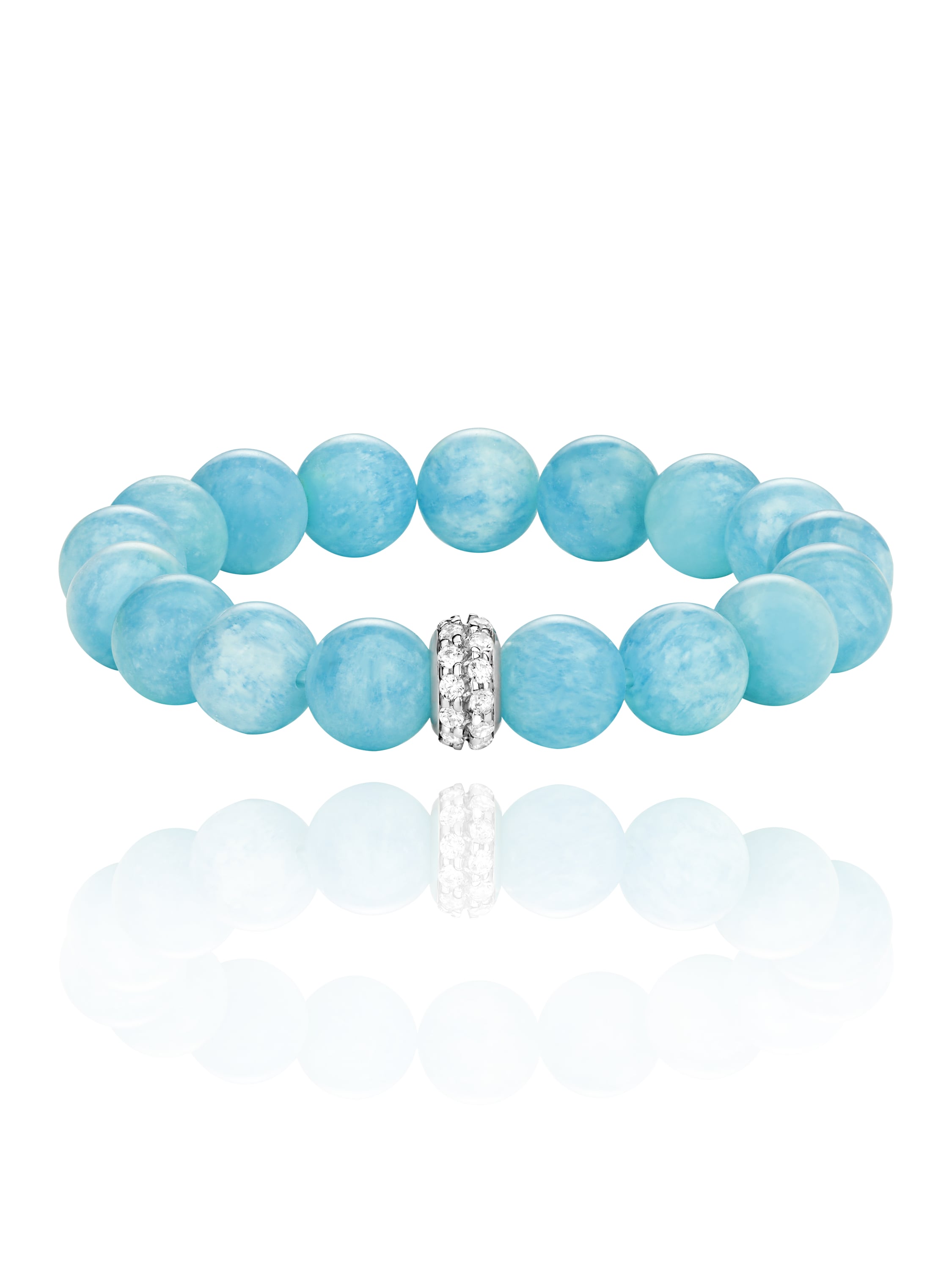 The bracelet is made of 925 sterling silver, 17 amazonite stones and 24 round-cut cubic zirconia. Bead diameter: 8 mm.