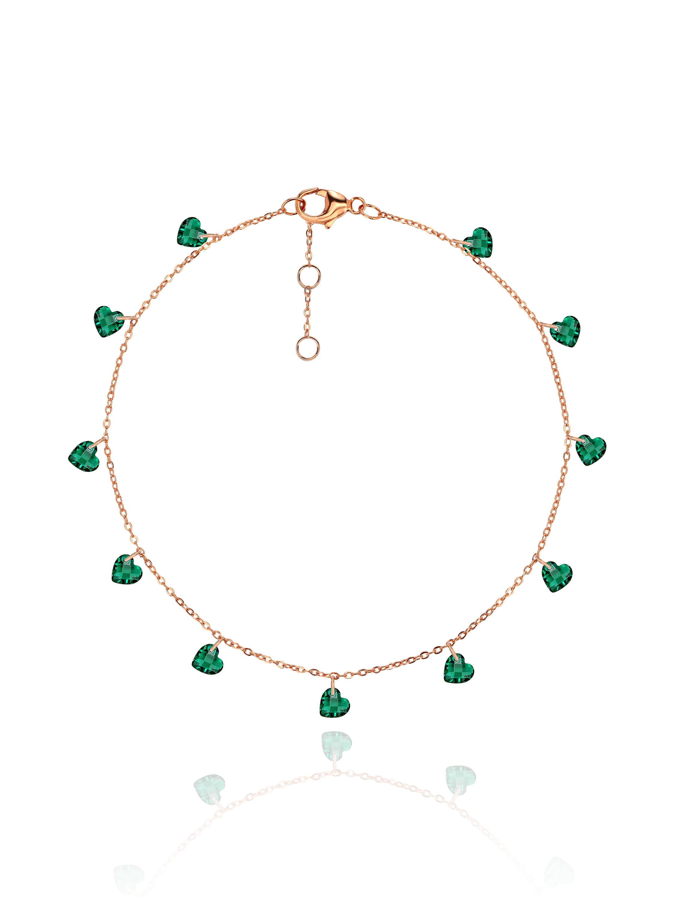 A delicate chain bracelet is made of silver with gilding and complemented by emerald-colored cubic zirconia charms in a Heart cut.