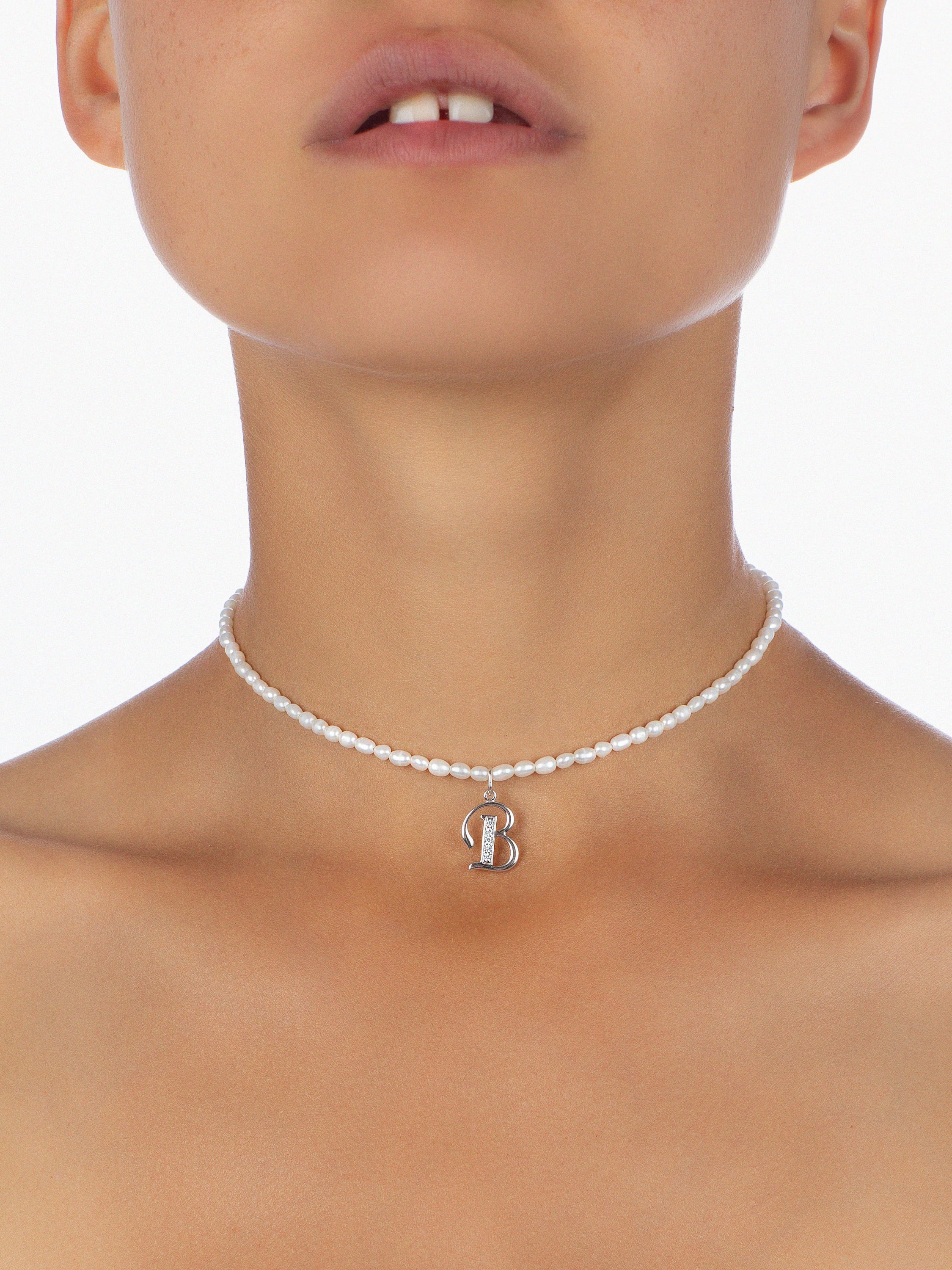 Pearls, Cubic Zirkonia & Silver "B" Letter Choker