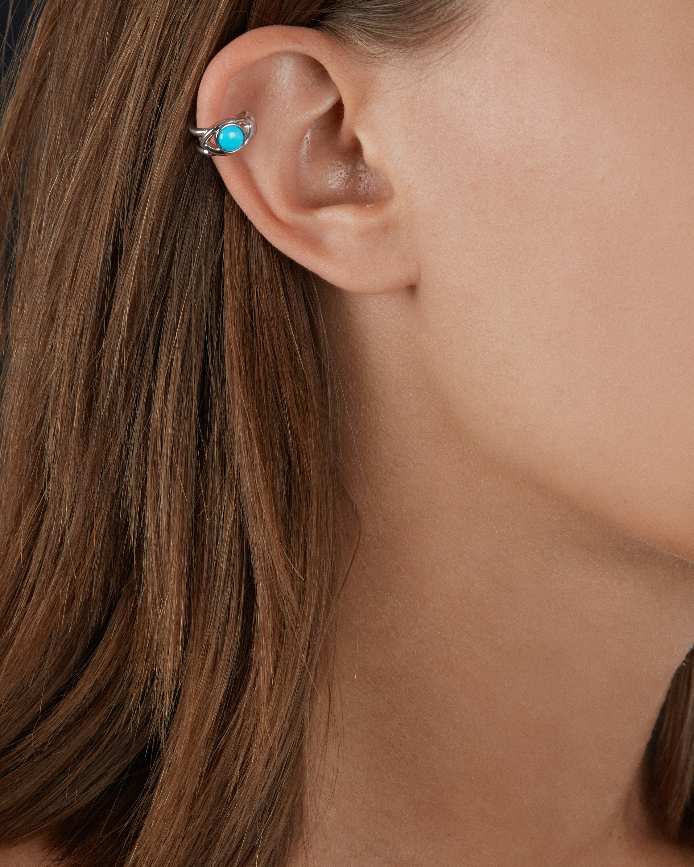 A cuff in the shape of an eye made of 925 sterling silver and turquoise in cabochon cut weighing 0.08 ct. Wear it as a standalone piece or as part of sets with other items.