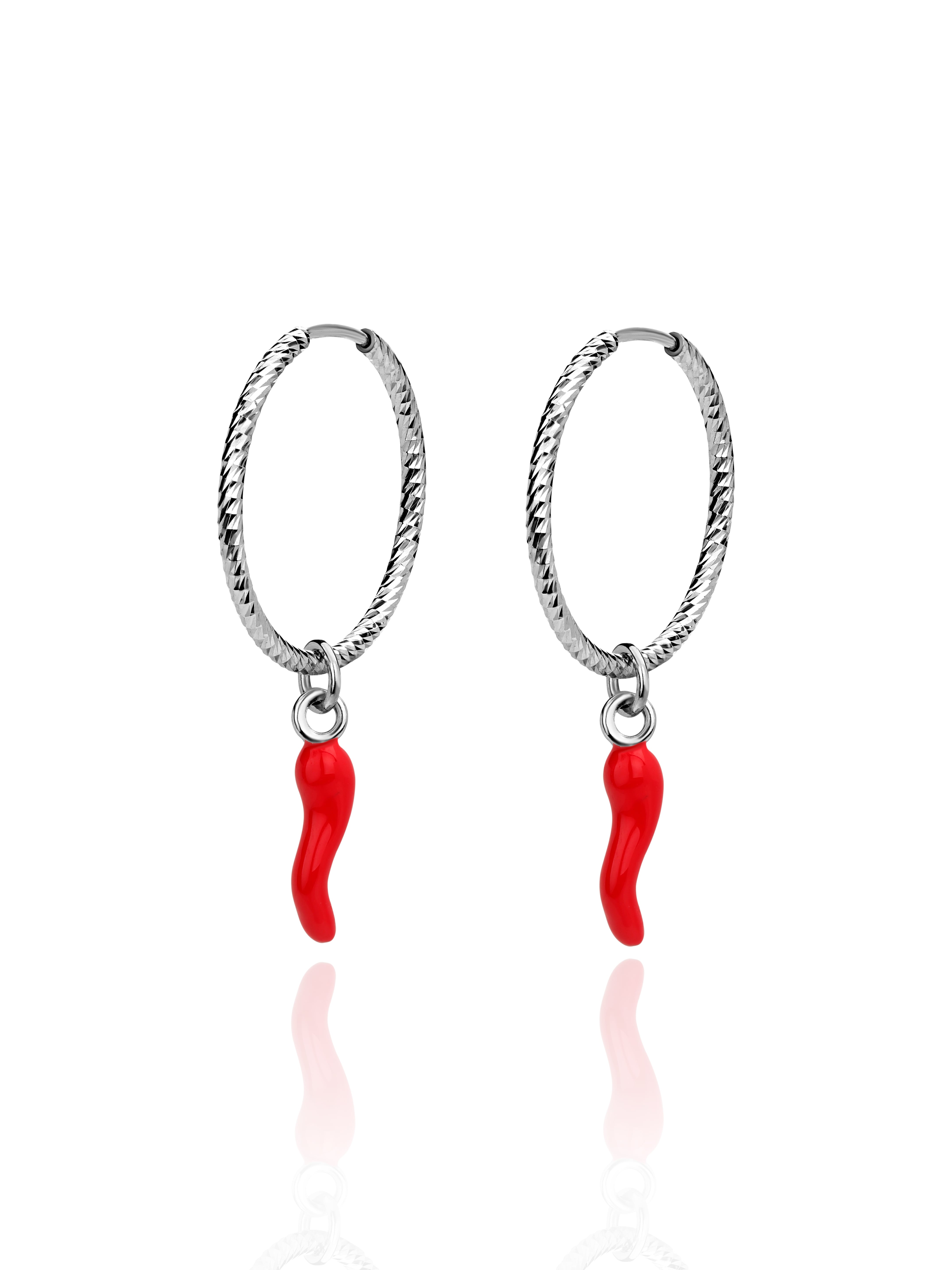 Hoops are made of 925 sterling silver and decorated with red enamel pendants.