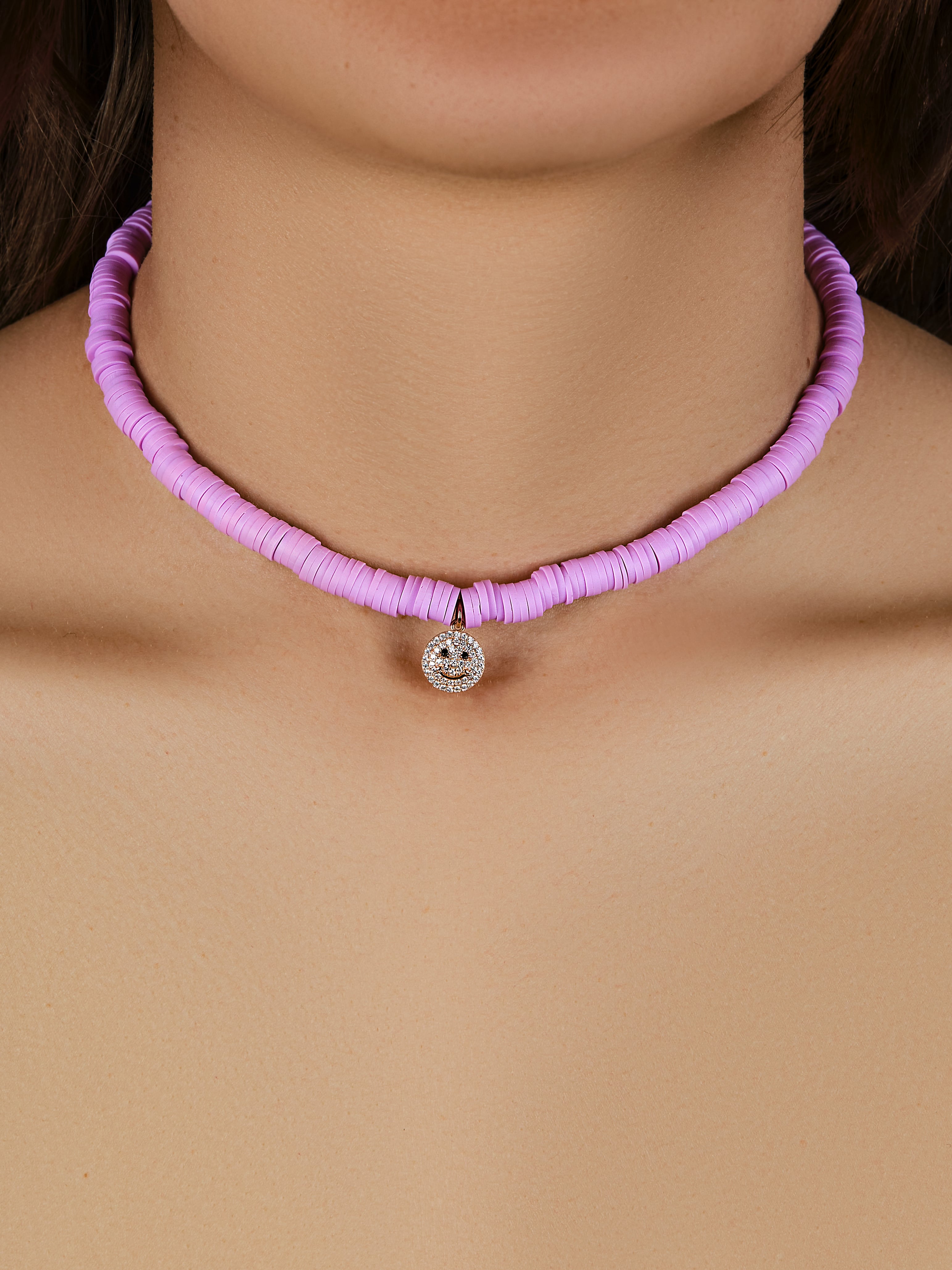 A choker necklace made of rose 925 sterling silver and pink rubber rings, complemented by a round silver pendant with cubic zirconia.