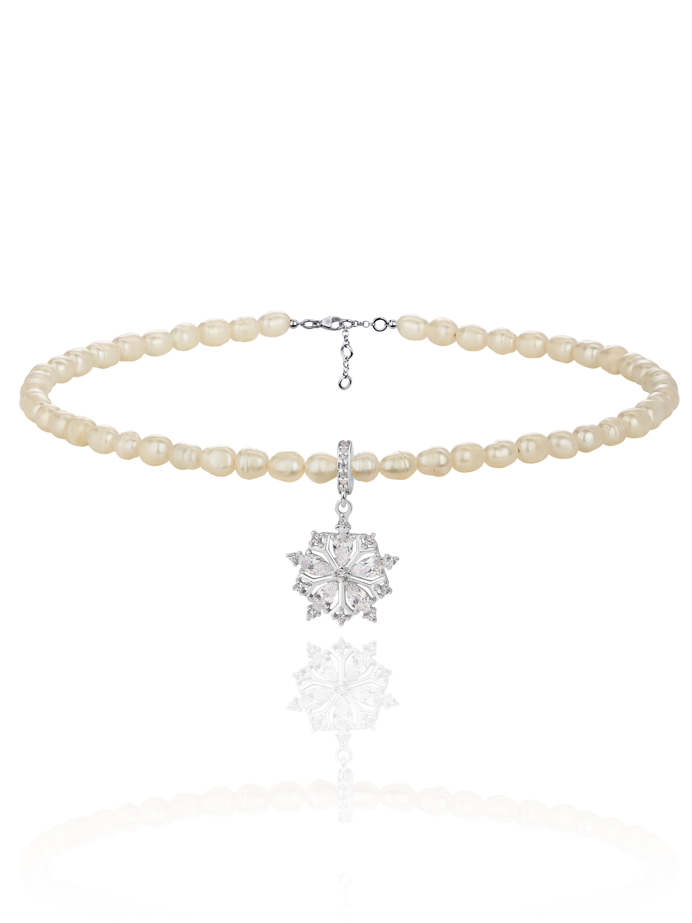 Choker necklace made of white pearls and complemented by a snowflake-shaped pendant in 925 sterling silver and cubic zirconia.