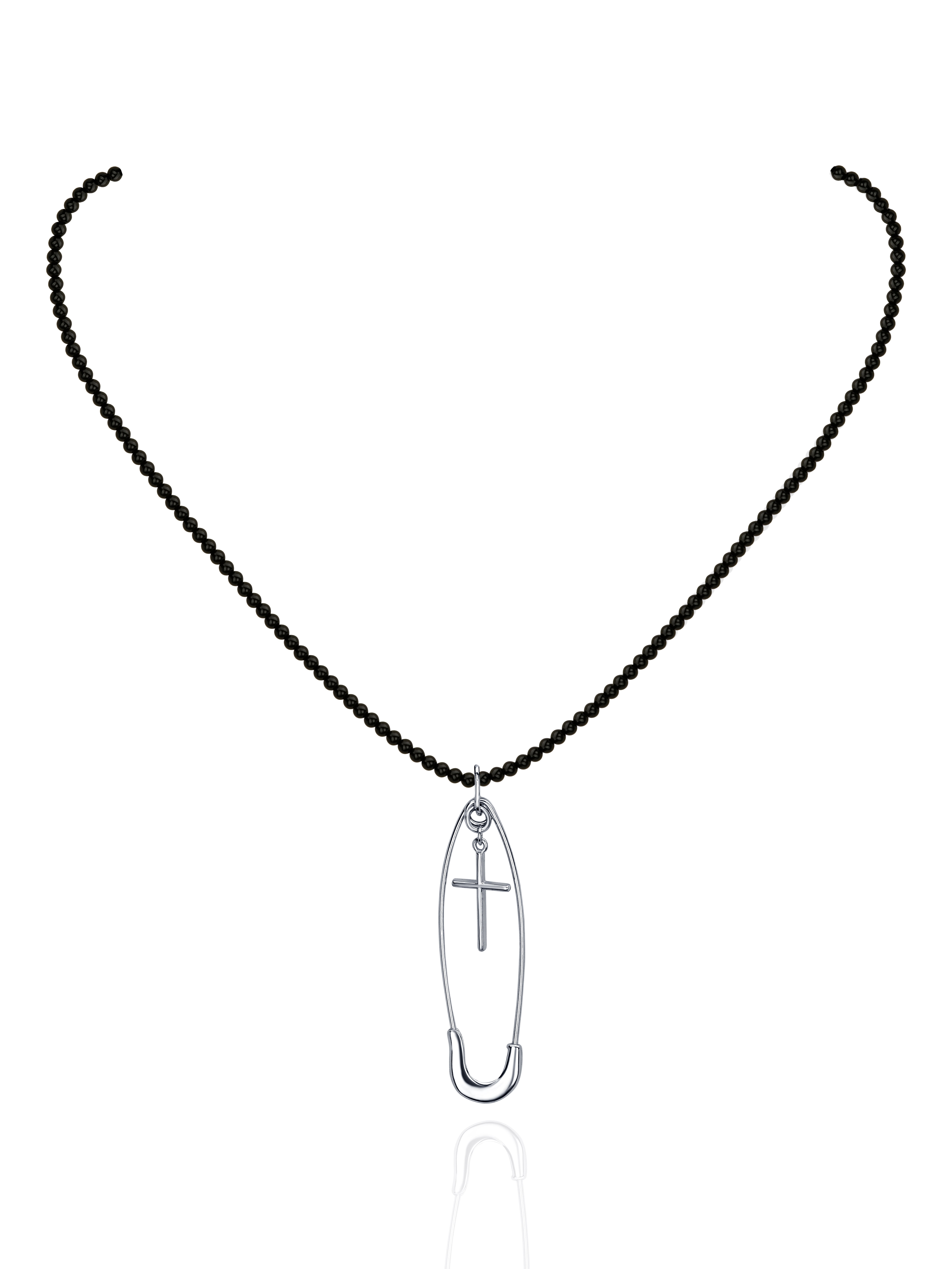 Necklace made of 925 sterling silver and 149 black agates with a safety pin pendant with a cross.