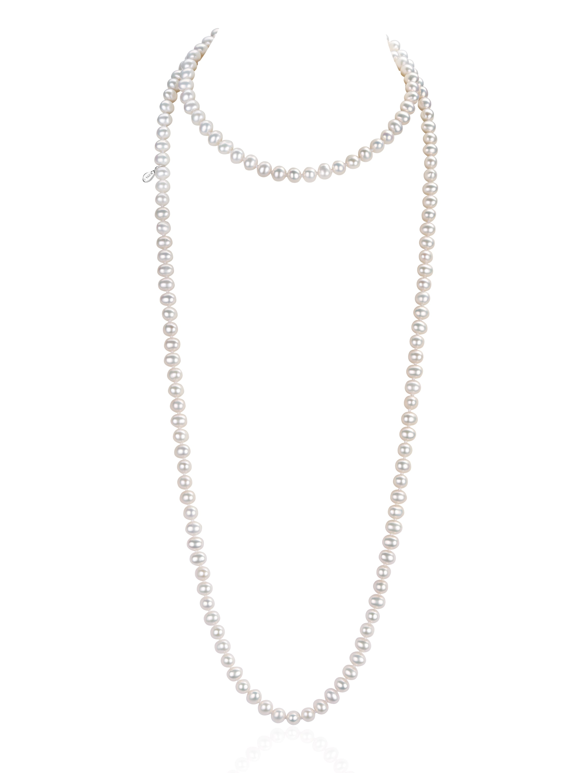 Silver necklace with 190 white pearl beads 88.27 g d 6.5-7.5. Length: 135 cm. The necklace is complemented by a tag with a round-cut cubic zirconia 0.01 g.