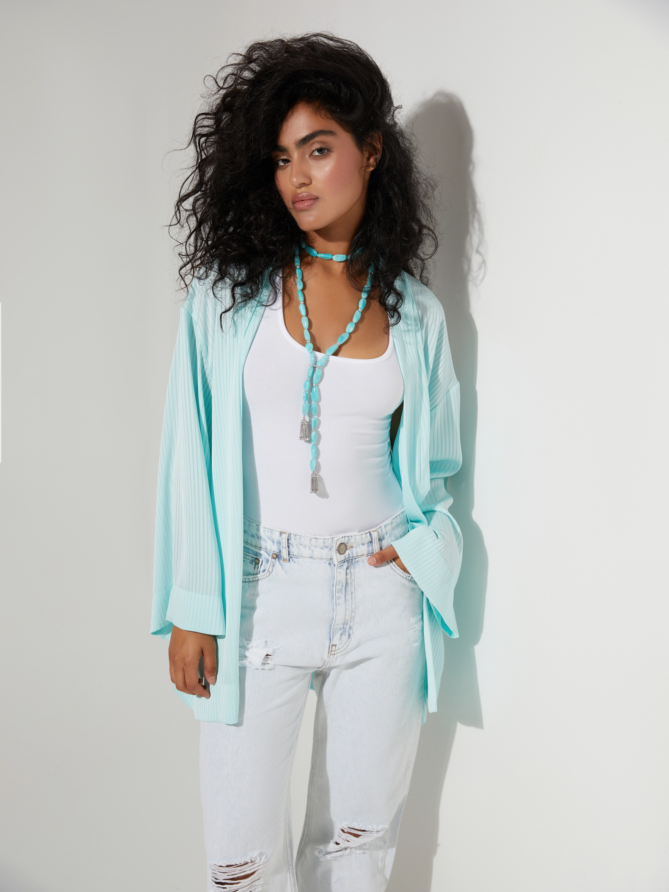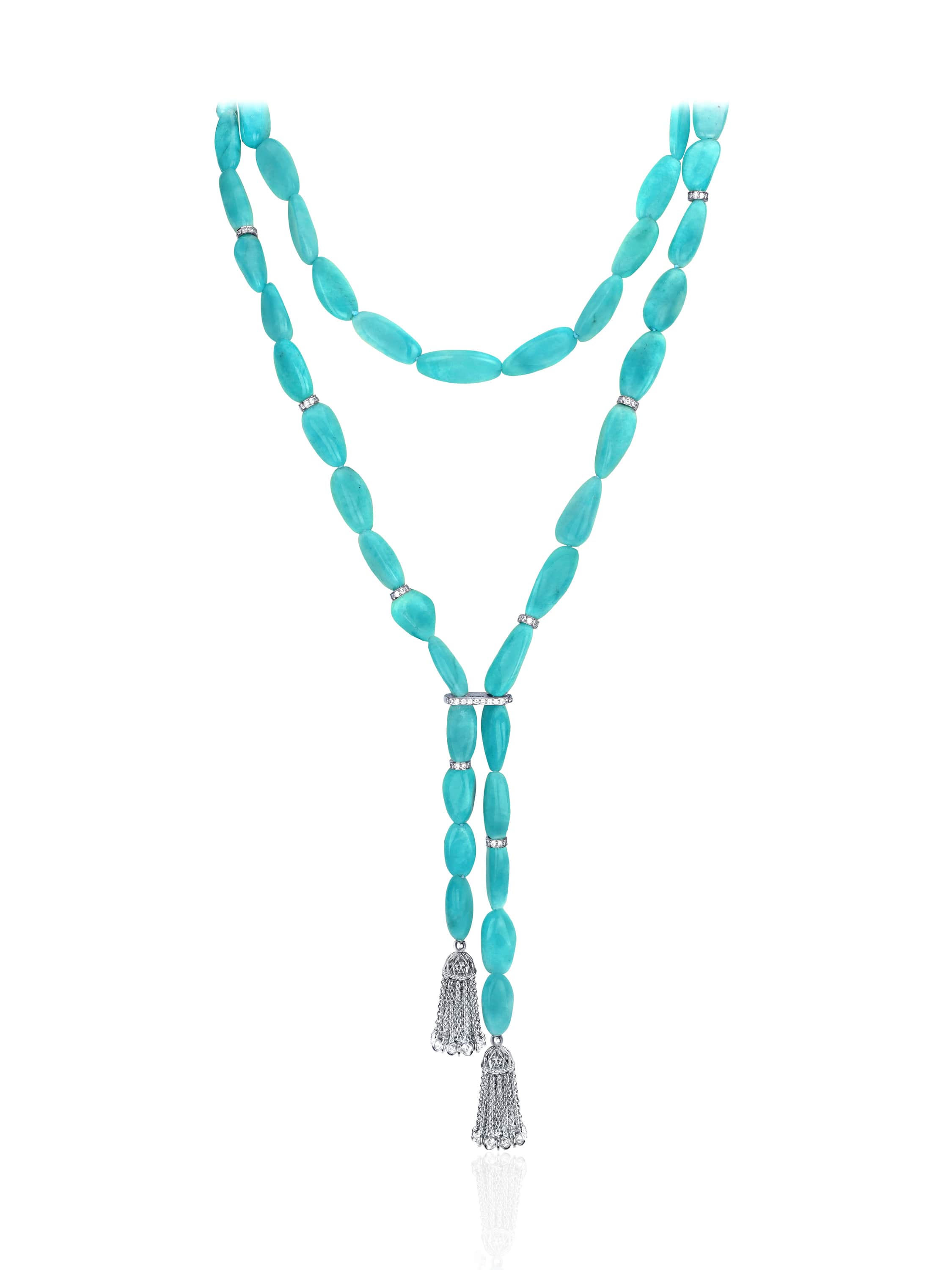 The belt necklace is made of 57 amazonites with a total weight of 132.14 g and complemented by inserts and tassels in 925 sterling silver with 108 cubic zirconia stones with a total weight of 1.84 g.