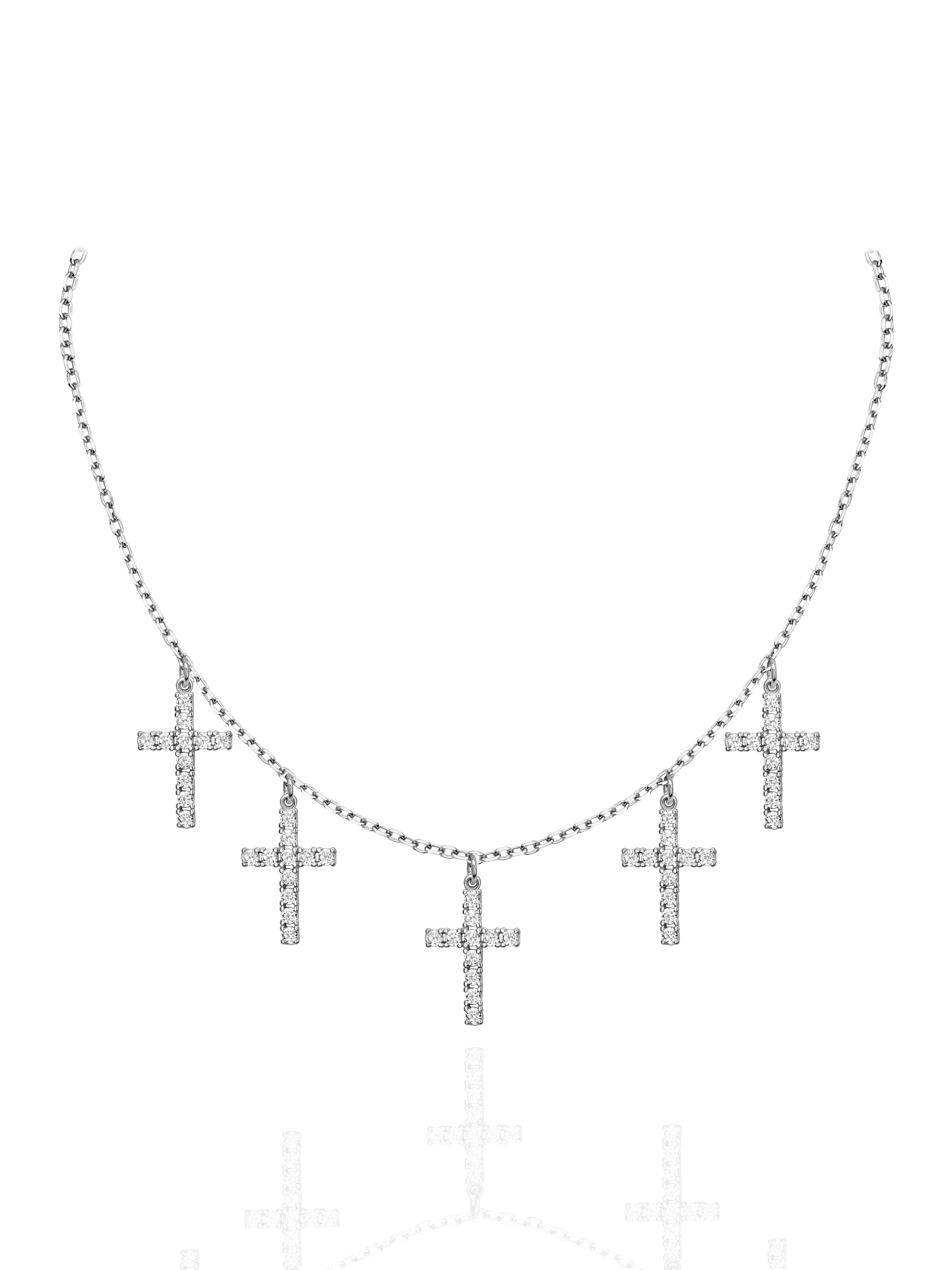 Necklace in 925 sterling silver with crosses inlaid with 55 round cubic zirconia.