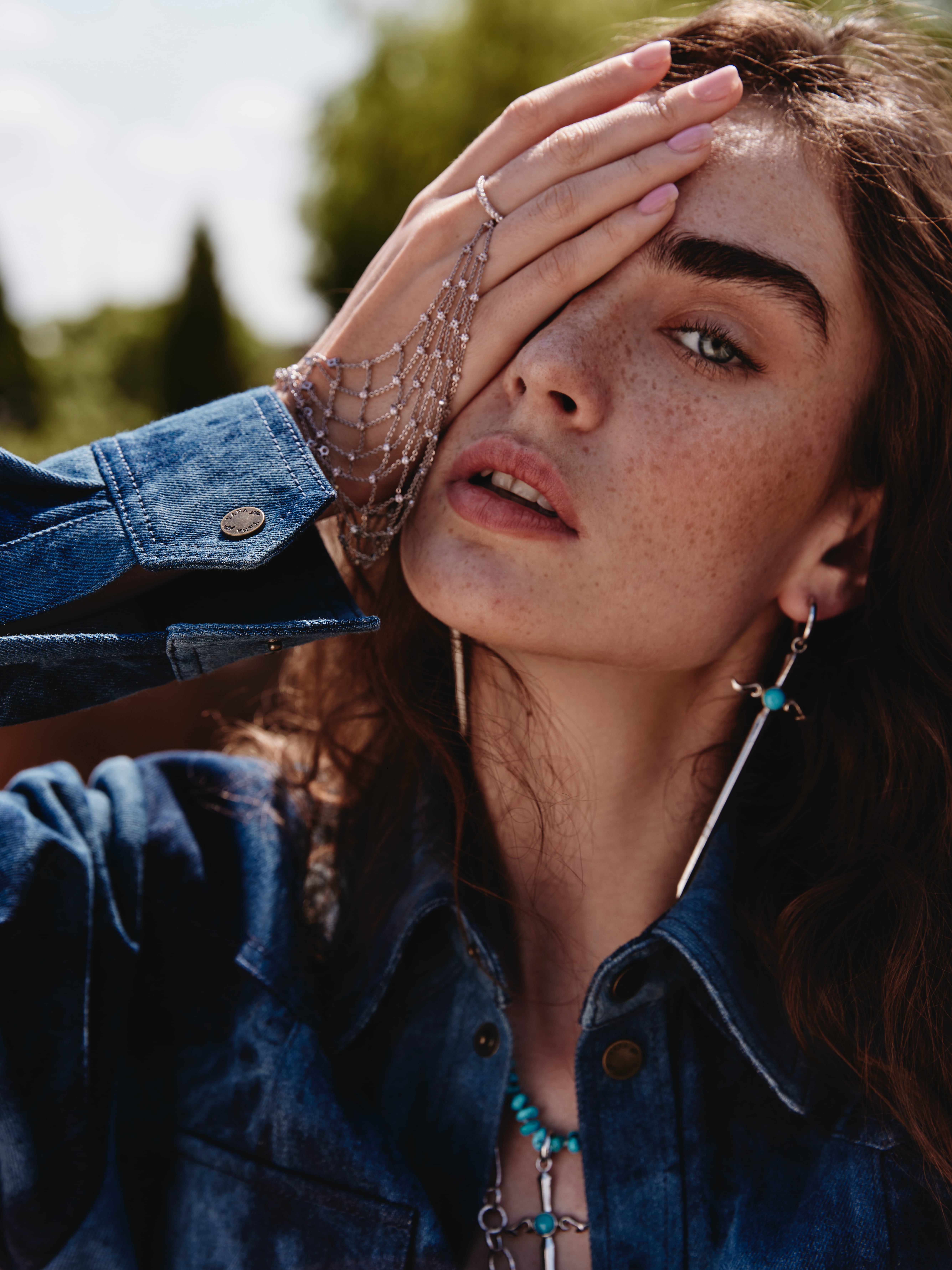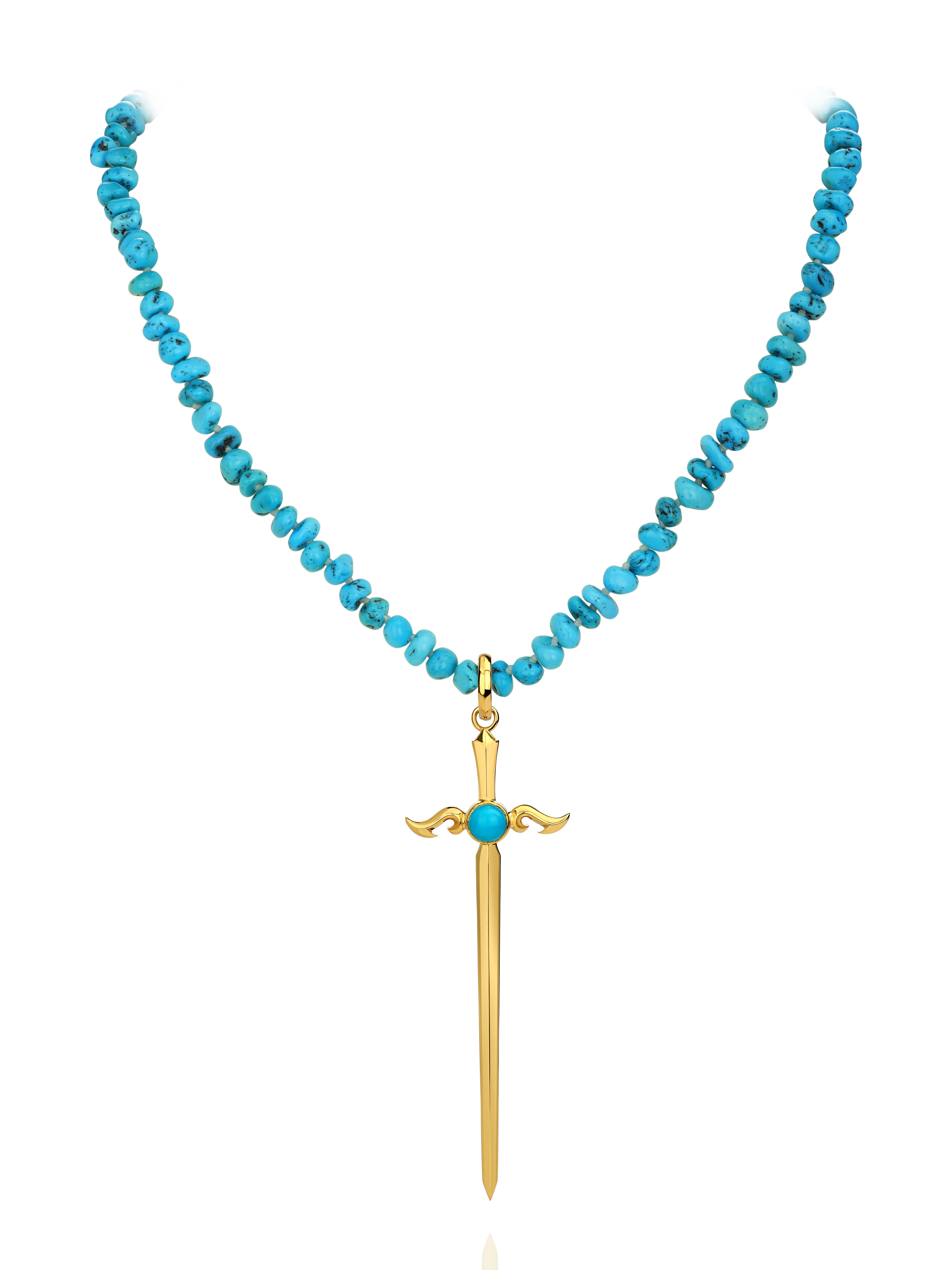 Necklace with a cross pendant in 925 sterling silver with yellow rhodium plating, set with 83 turquoise beads with a total weight of 19.34 g and cabochon-cut turquoise weighing 1.11 ct.