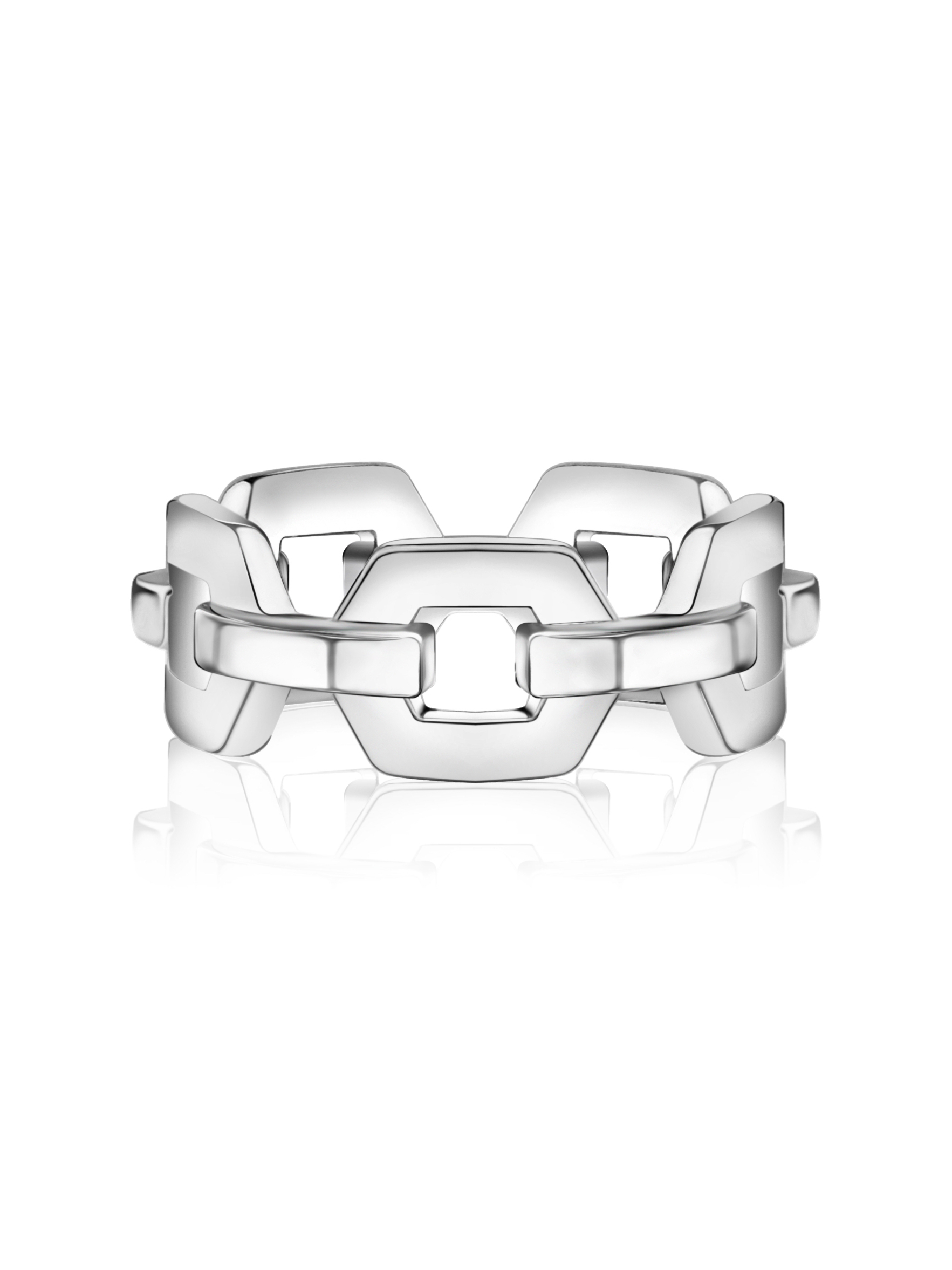 A chain-style ring made of rhodium-plated 925 sterling silver.