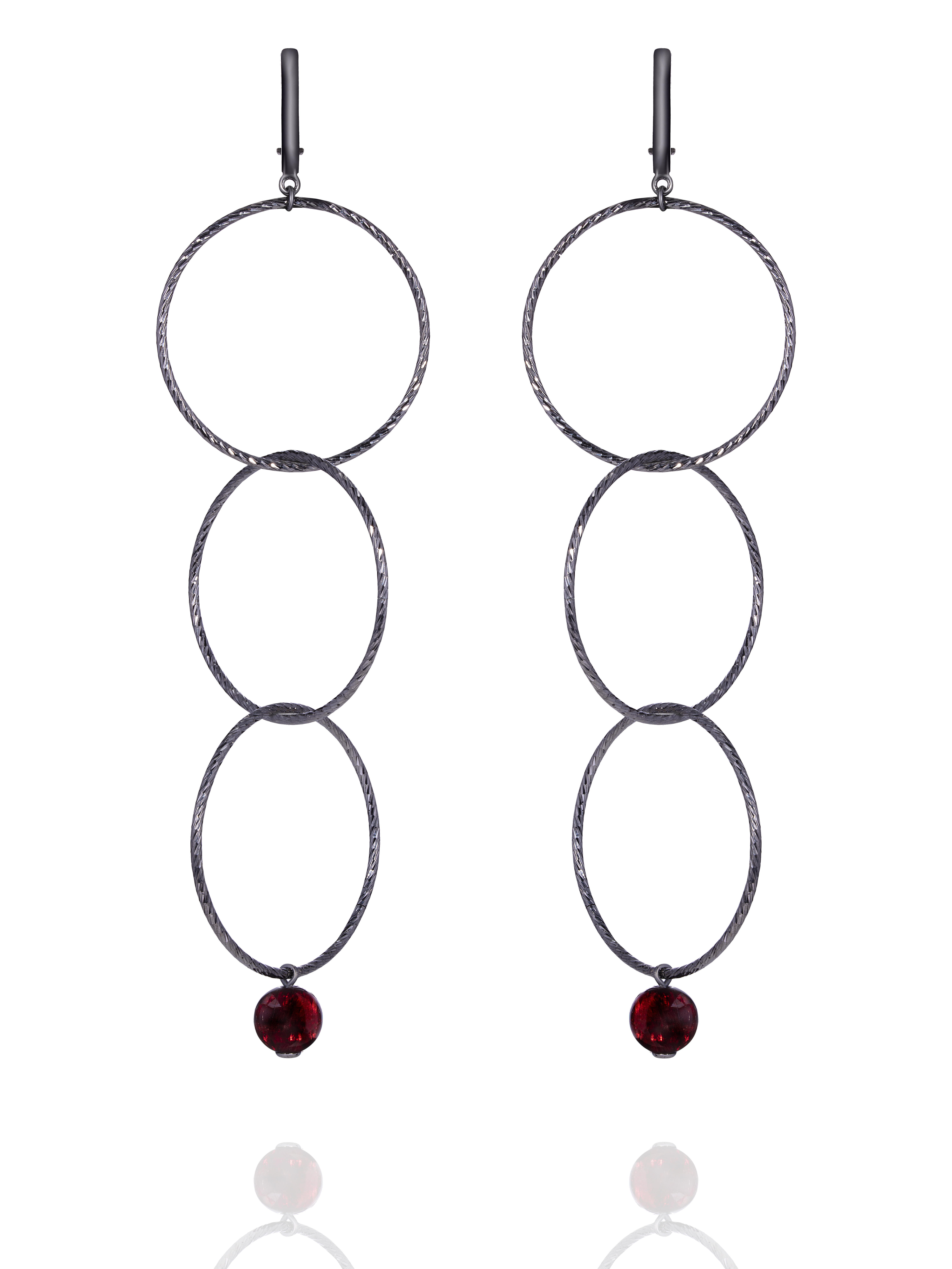 Long earrings in the shape of three rings are made of blackened silver and complemented by two garnet beads weighing 2.52 g.