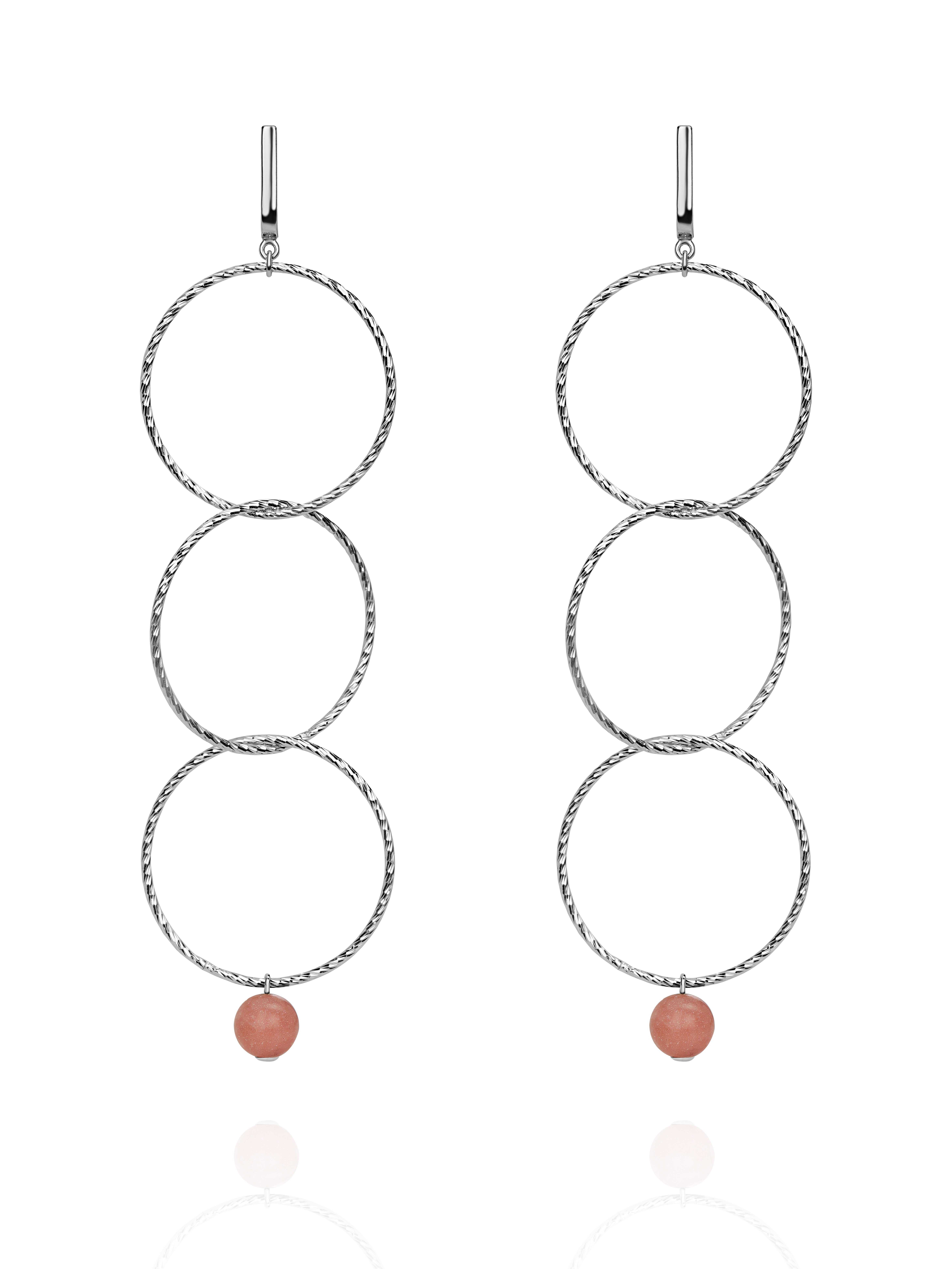 Long earrings in the shape of three rings are made of 925 sterling silver and complemented by two pink aragonite beads weighing 1.69 g.
