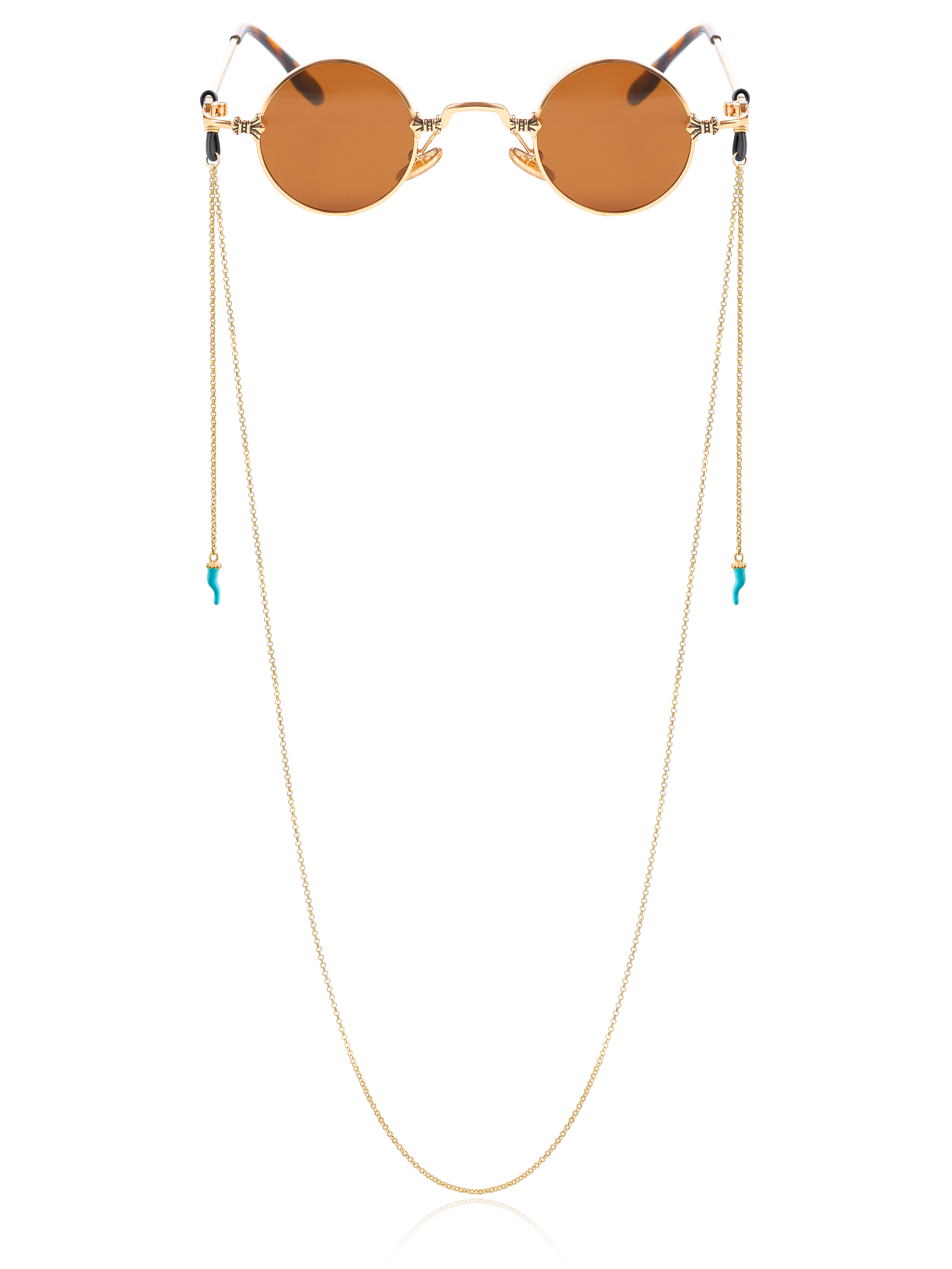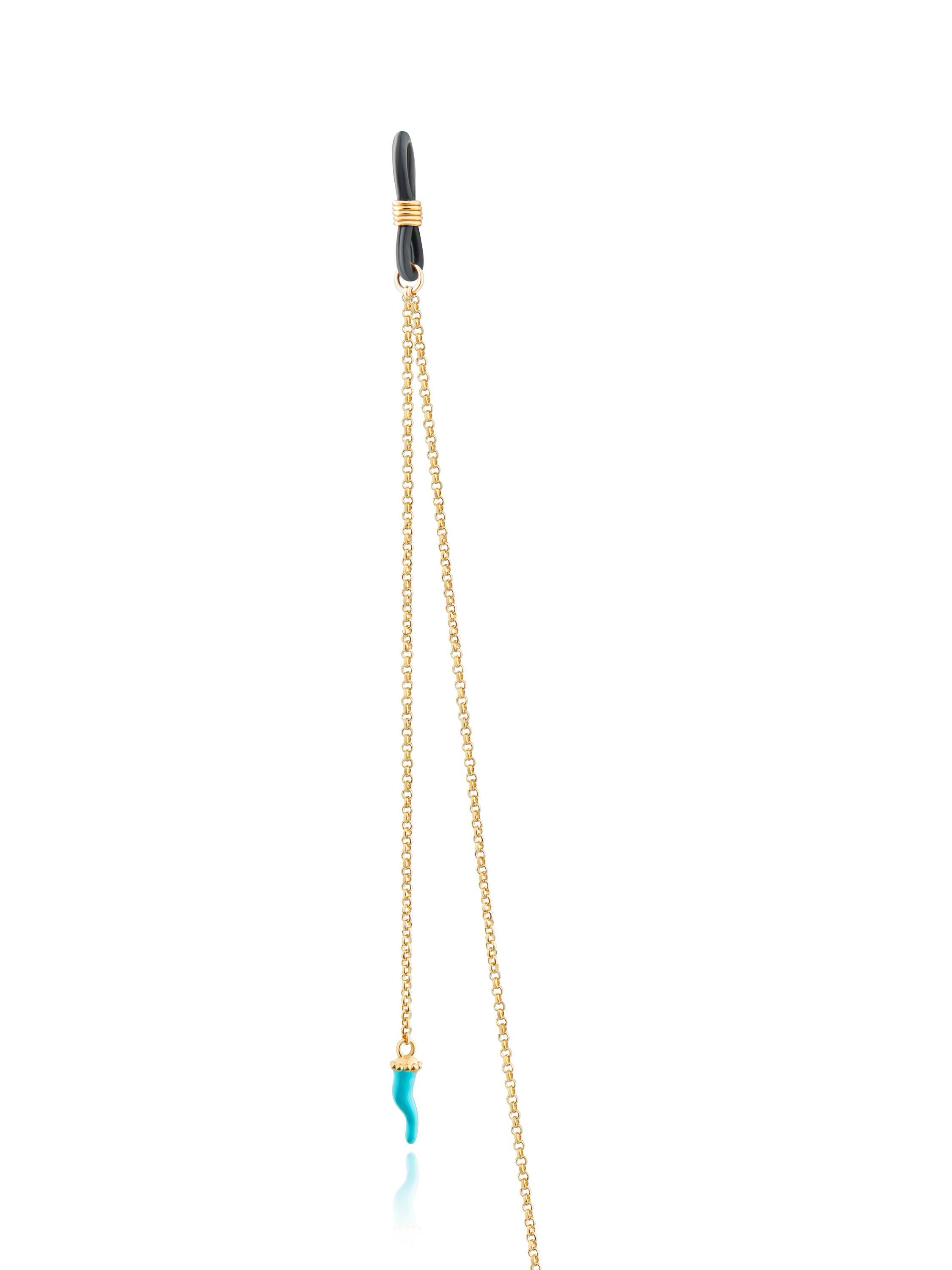 The glasses chain is made of 925 sterling silver with gold plating and complemented by pendants in the shape of turquoise peppers made of jewelry enamel.