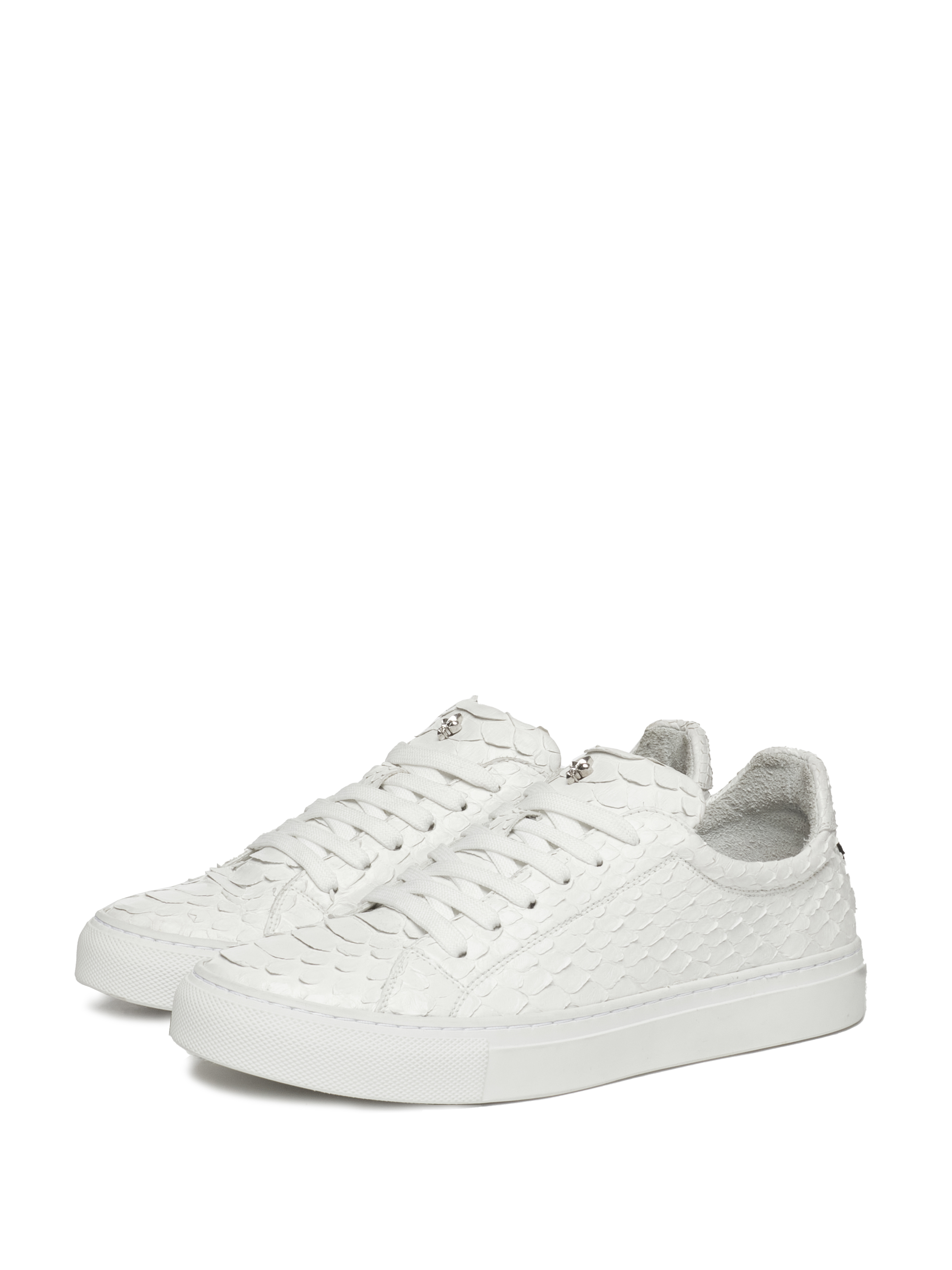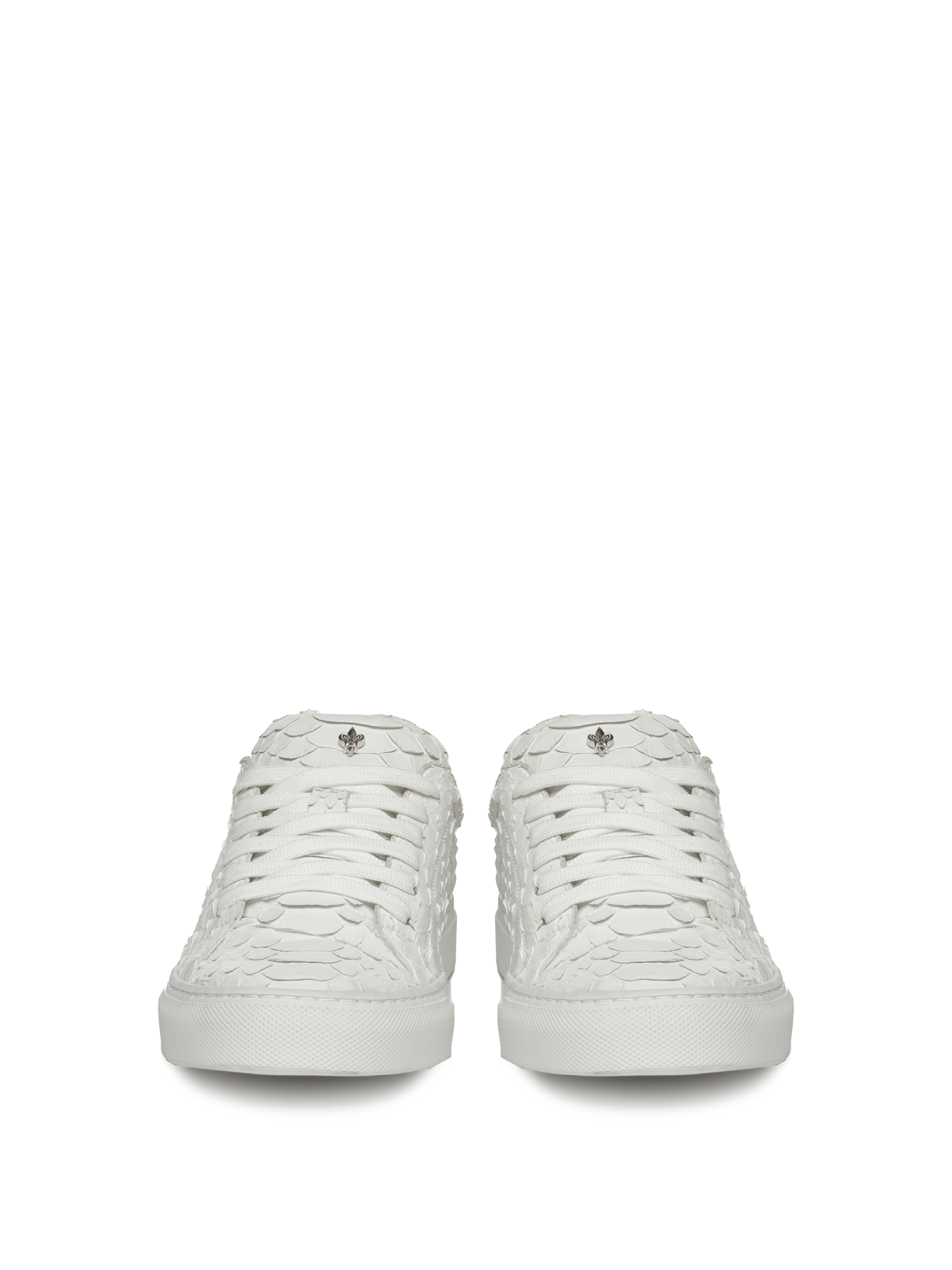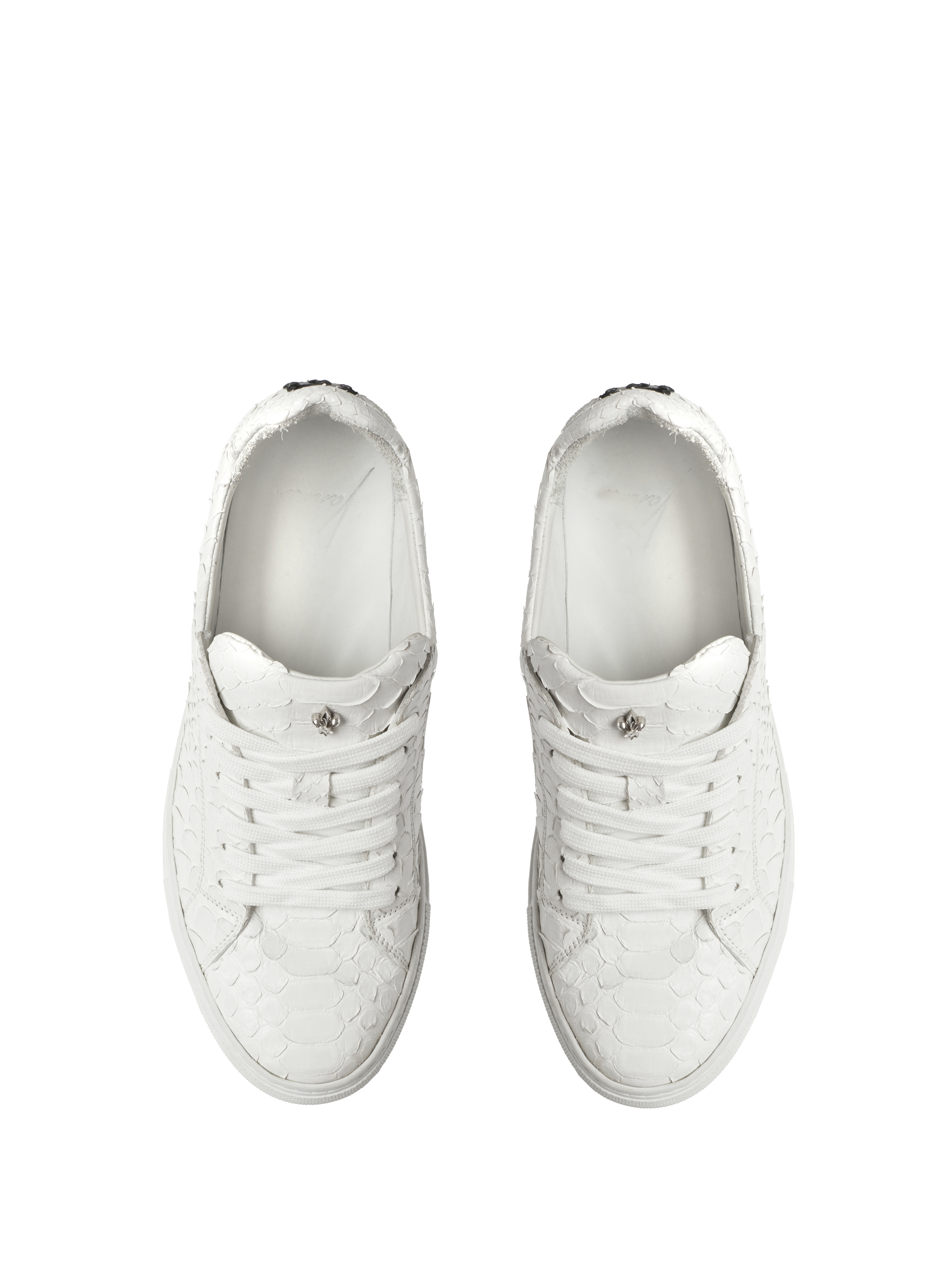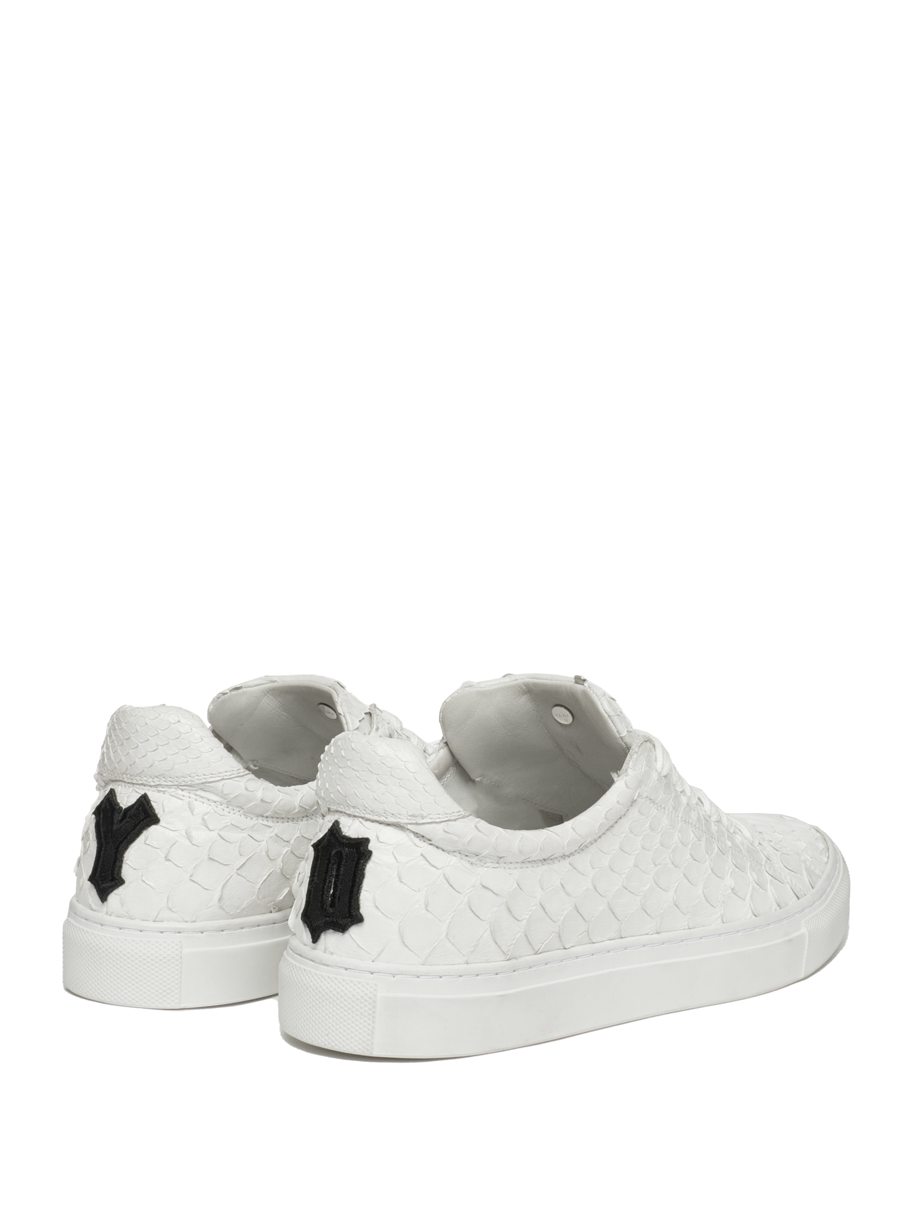 White low-top lace-up sneakers are made of python leather. The model is decorated with a sterling silver 925 lily on the tongue and a contrasting YD monogram on the heel tabs.