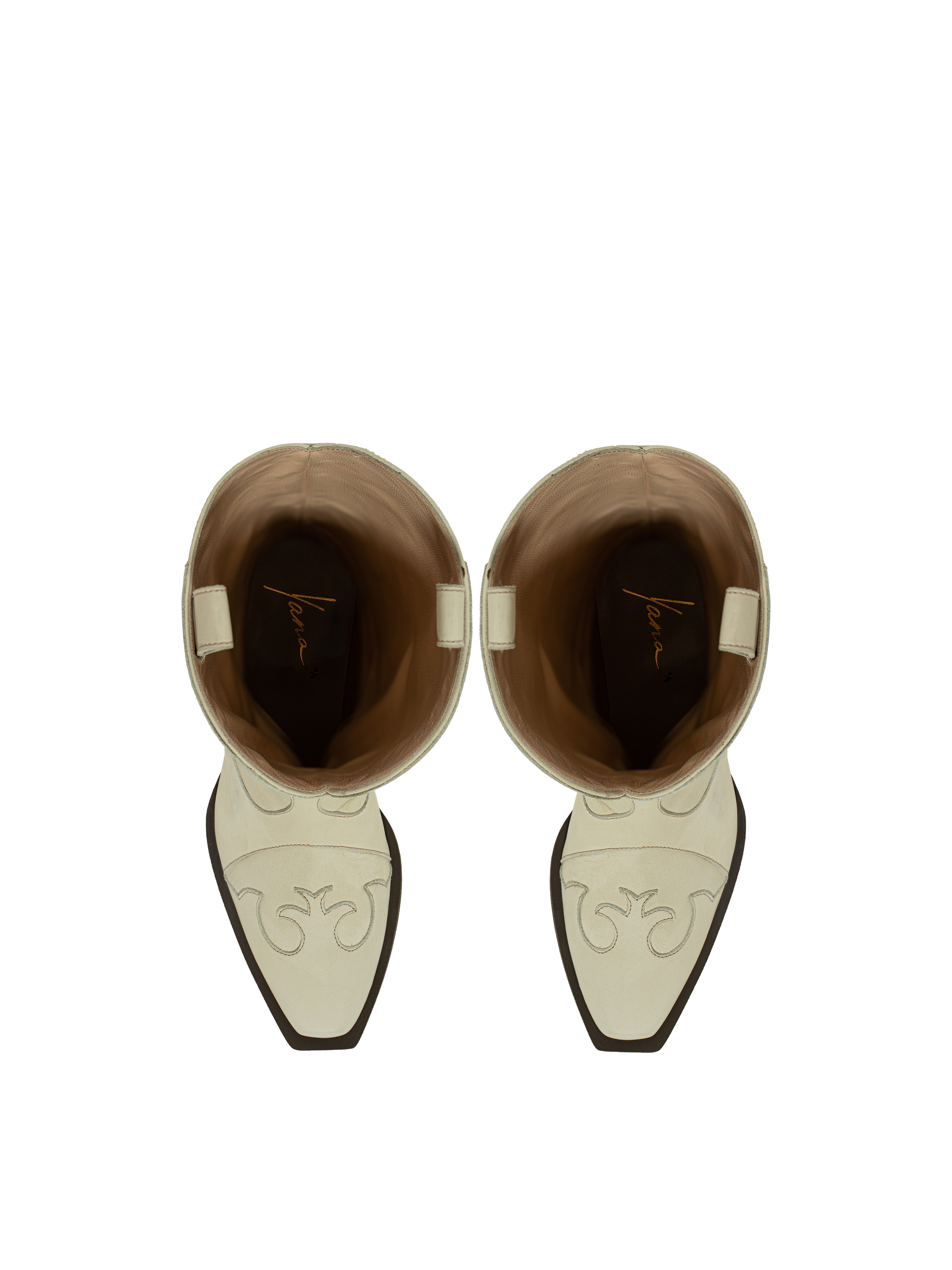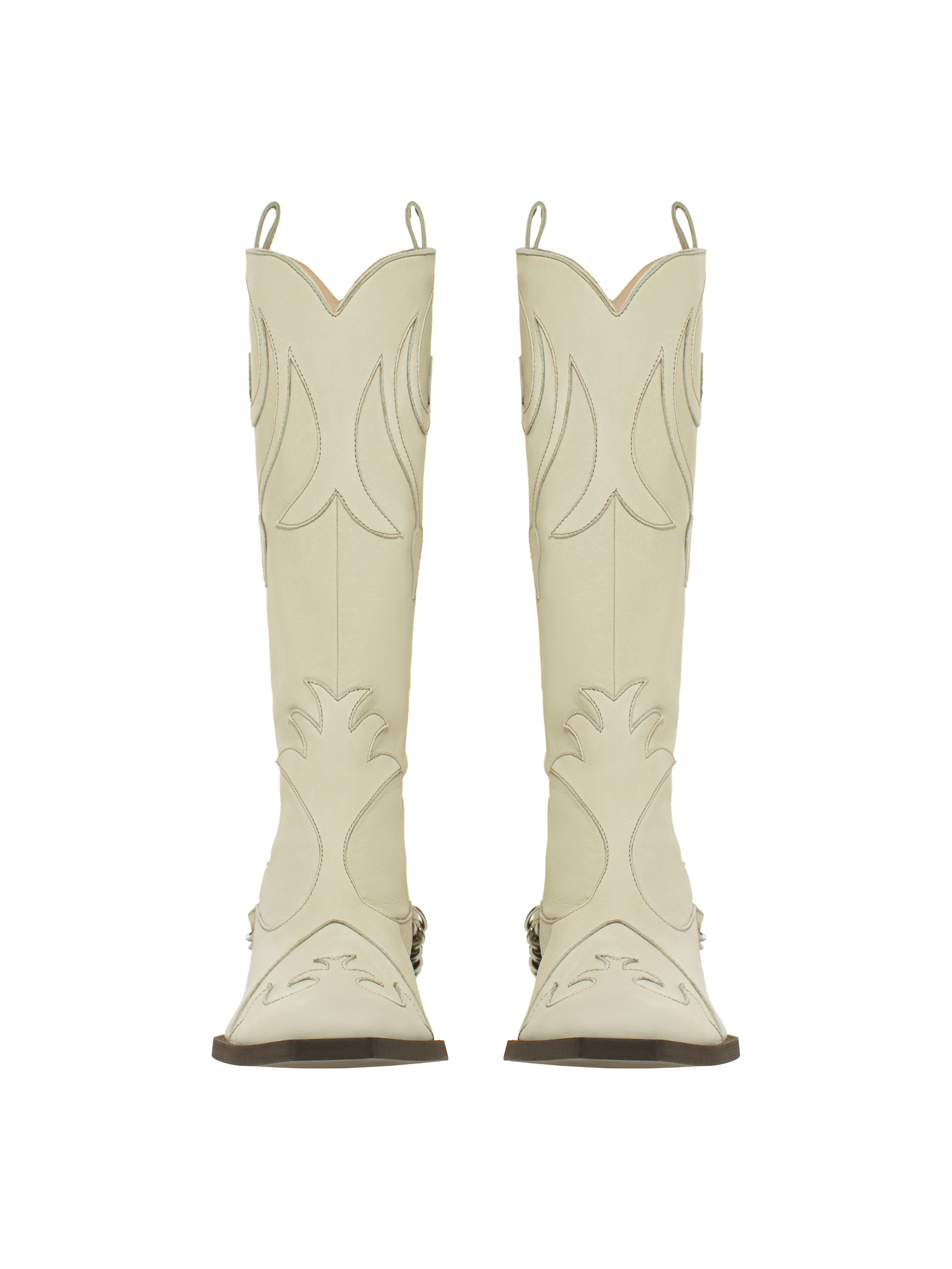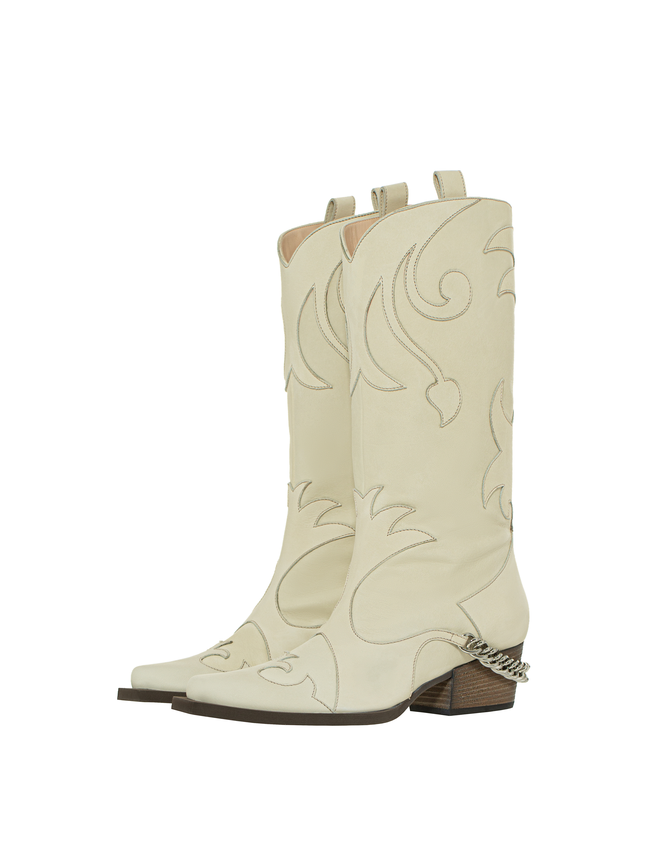 White cowboy boots are a striking example of versatile footwear that pairs equally well with jeans and dresses. The brand’s craftsmen crafted the model from genuine leather on a slightly slanted heel. The boots are complemented by shaped details and a shiny silver chain.
