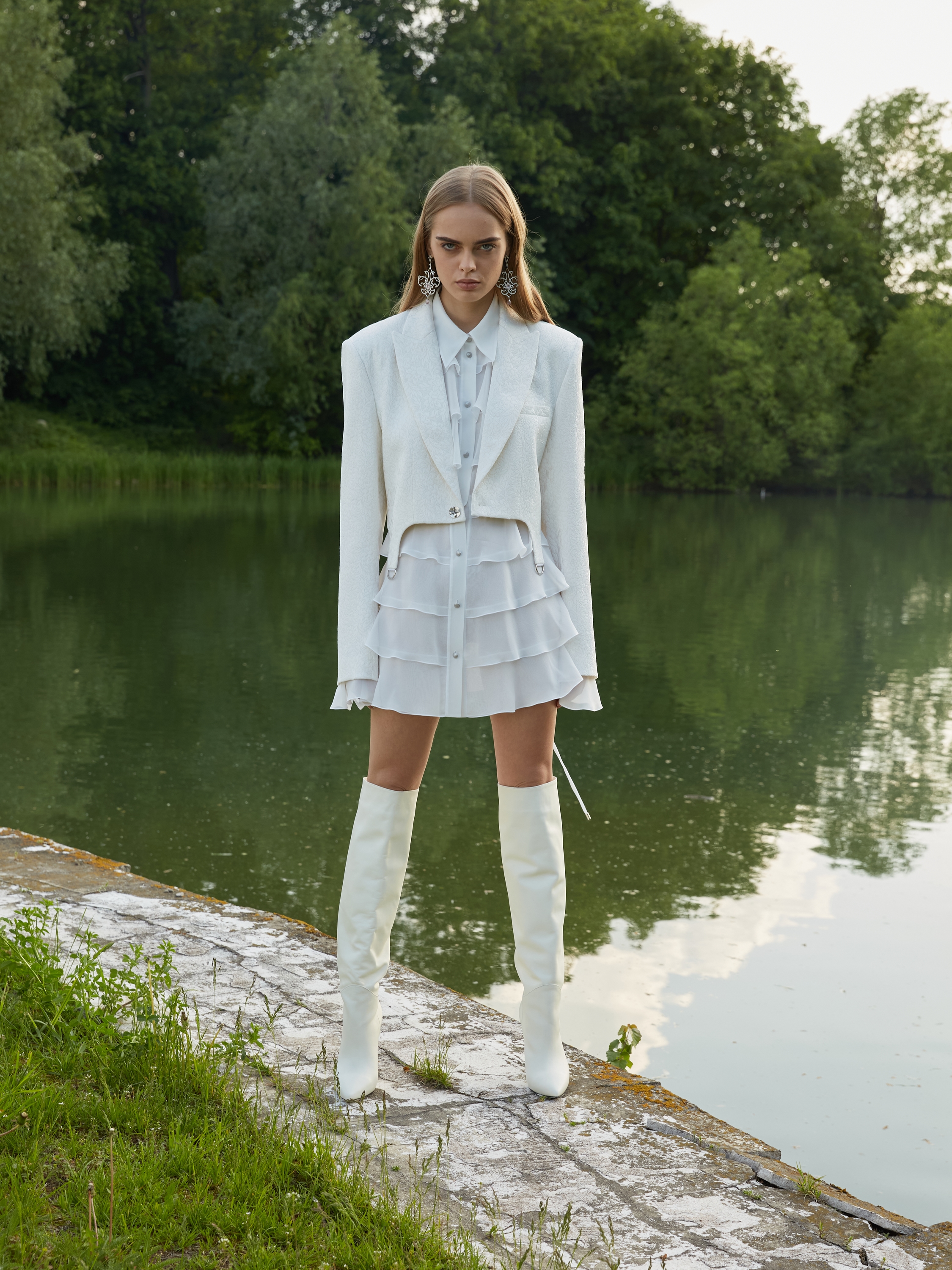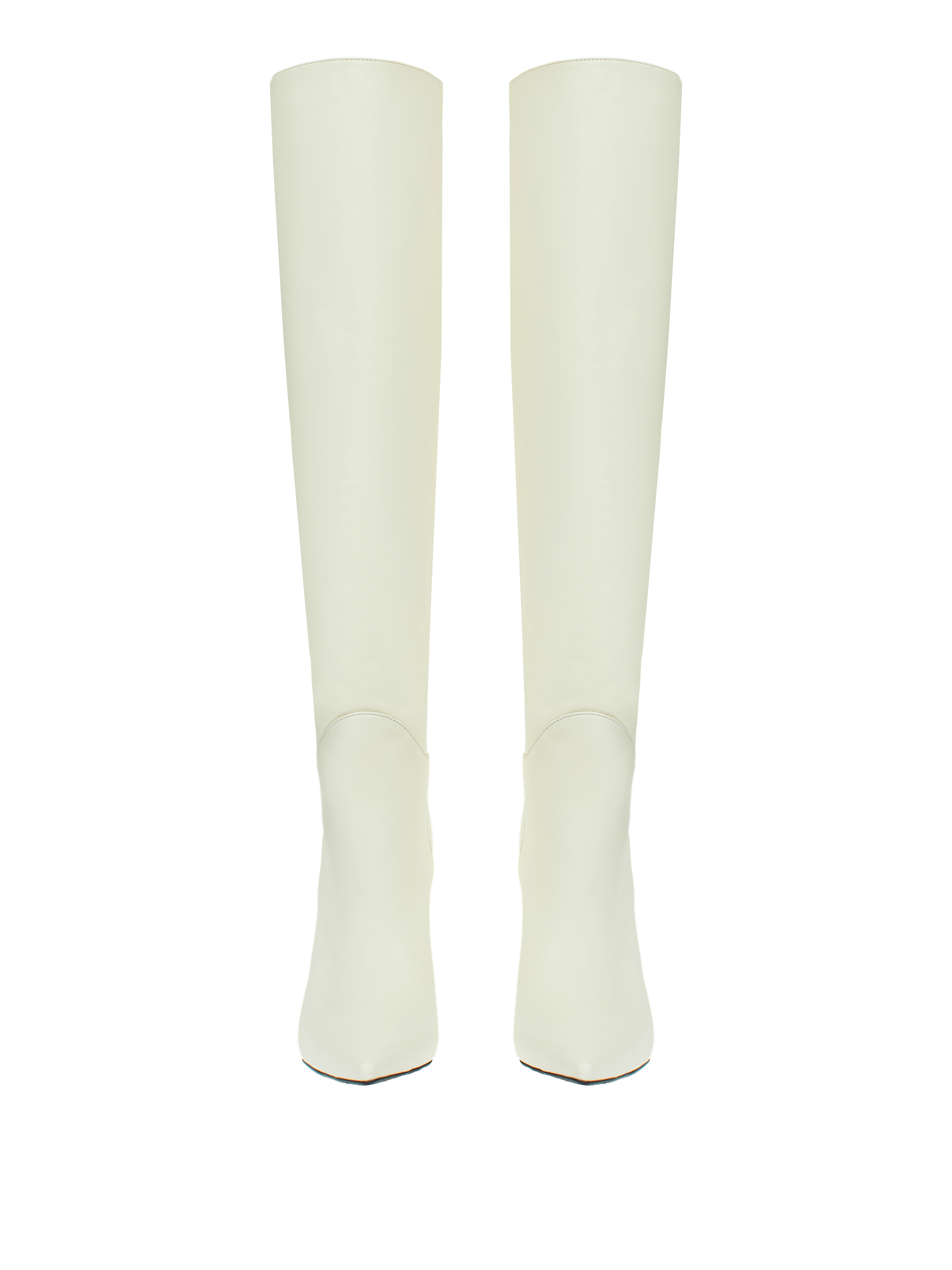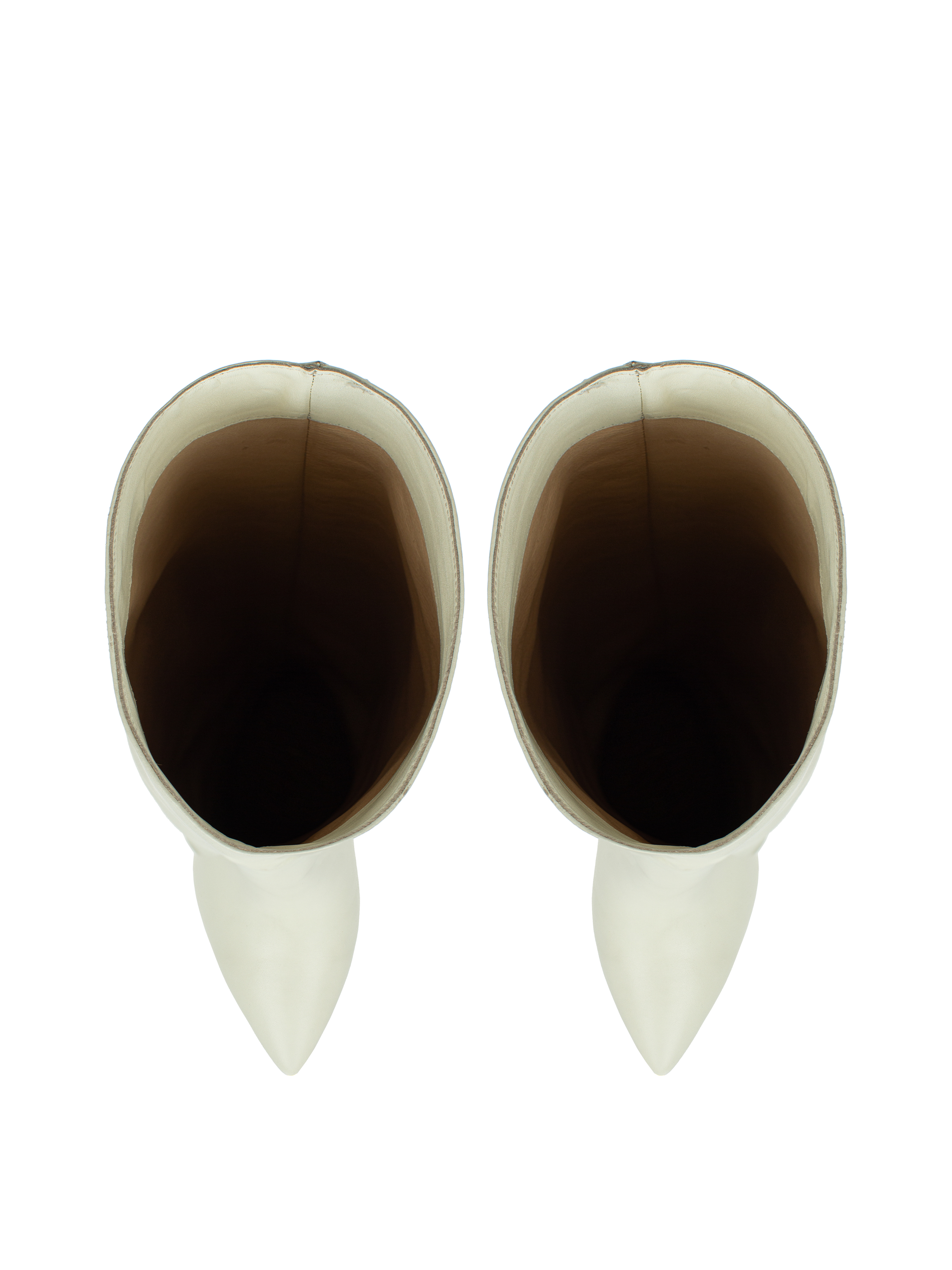 White high-stiletto boots with a pointed toe will help create a memorable look. Thanks to the wide shaft, the boots without zippers are easy to put on and take off. The model is made of soft grained leather with a matte sheen.