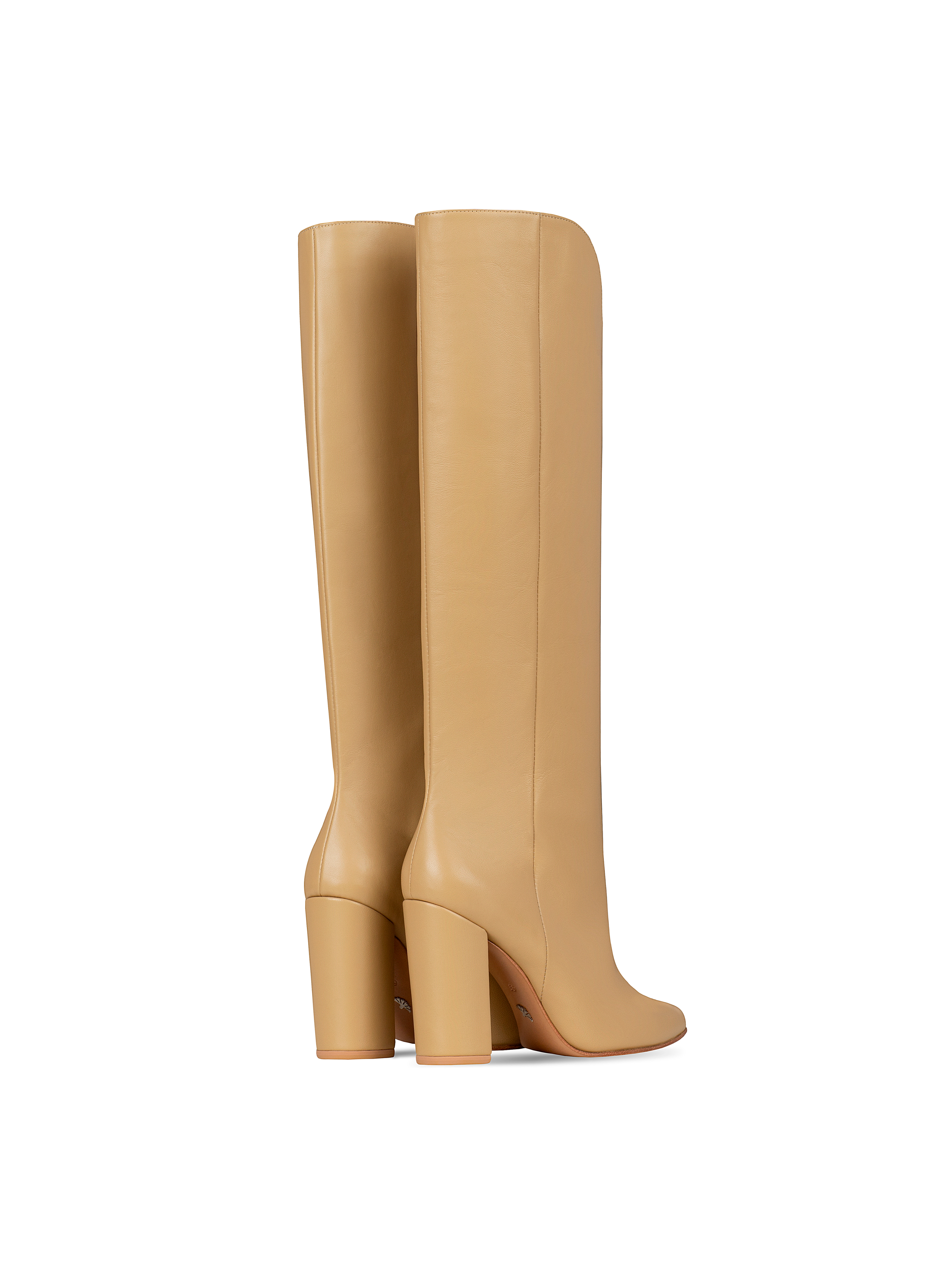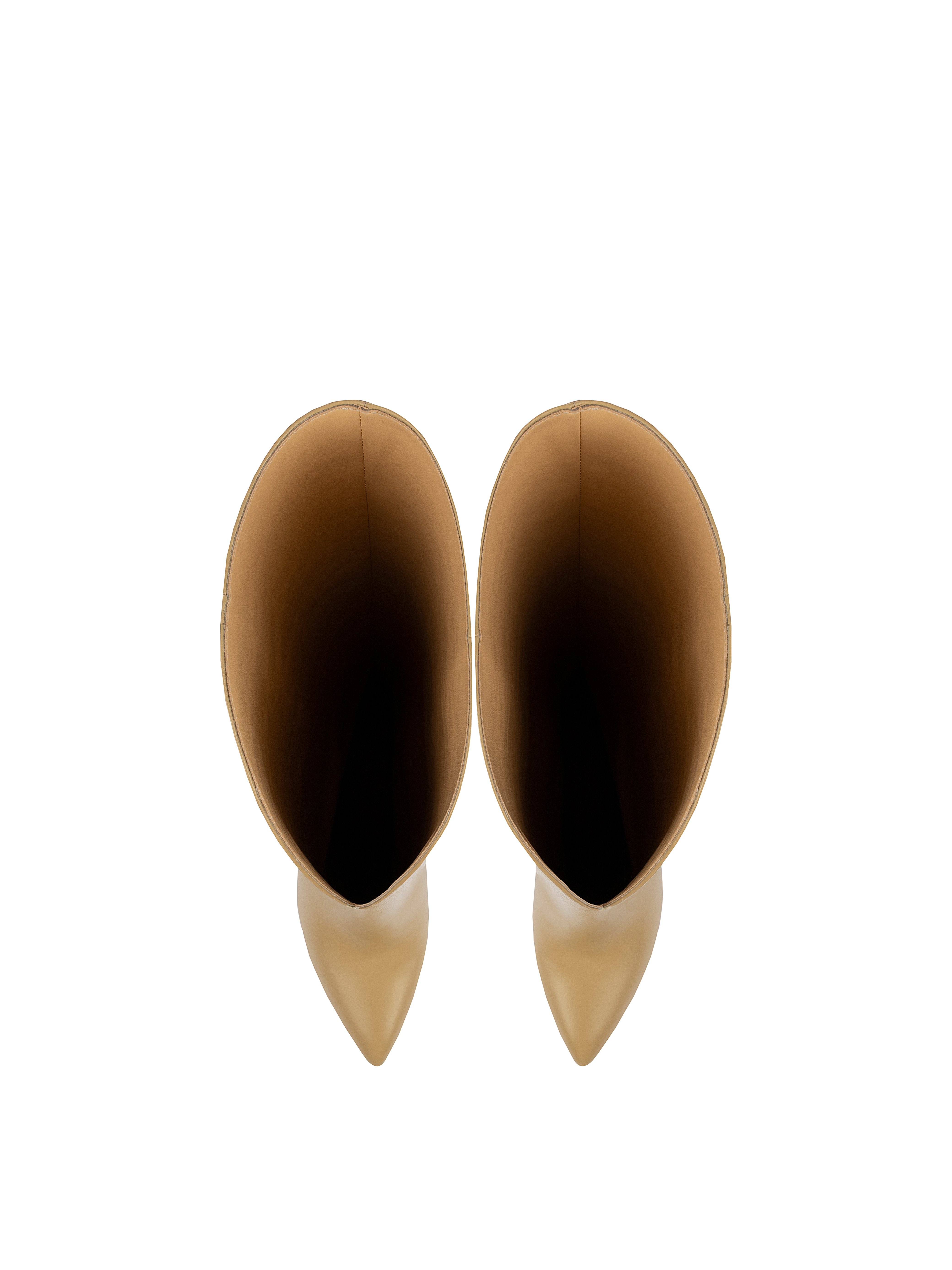 Beige high-heeled boots with a tapered toe will help create a memorable look. Thanks to the wide shaft with a shaped top edge, the zipless boots are easy to put on and take off. The model is made of soft grained leather with a matte sheen.