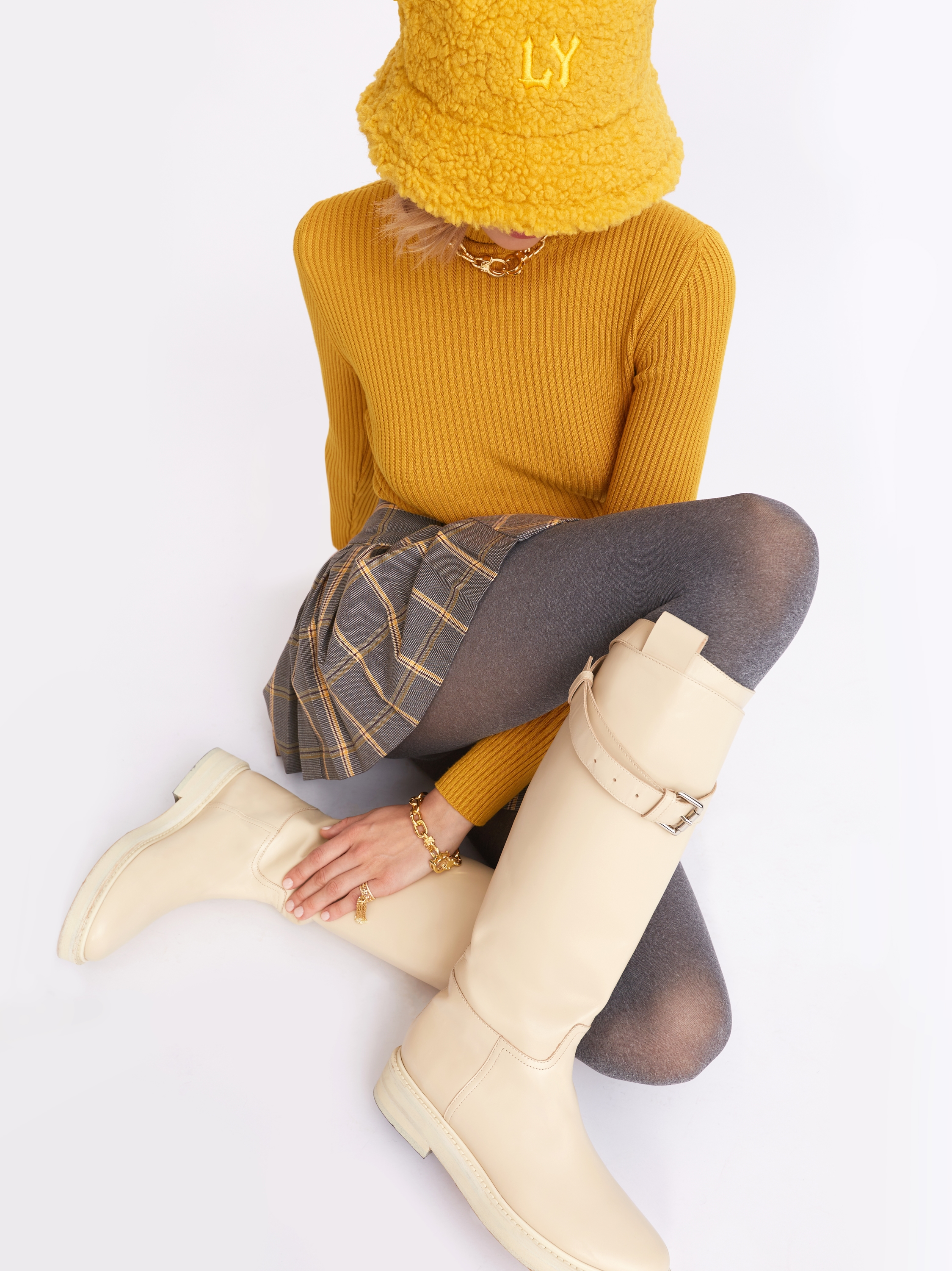 Ivory Leather Buckled Knee Boots