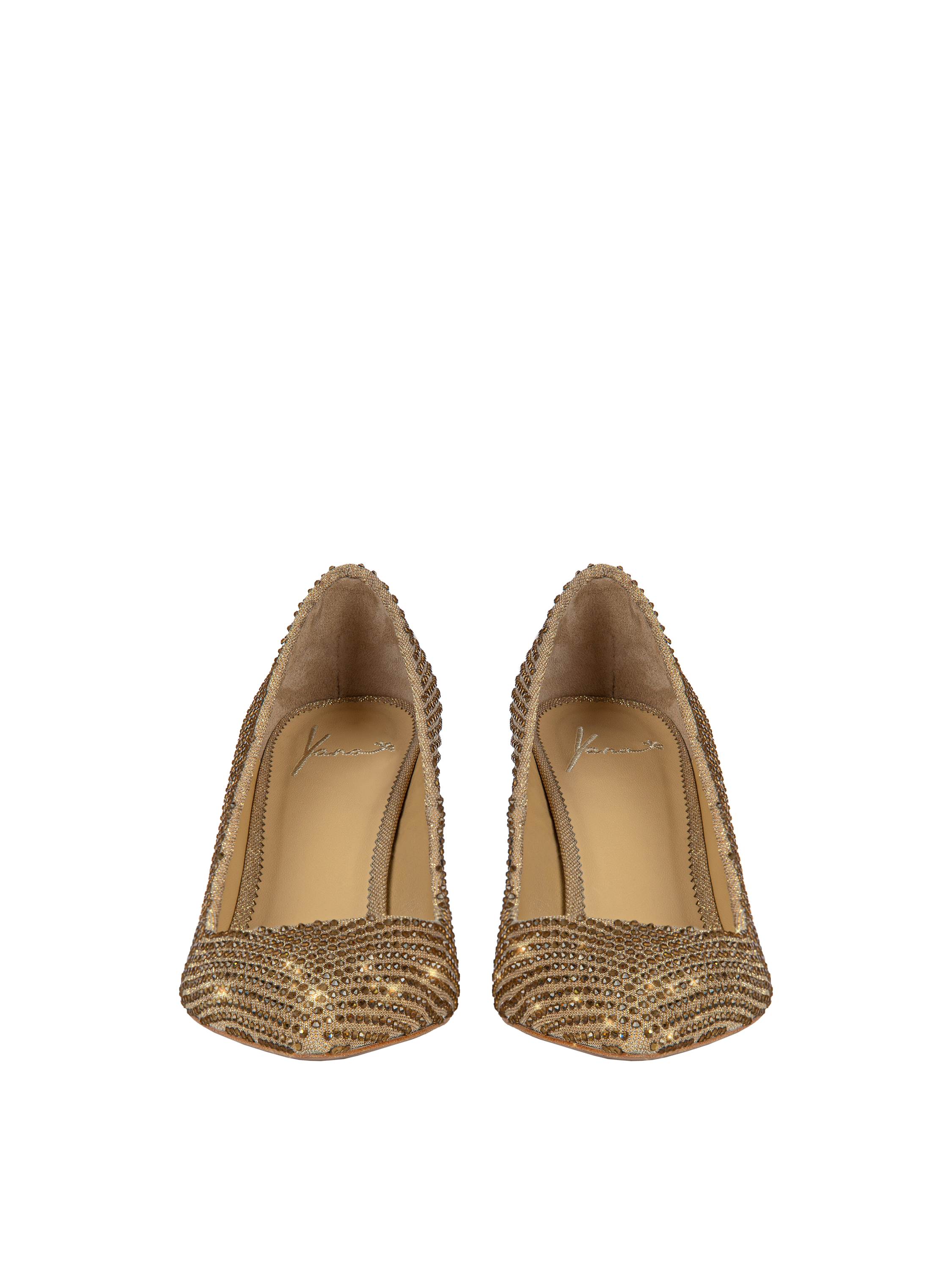 Neat pumps with a classic pointed toe and stiletto heel are made of soft beige leather on the inside, while the outside is covered with shimmering golden rhinestones. Pair them with a dress by Yana Dress and be irresistible!