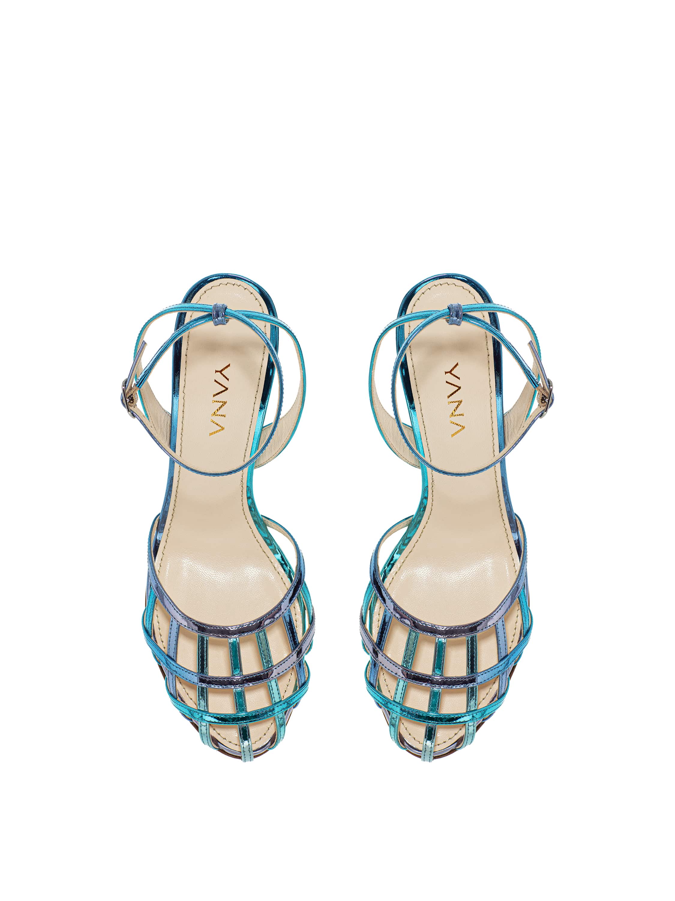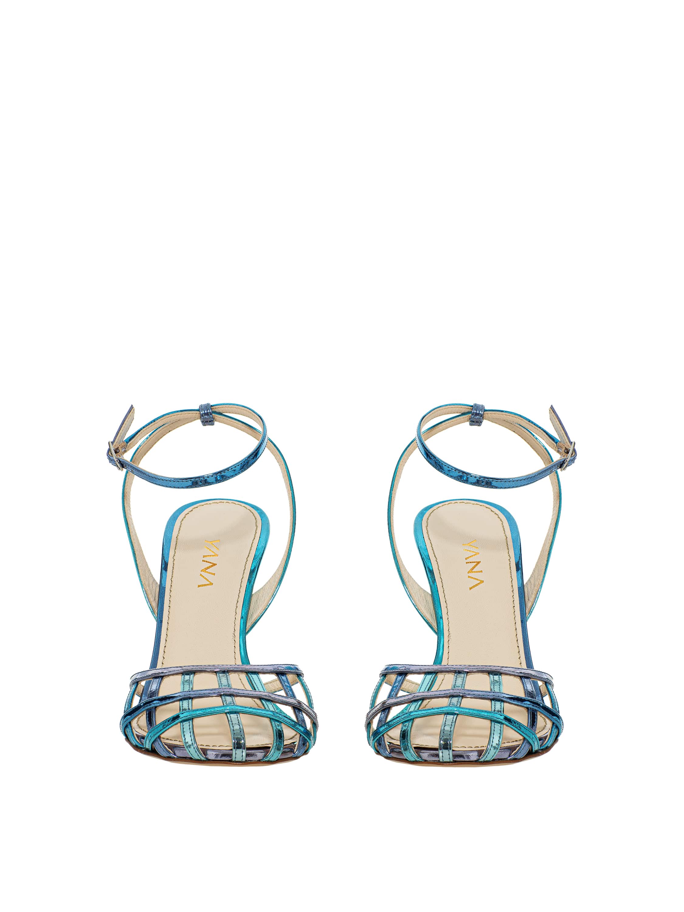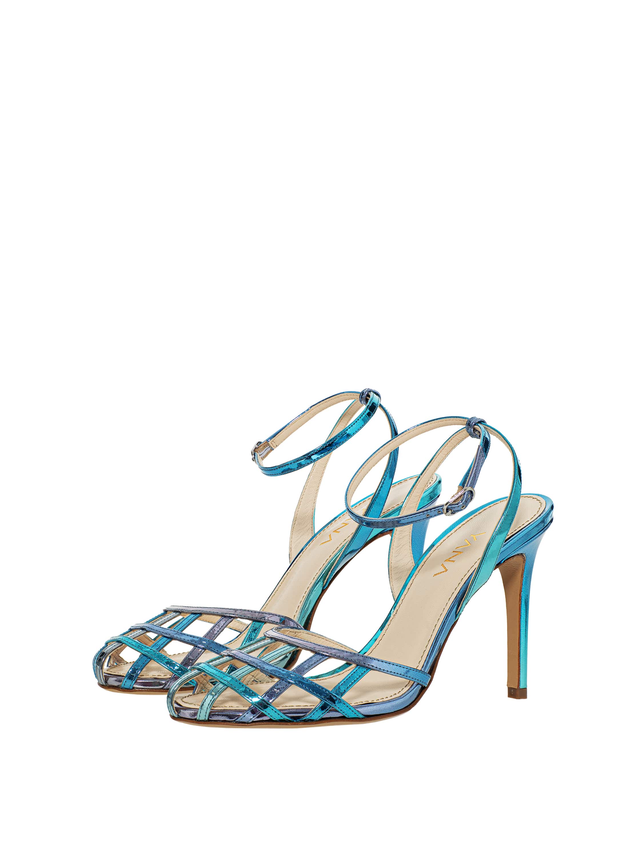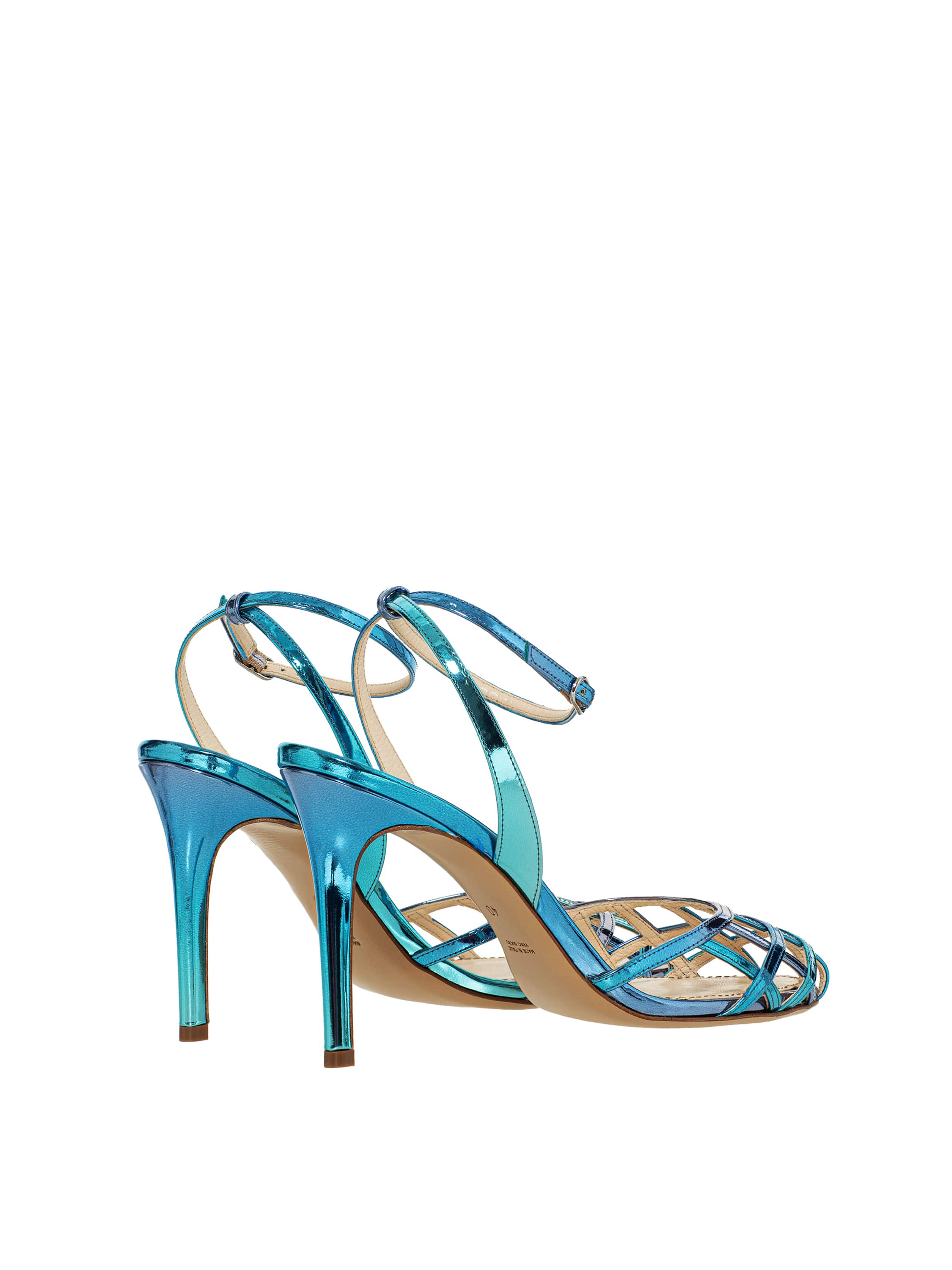 Light blue woven sandals with a thin stiletto heel, made of genuine leather and satin. There is a thin strap with a buckle around the ankle, which secures the shoe firmly on the foot. Heel height: 9 cm. Round toe.