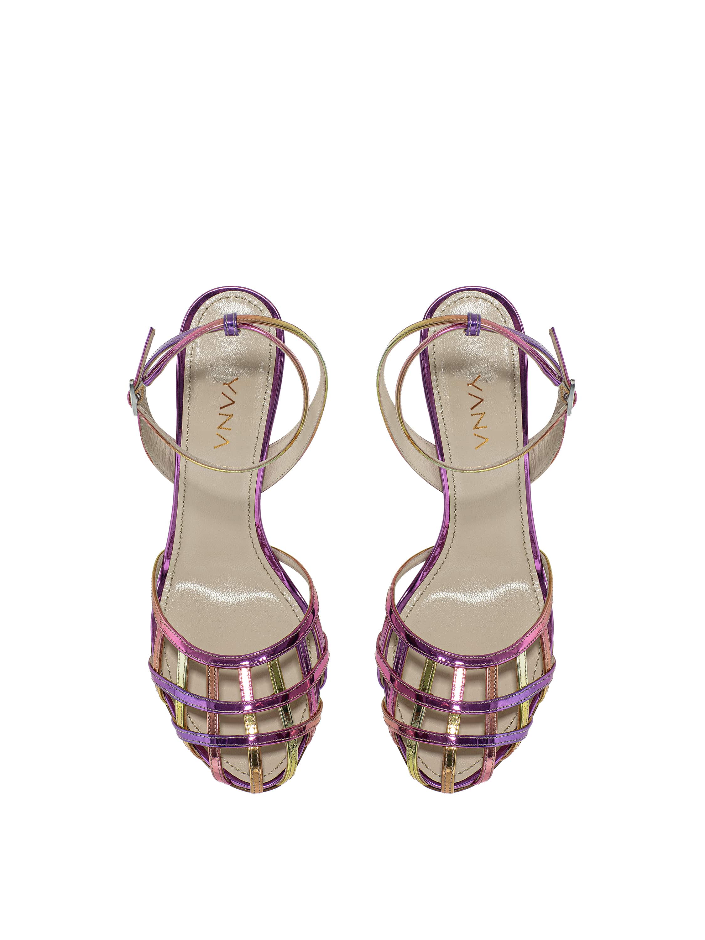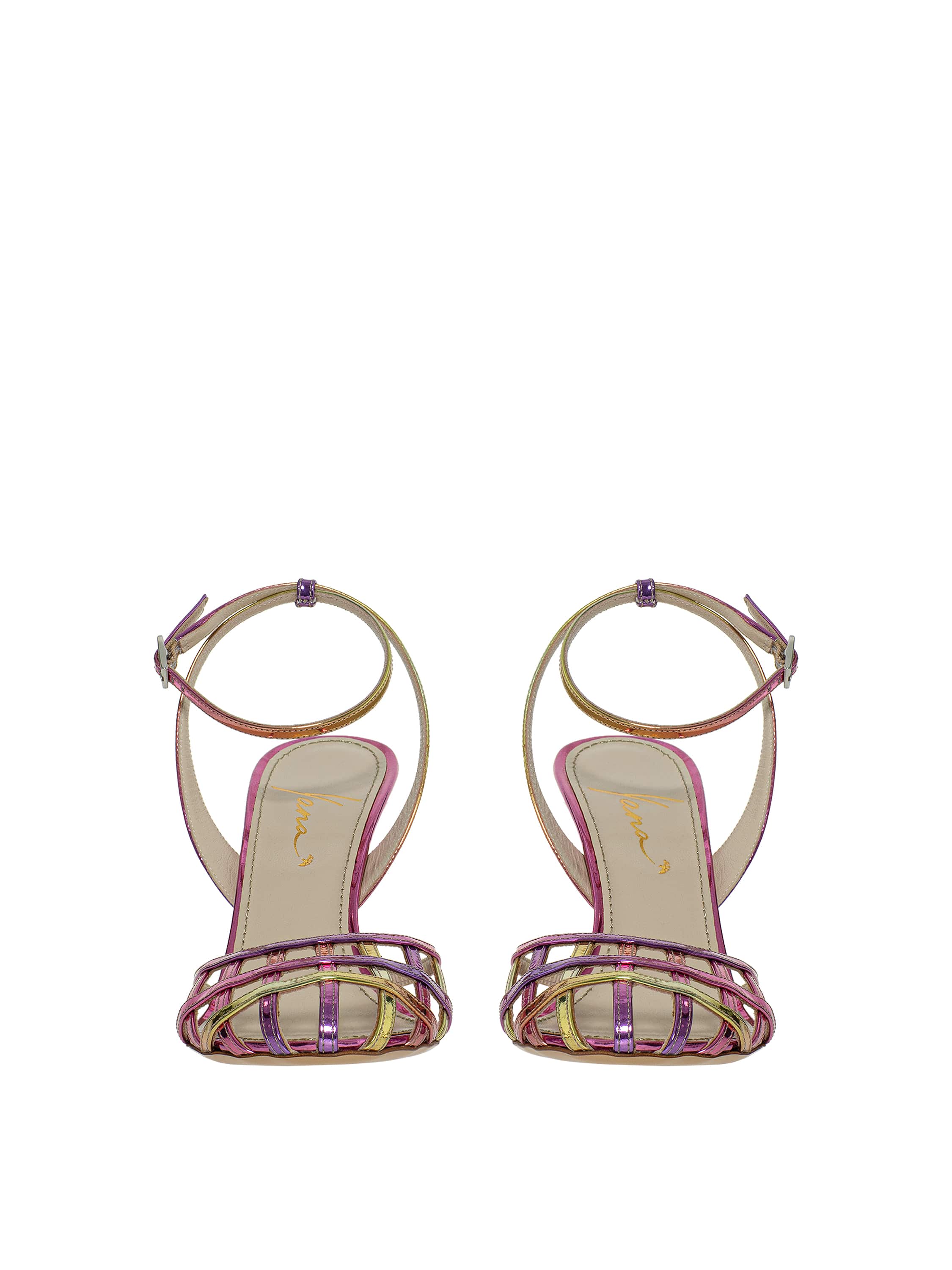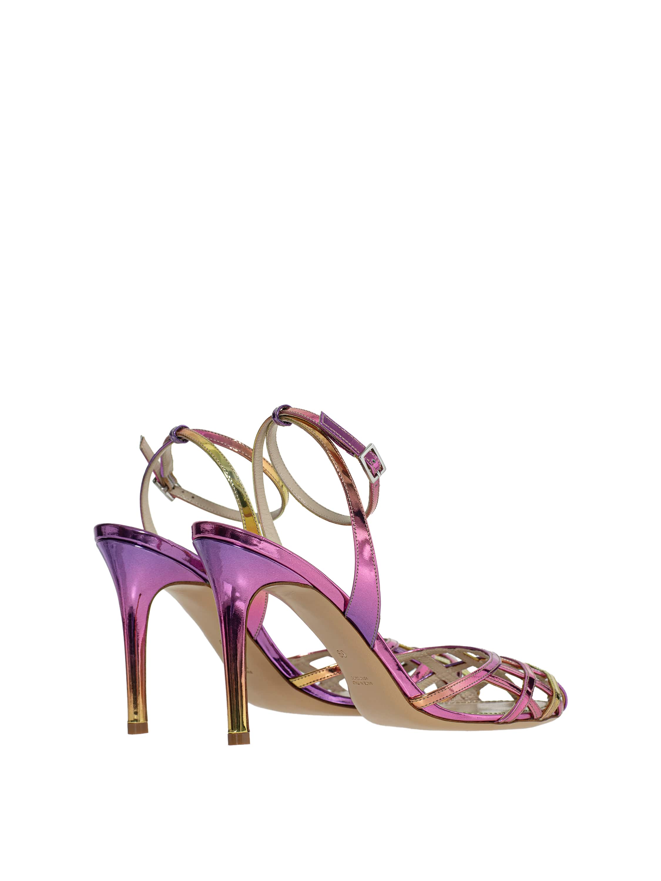 Pink woven sandals with a thin stiletto heel, made of genuine leather. There is a thin strap with a buckle around the ankle, which secures the shoe firmly on the foot. Heel height: 9 cm. Round toe.