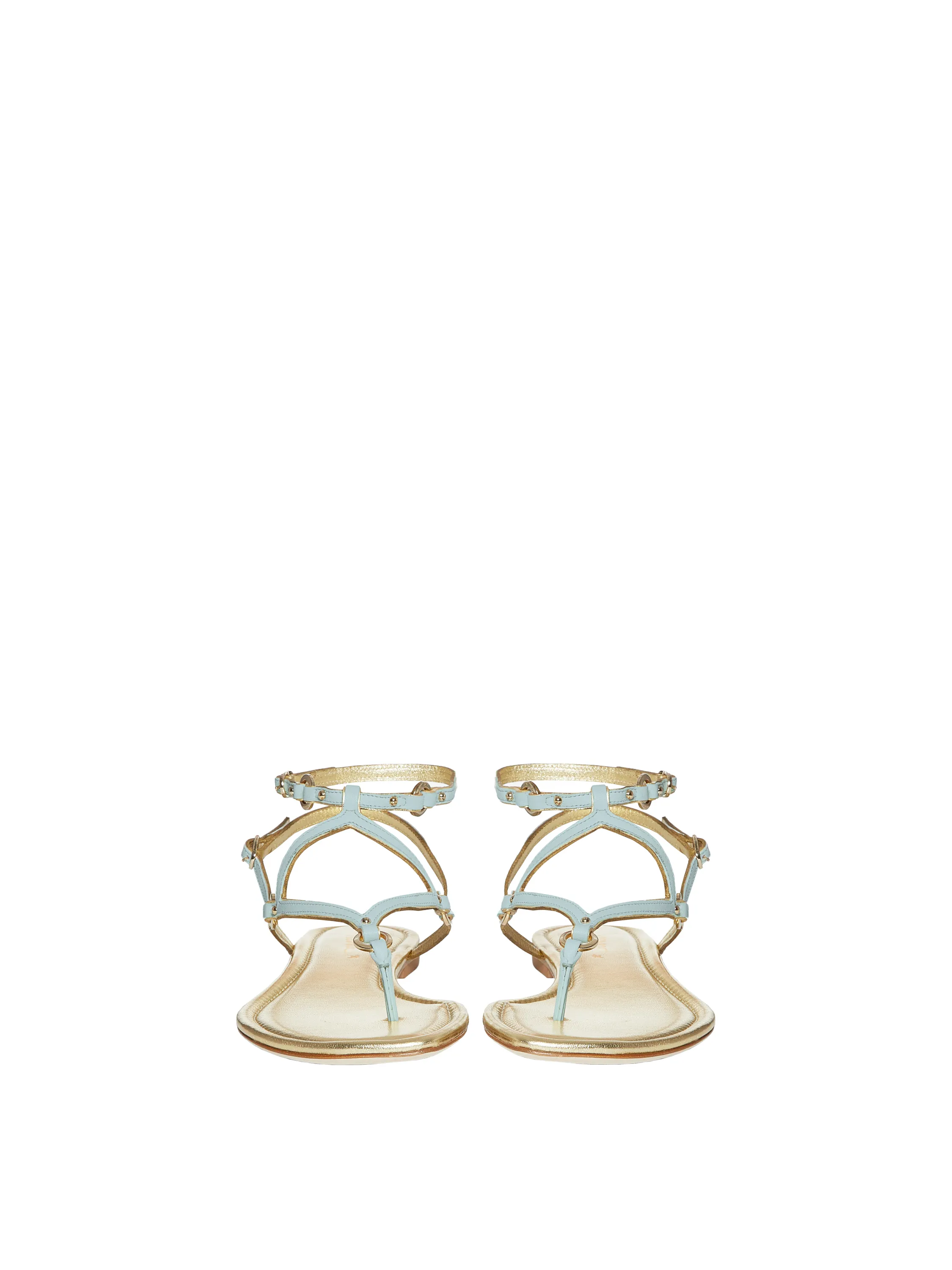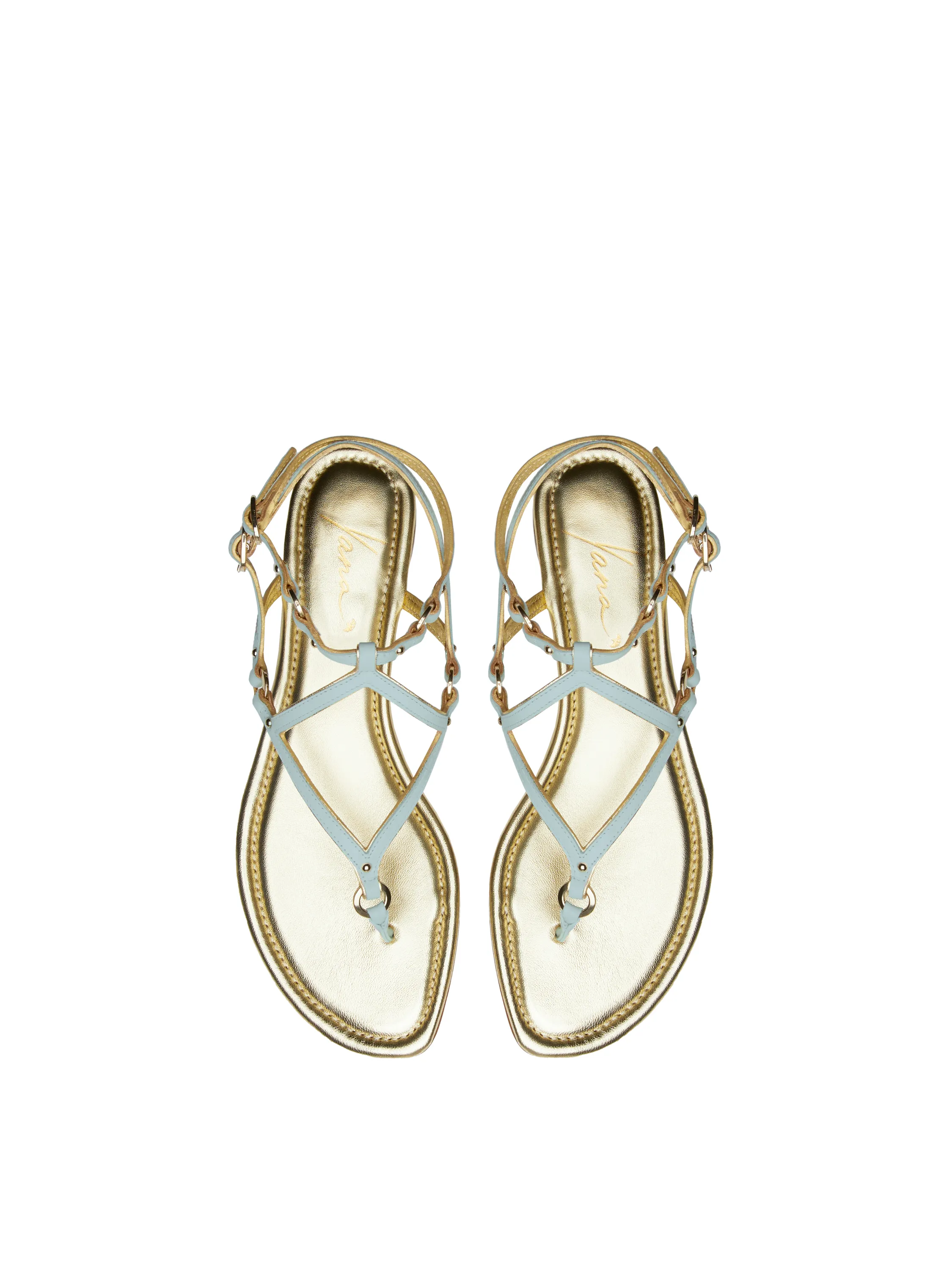 Flat sandals with a toe post are made of genuine leather in light blue and gold tones. This footwear model pairs equally well with dresses and with your favorite jeans by Yana Dress.