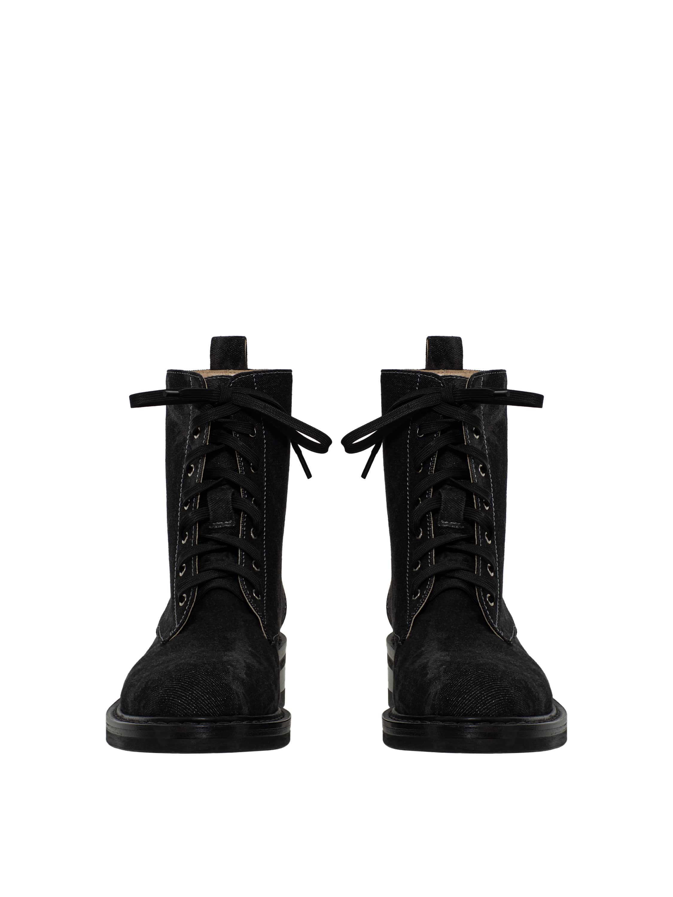 High dark grey boots with a round toe and tone-on-tone lacing are made of genuine leather covered with denim fabric. The thick sole is made of pressed leather and protected by a rubber tread.