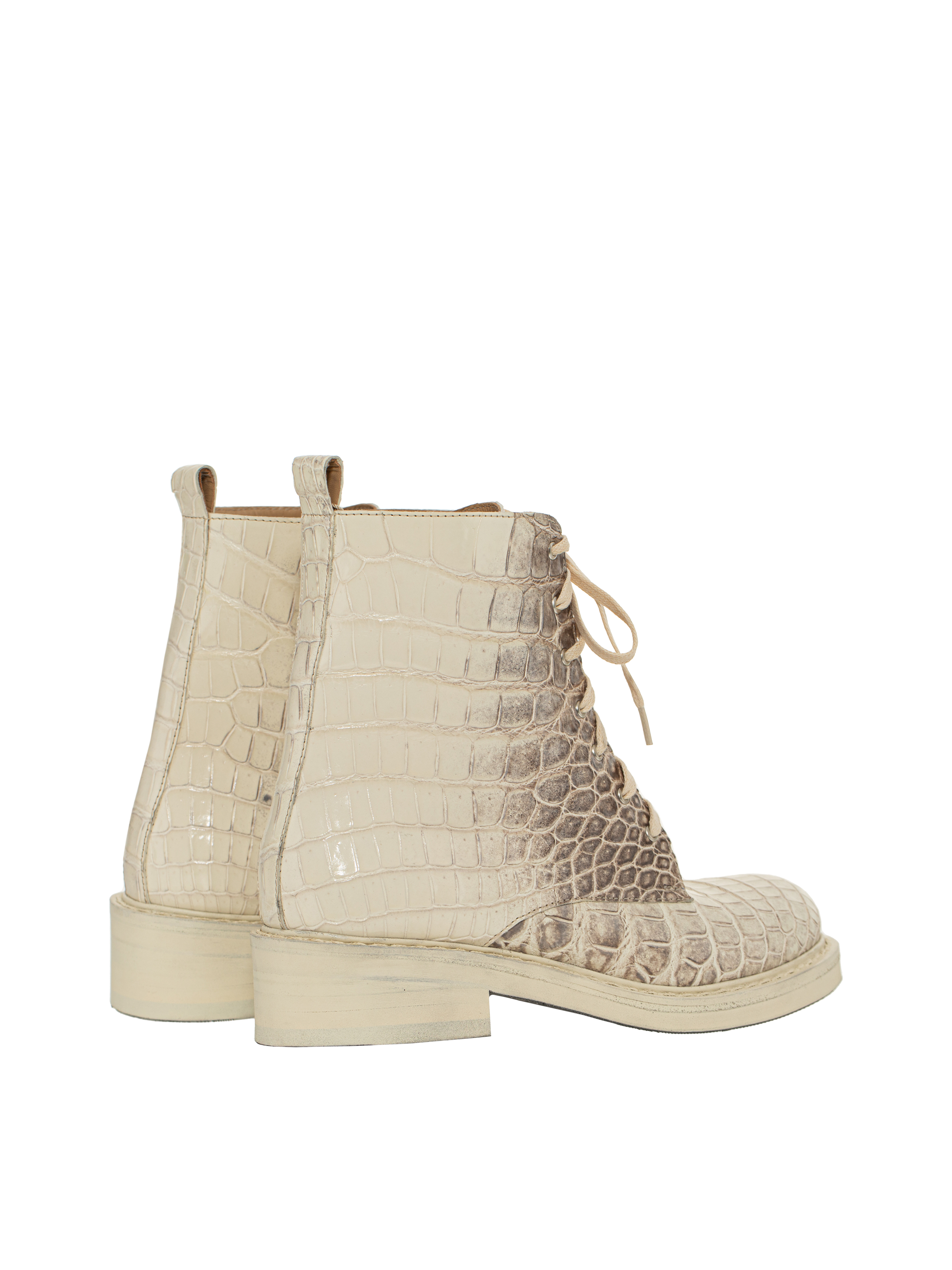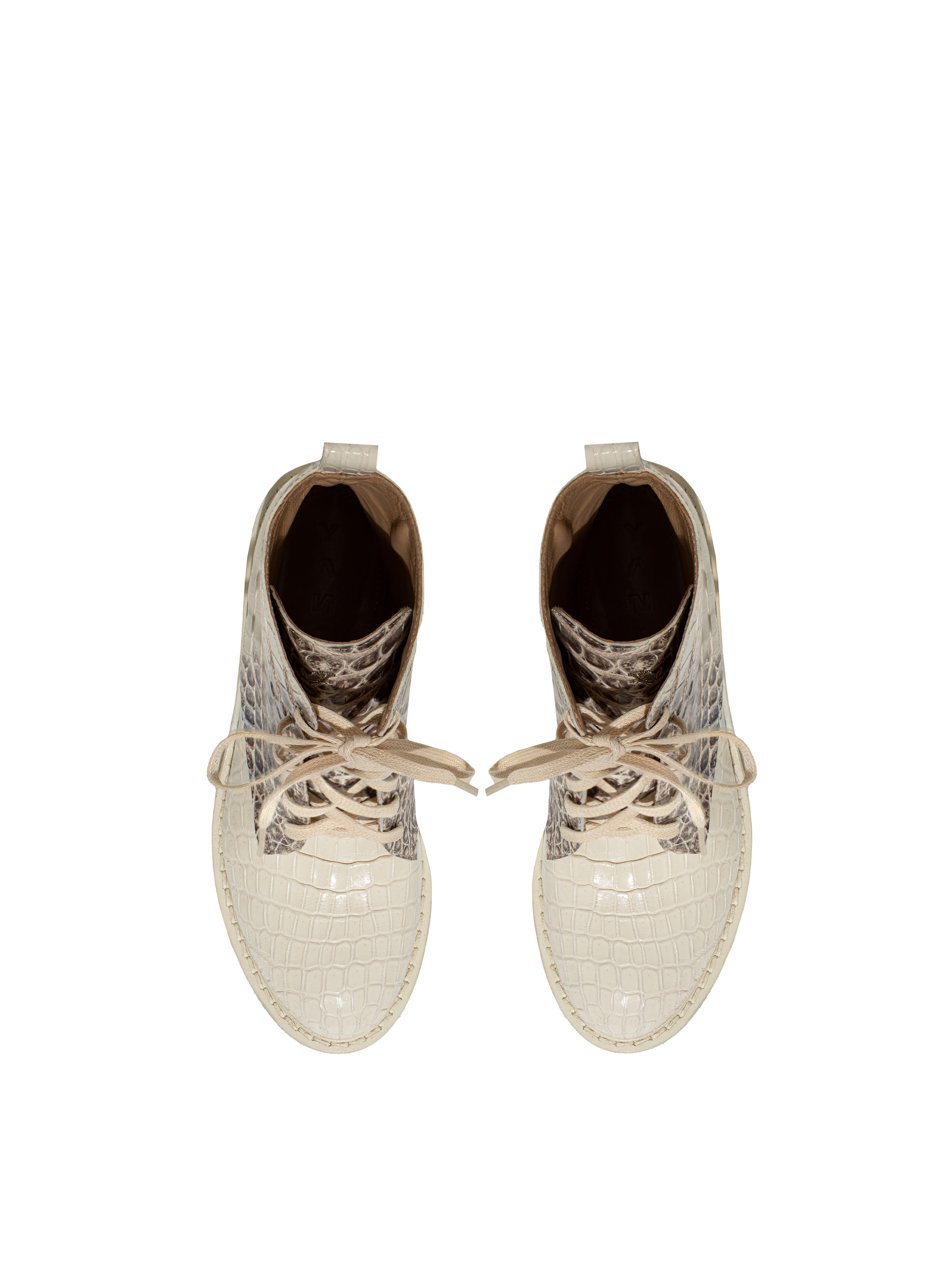 High boots with a round toe and contrasting lacing are made of the rarest Himalayan crocodile leather. The thick sole is made of pressed leather and protected by a rubber tread.