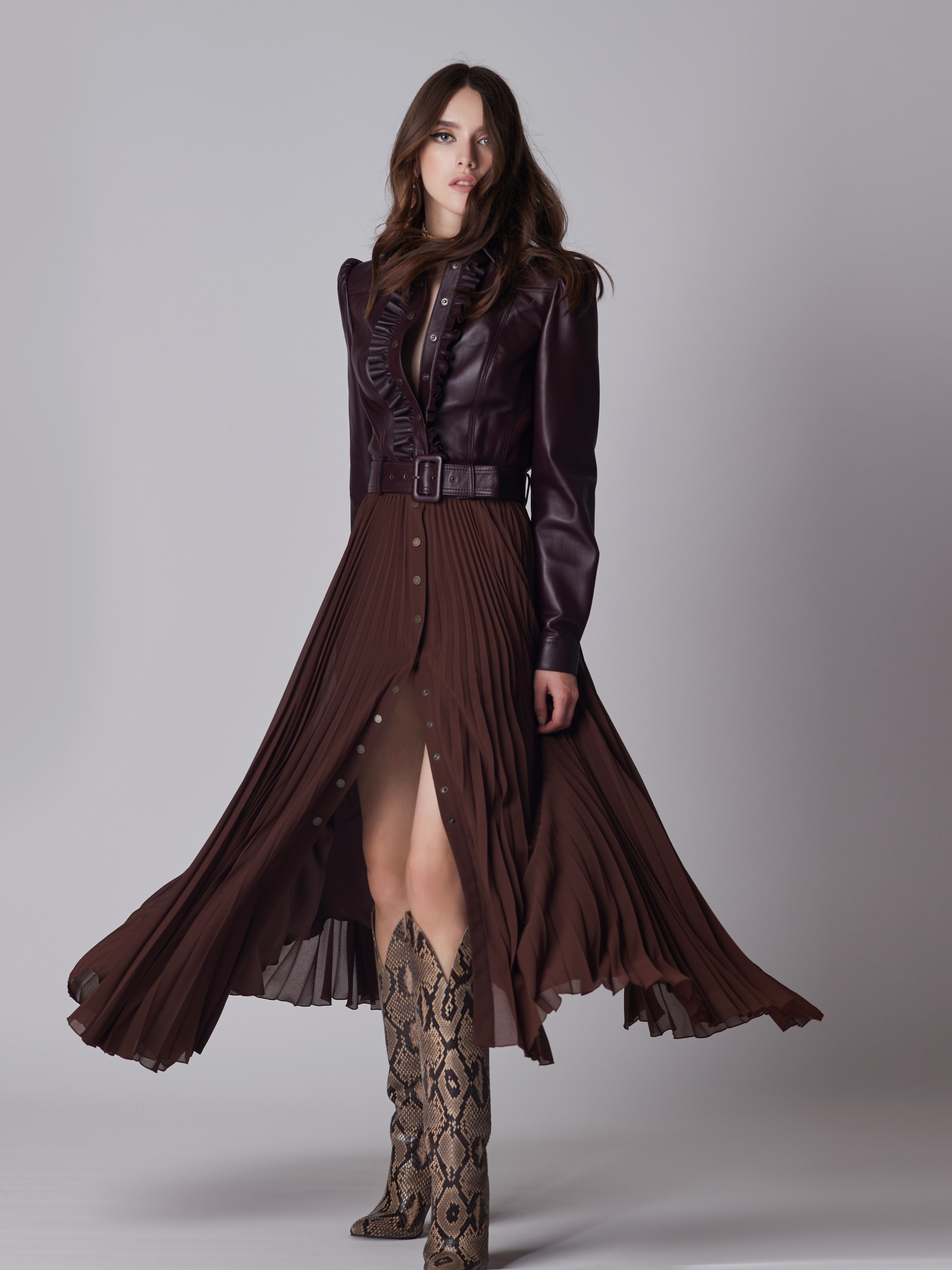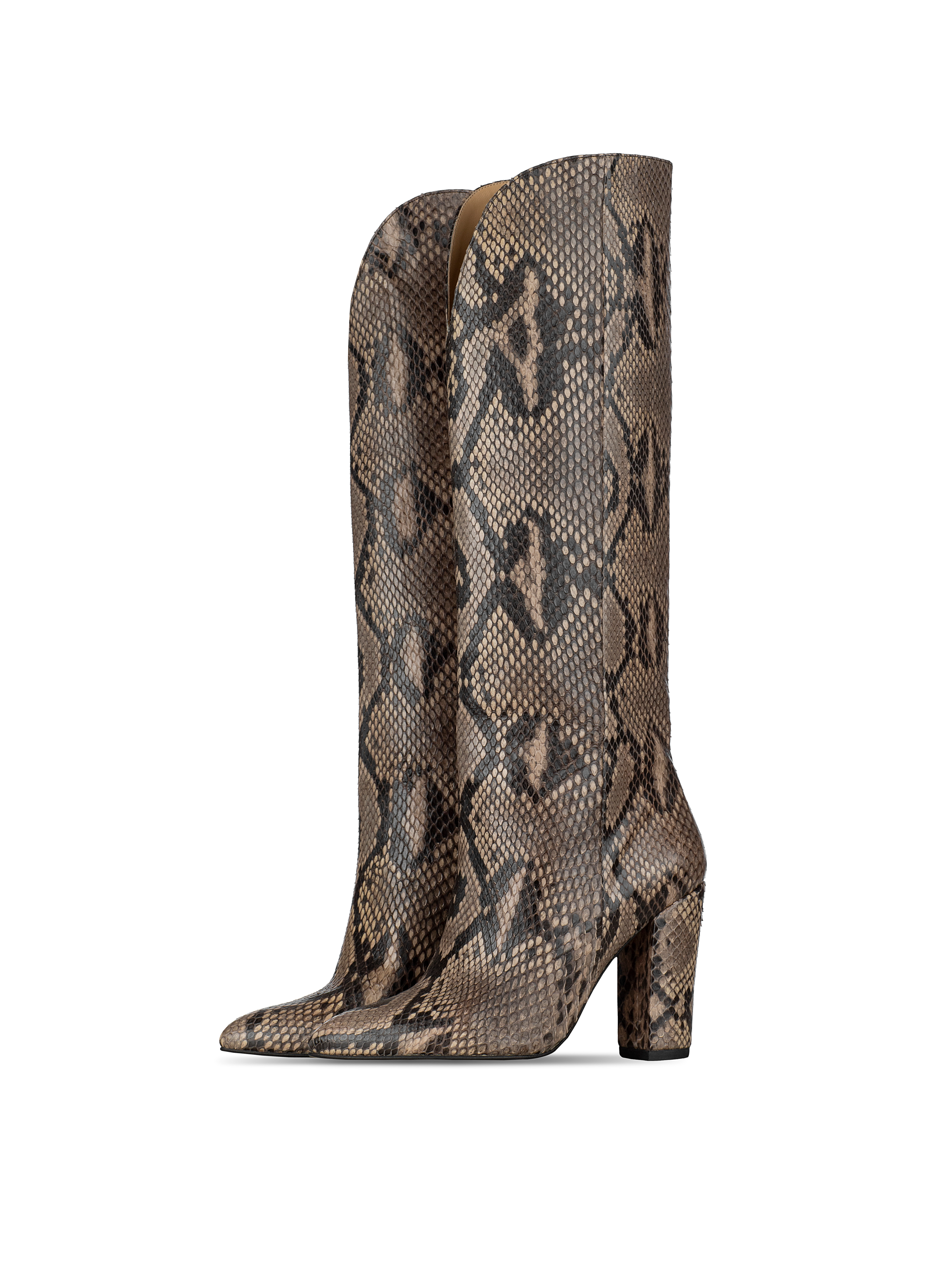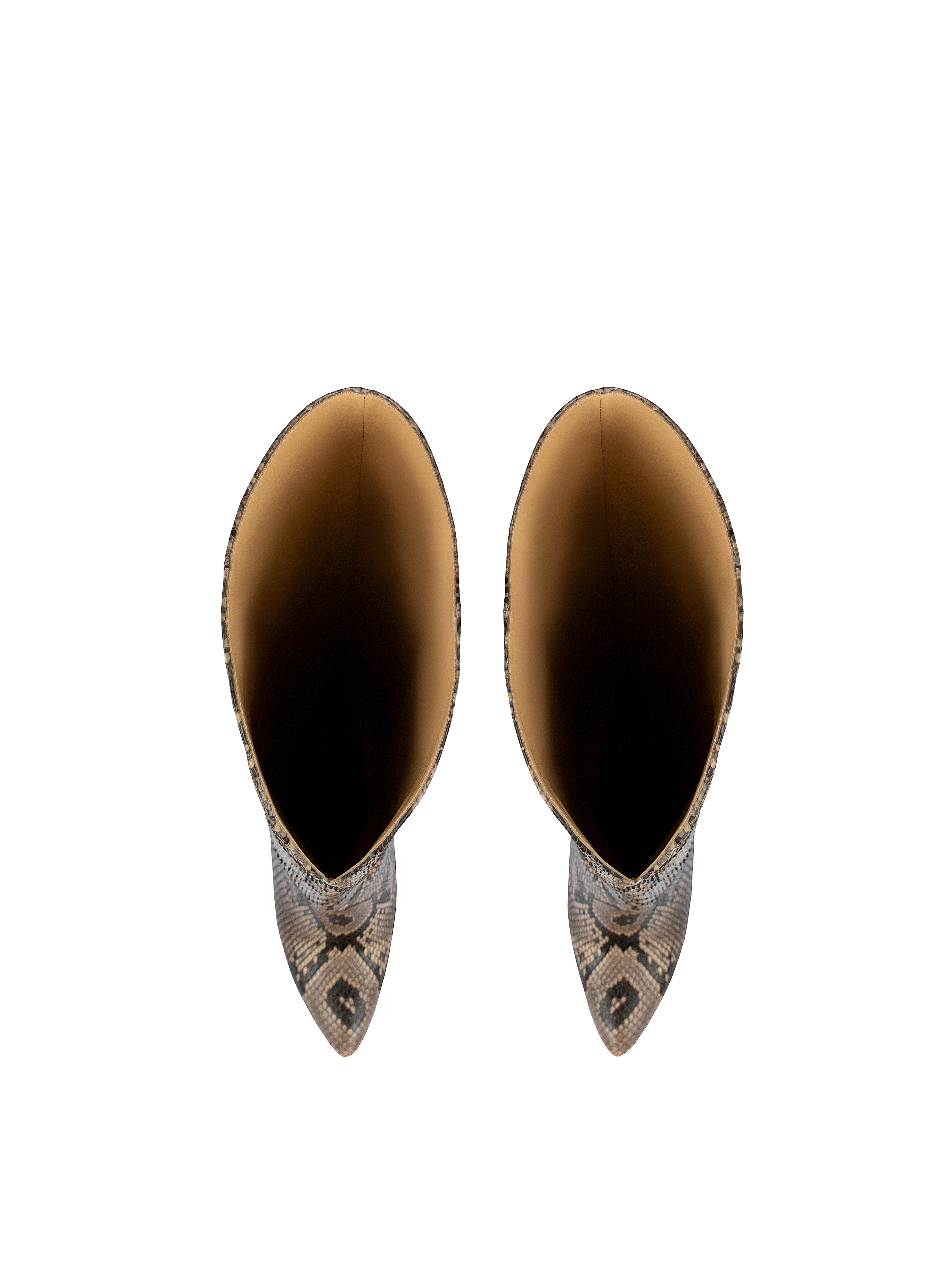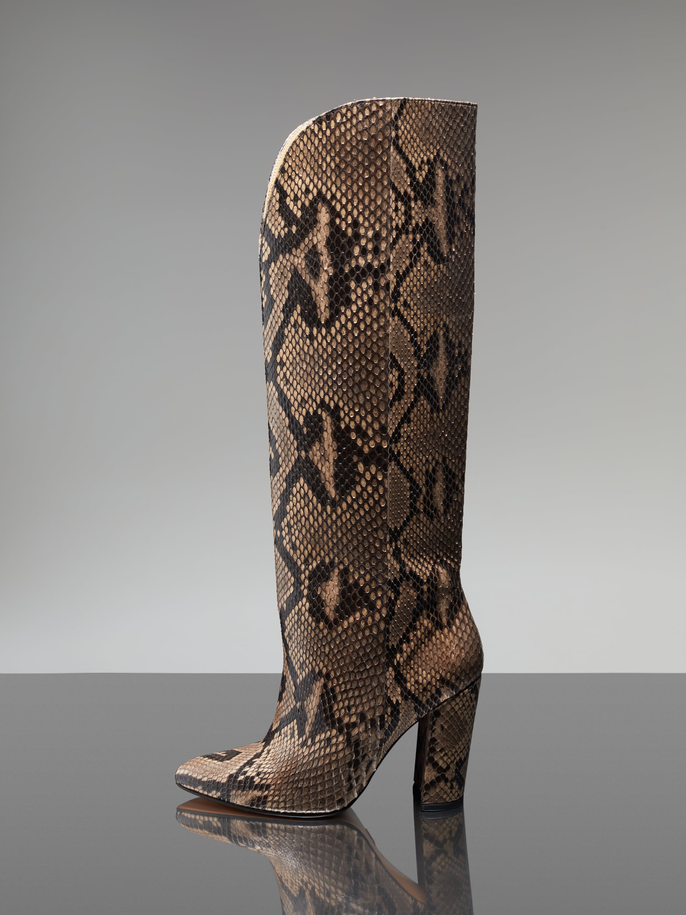 High-heeled boots with a pointed toe will help create a memorable look. Thanks to the wide shaft with a shaped edge, the shoes without zippers are easy to put on and take off. The model is made of grey python leather.