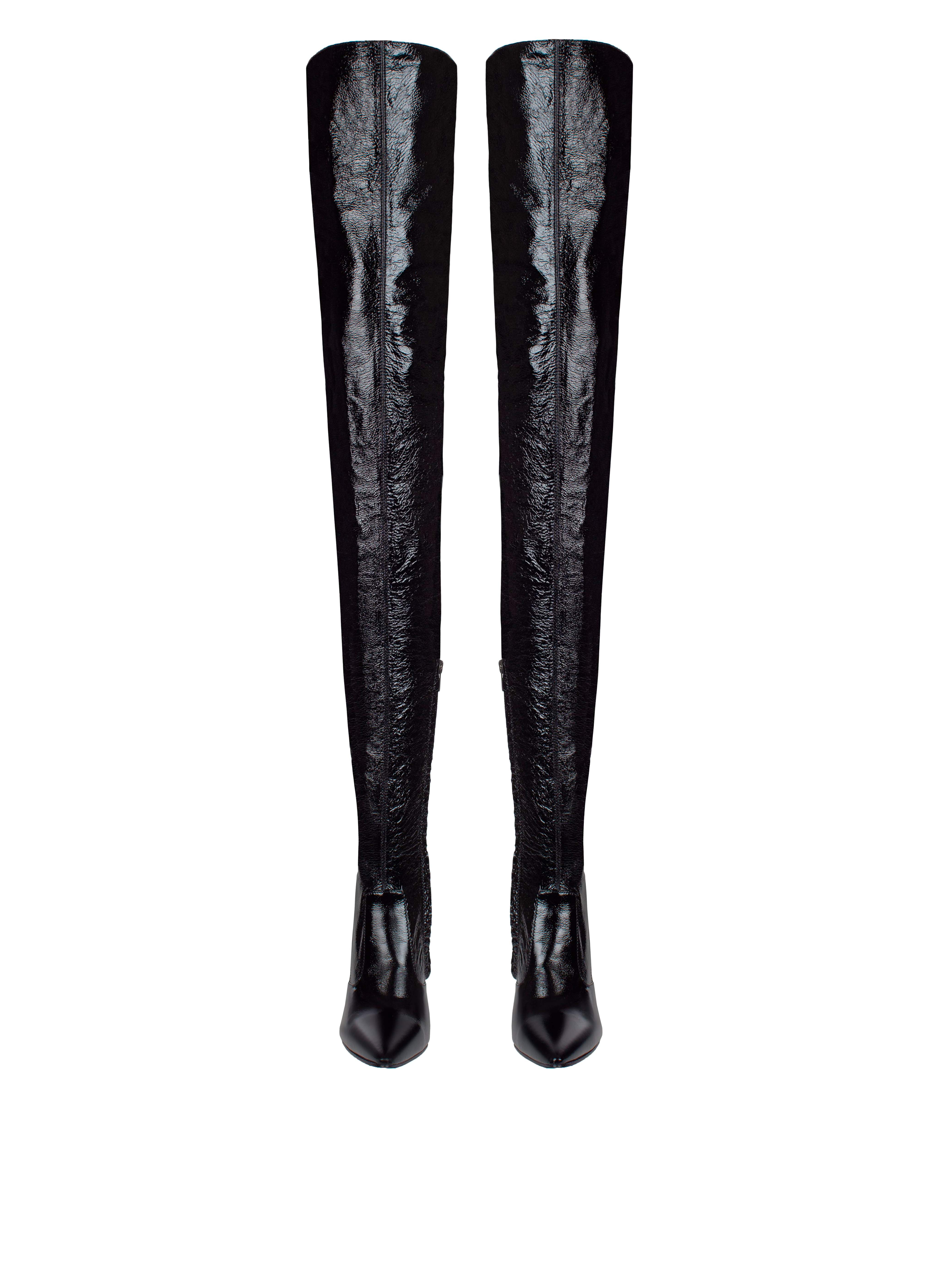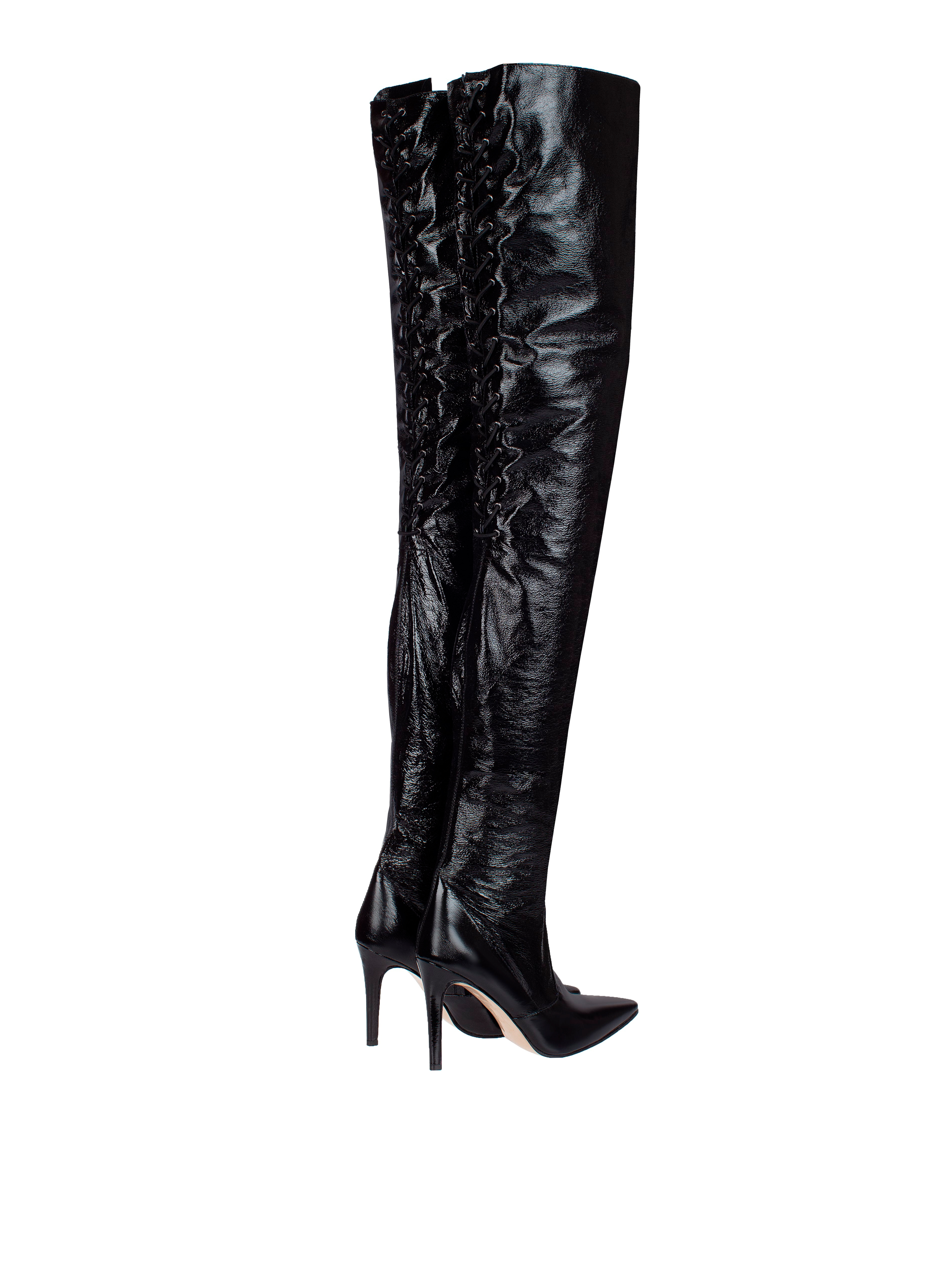 Black over-the-knee boots on a stable stiletto heel will automatically become the main accent of your look. Everything works for the right impression: the refined silhouette with a high heel, the criss-cross lacing, and the glossy patent leather.