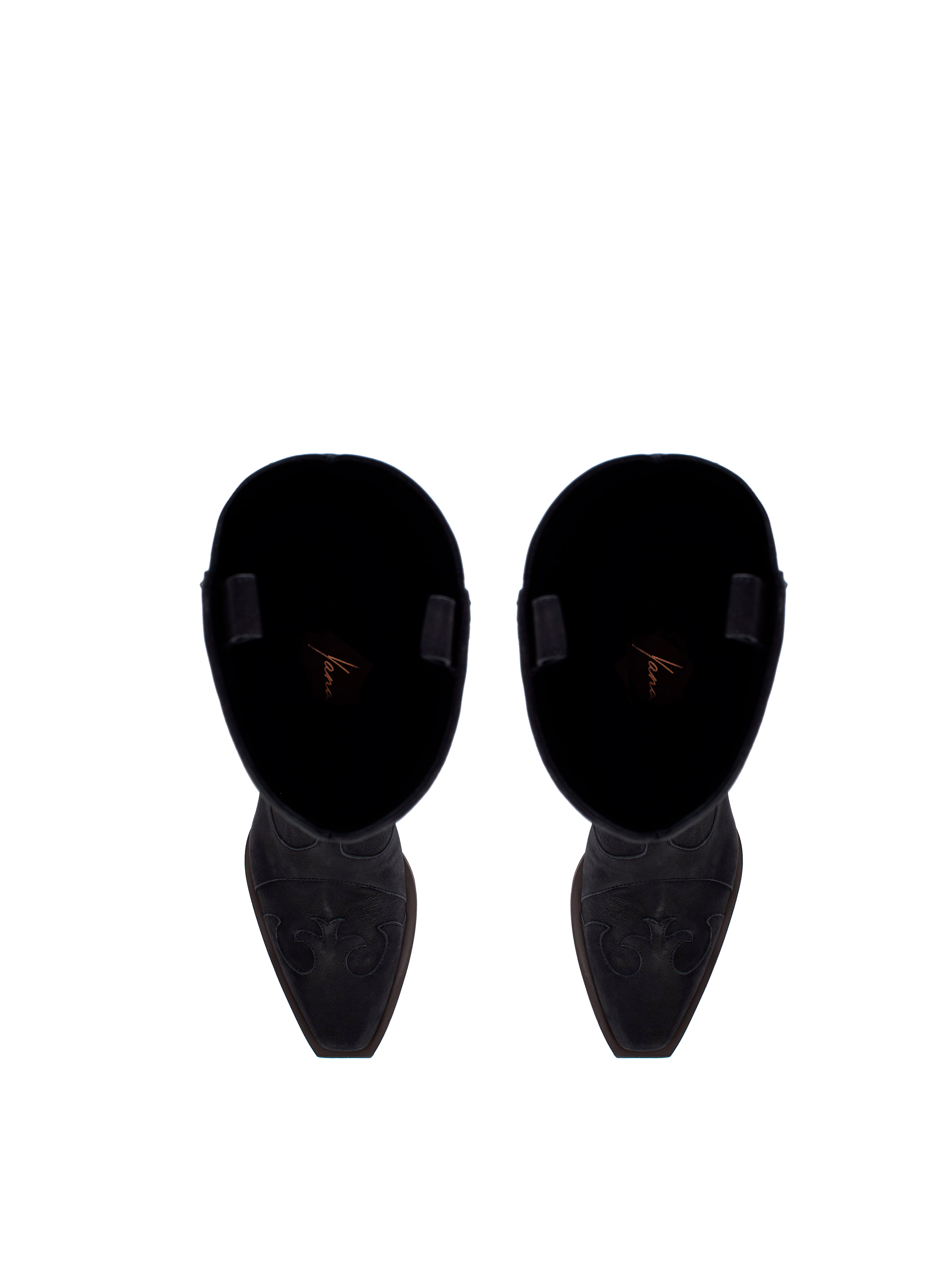 Black cowboy boots are a striking example of versatile footwear that pairs equally harmoniously with both jeans and a dress. The brand’s craftsmen made the model from matte leather with a slightly slanted heel. The boots are complemented with shaped details and a black shiny chain.