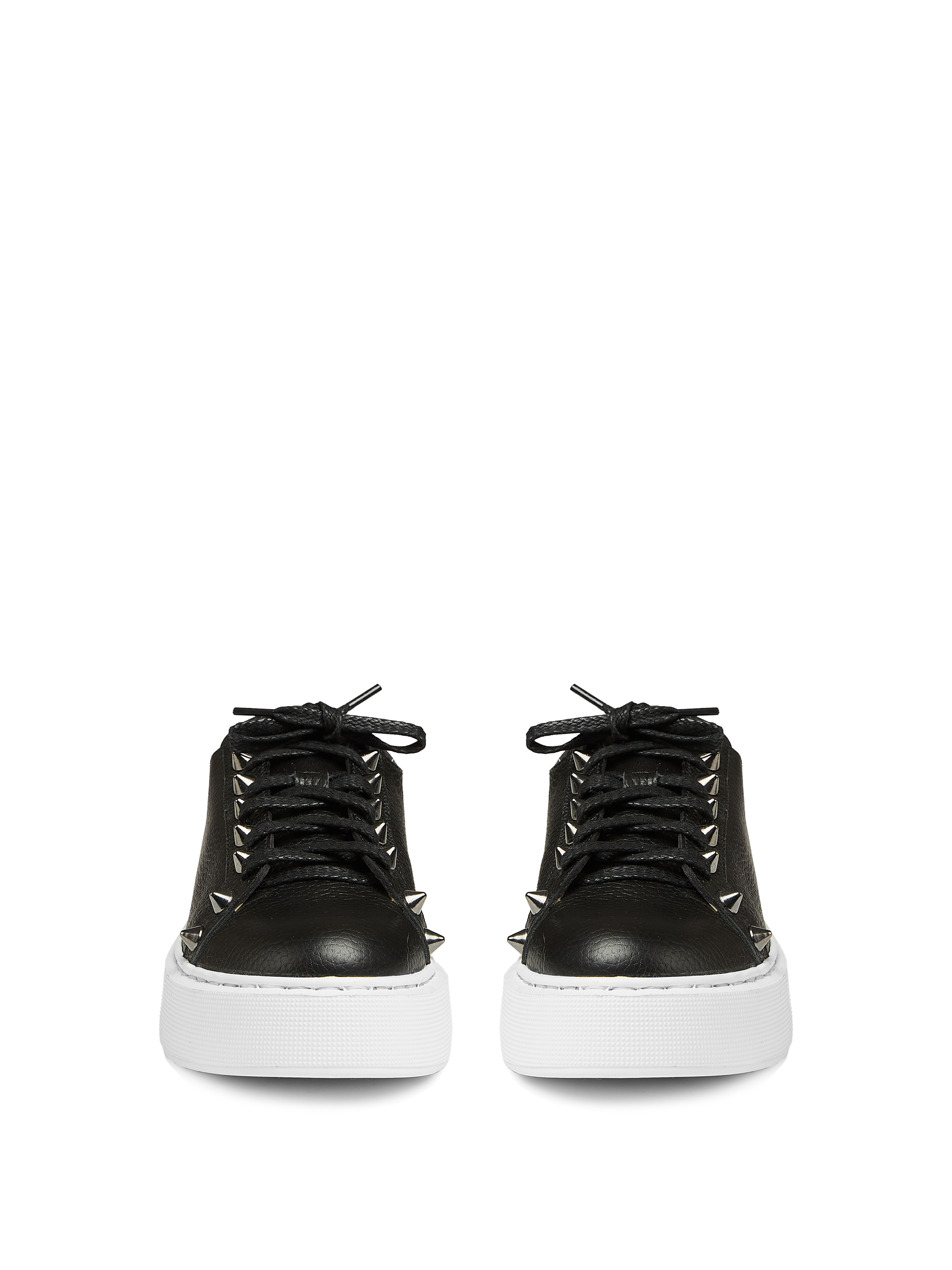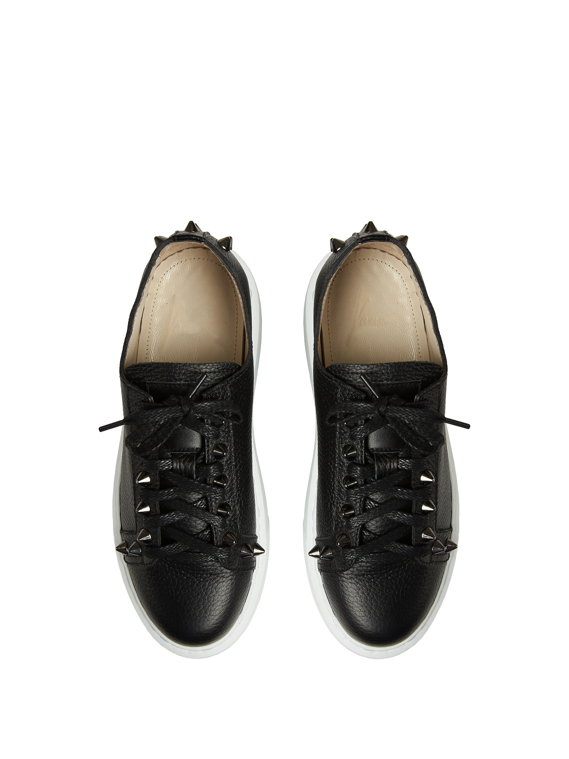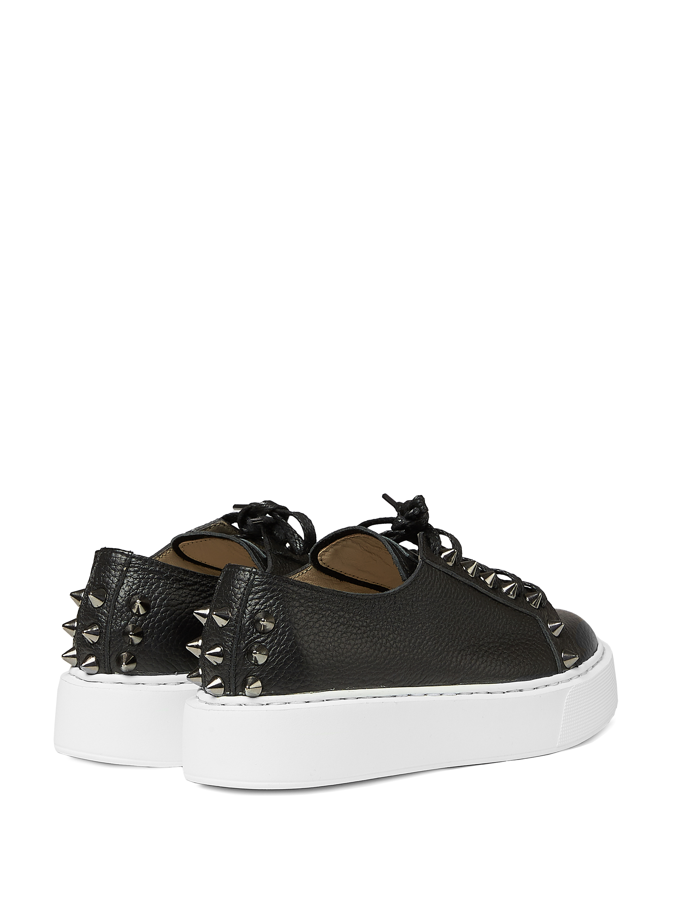 Black low-top lace-up sneakers are made of genuine textured leather. The model with a contrasting wide sole is decorated with studs.